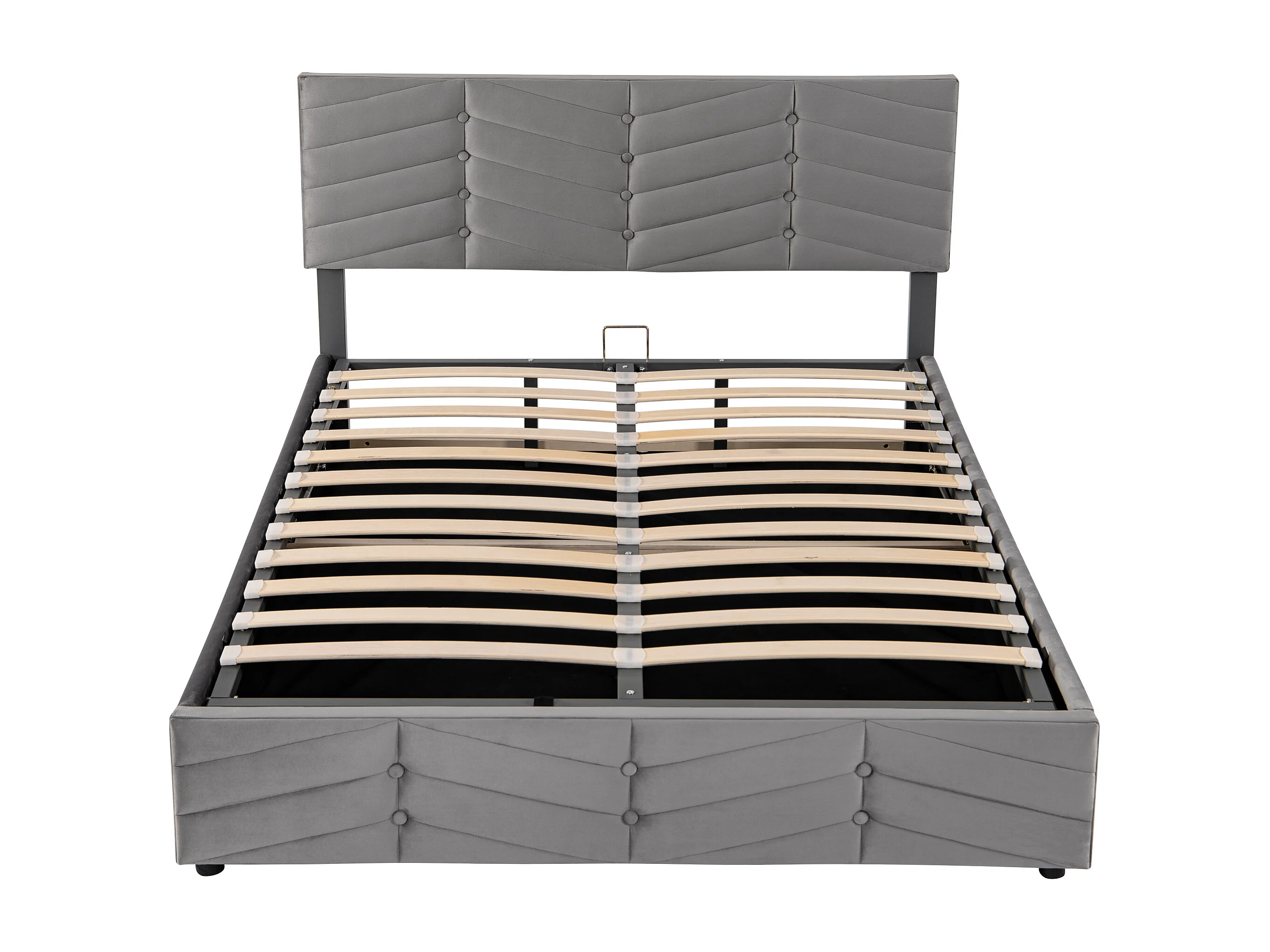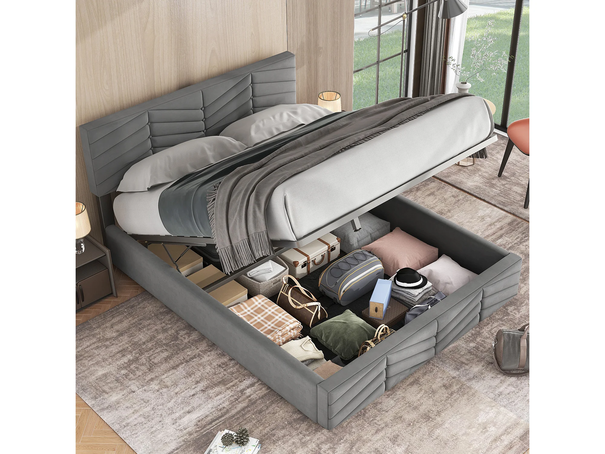 Lit double avec tête de lit réglable, hydraulique, style rayé, velours, gris (140x190 cm)