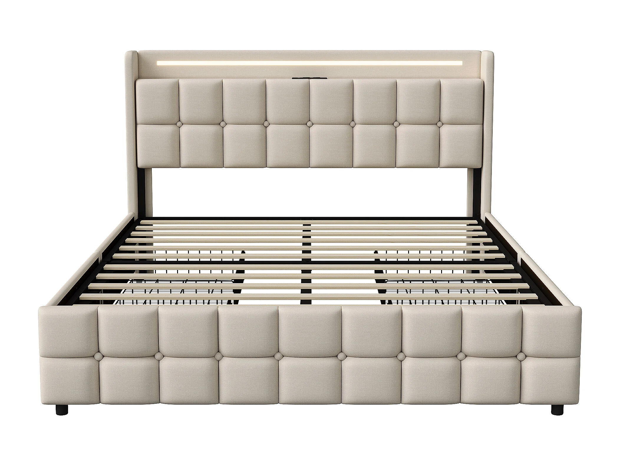 Lit Double avec Tiroirs et Rangement 160x200 - Tissu Lin Beige - Éclairage LED, Ports USB et Prises - 300 kg - Moderne et Design