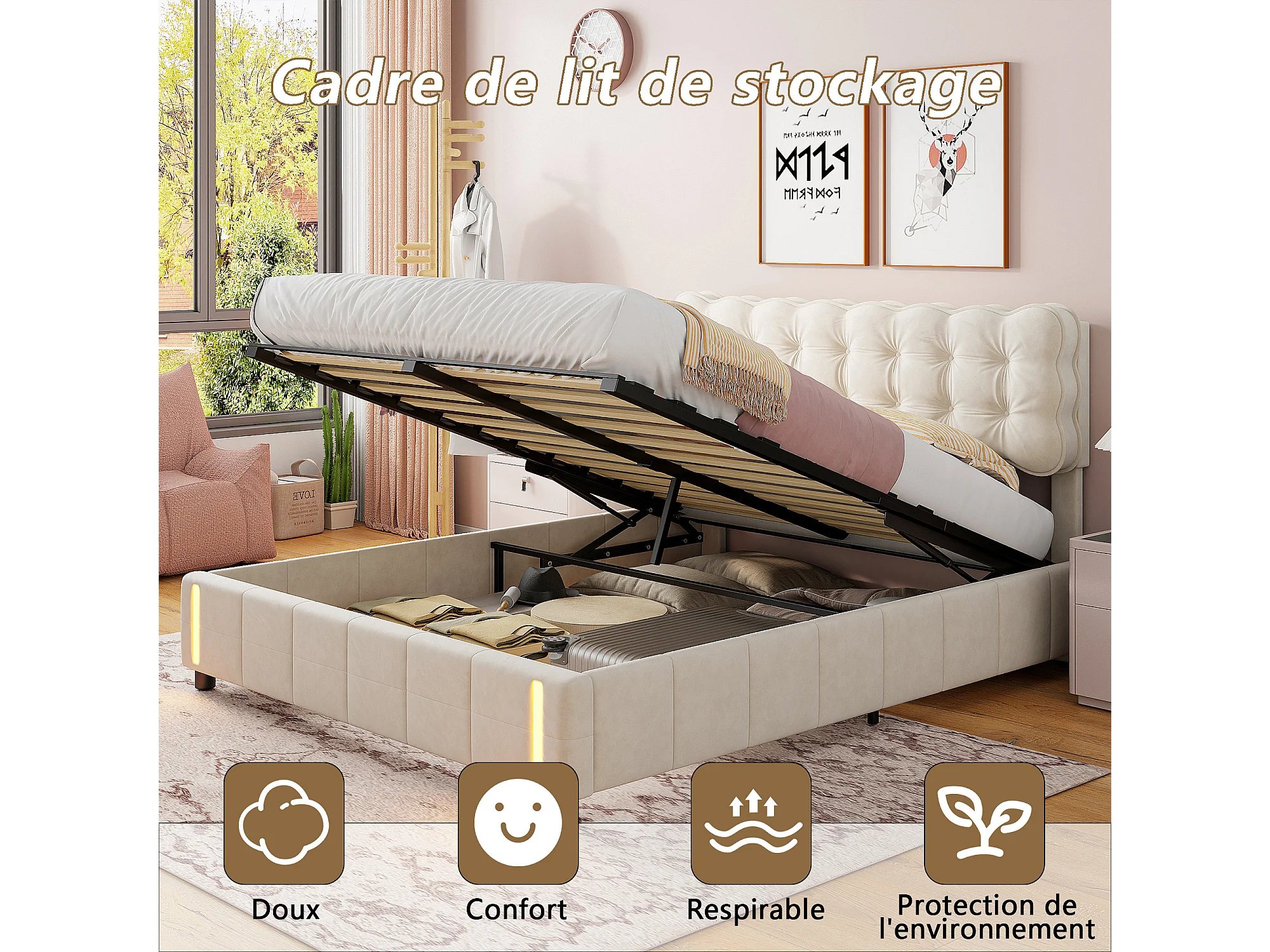 Lit Double capitonné 140x190 cm, Lit Coffre avec Rangement et sommier à Lattes, LED, Velours, Beige