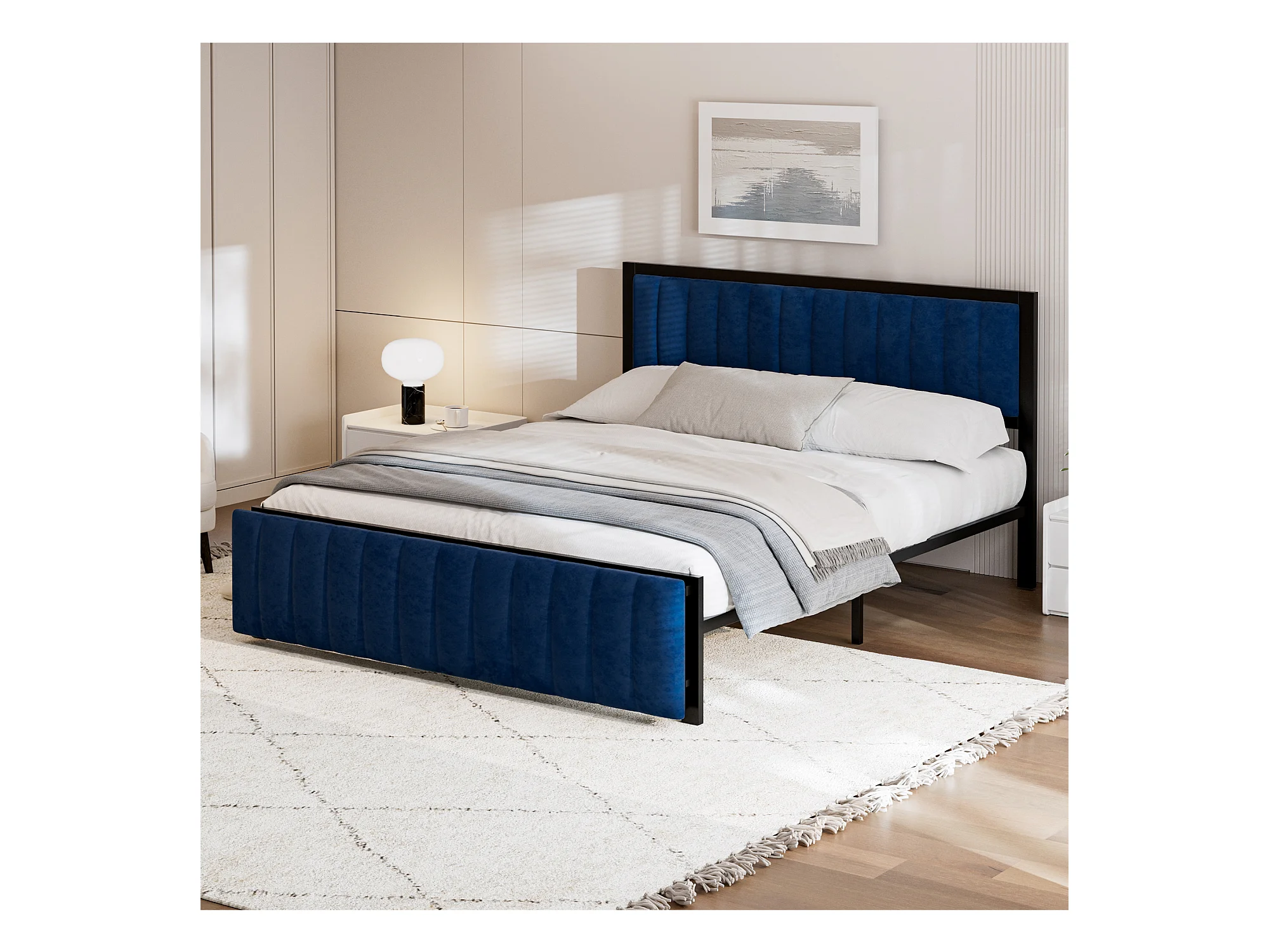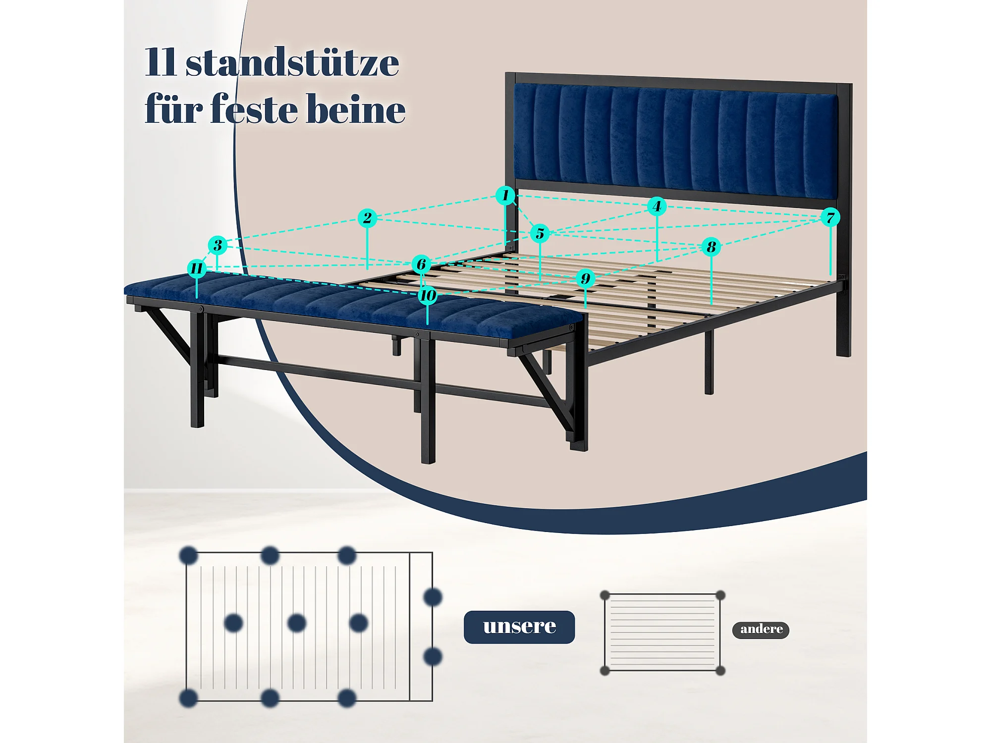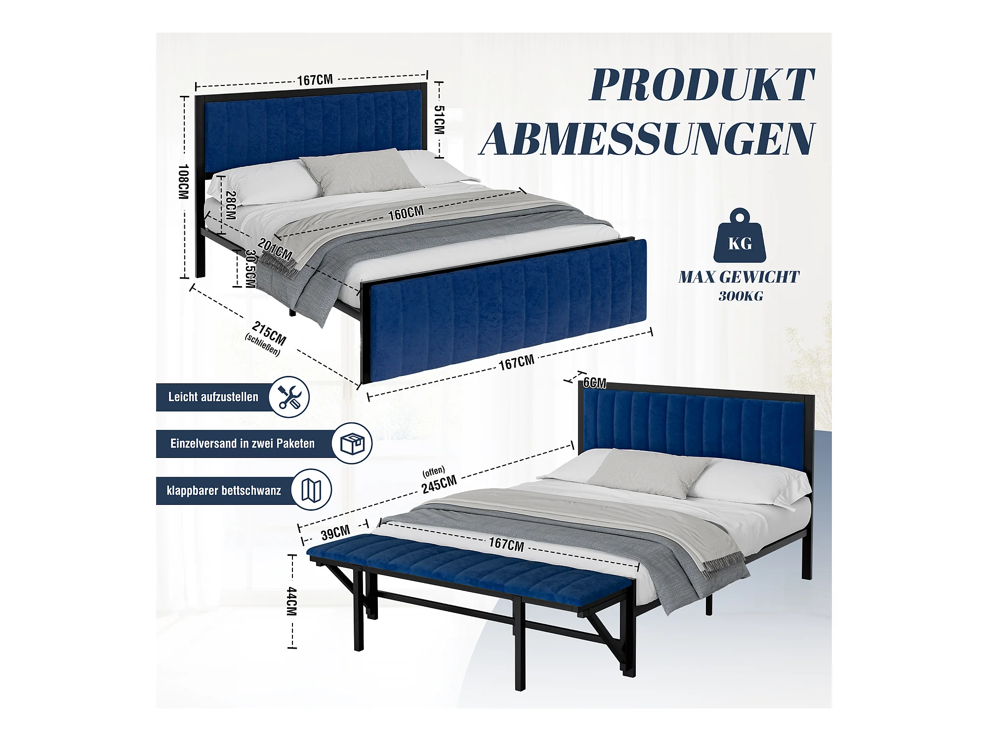 Lit double capitonné 160x200 cm, avec banquette d'extrémité (rabattable), avec espace de rangement et organisation, velours,blue