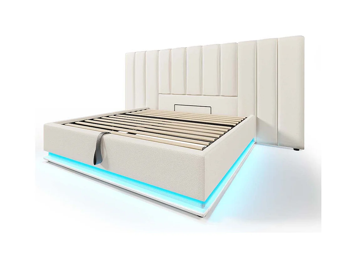Lit double capitonné 180 x 200 avec app control LED et chargement USB-C, PU, blanc, sans tête de lit.
