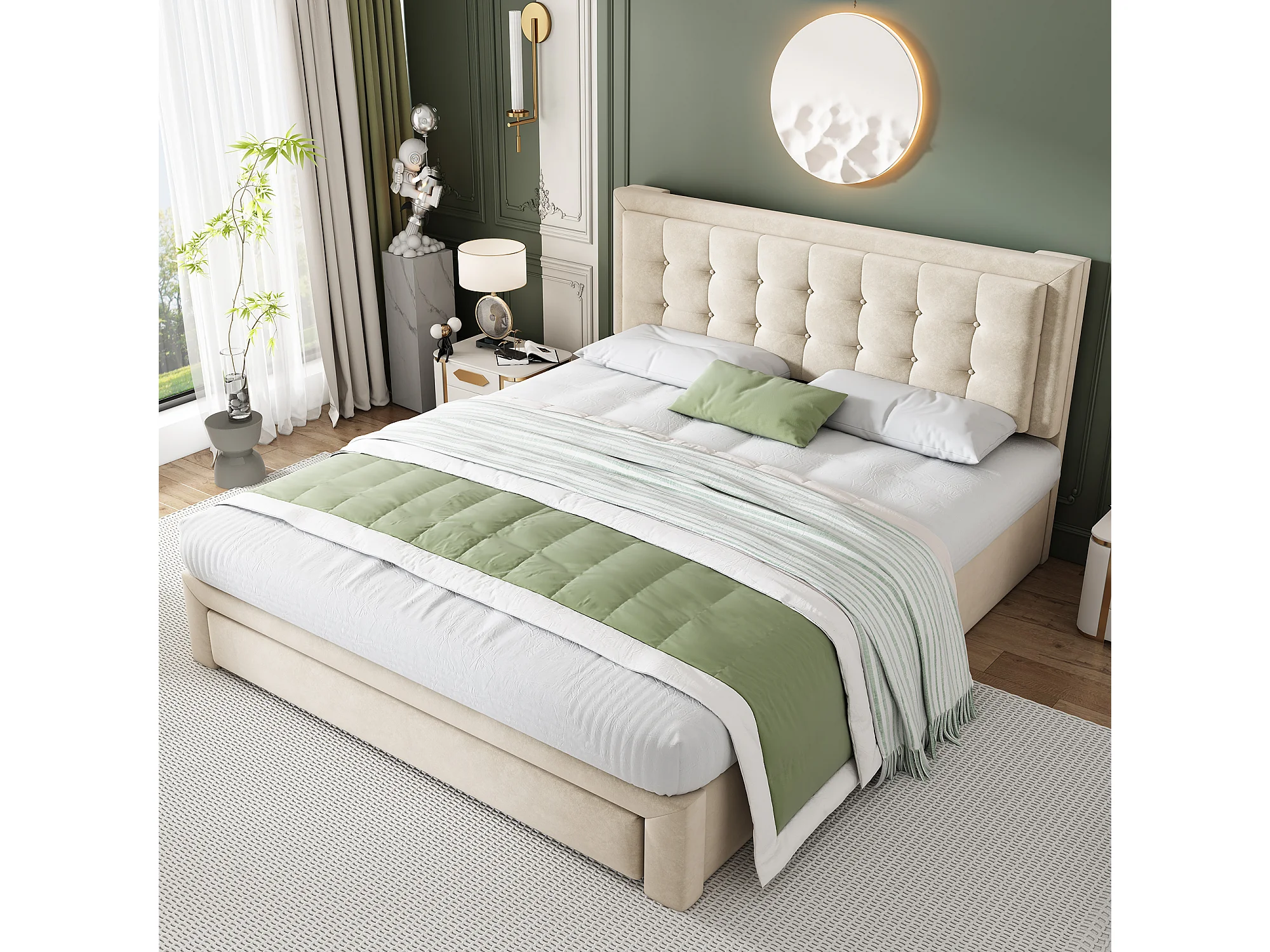 Lit Double Capitonné 180 X 200 cm - Coffre et Tiroirs - Sommier À Lattes - Grand Rangement - Velours - Beige