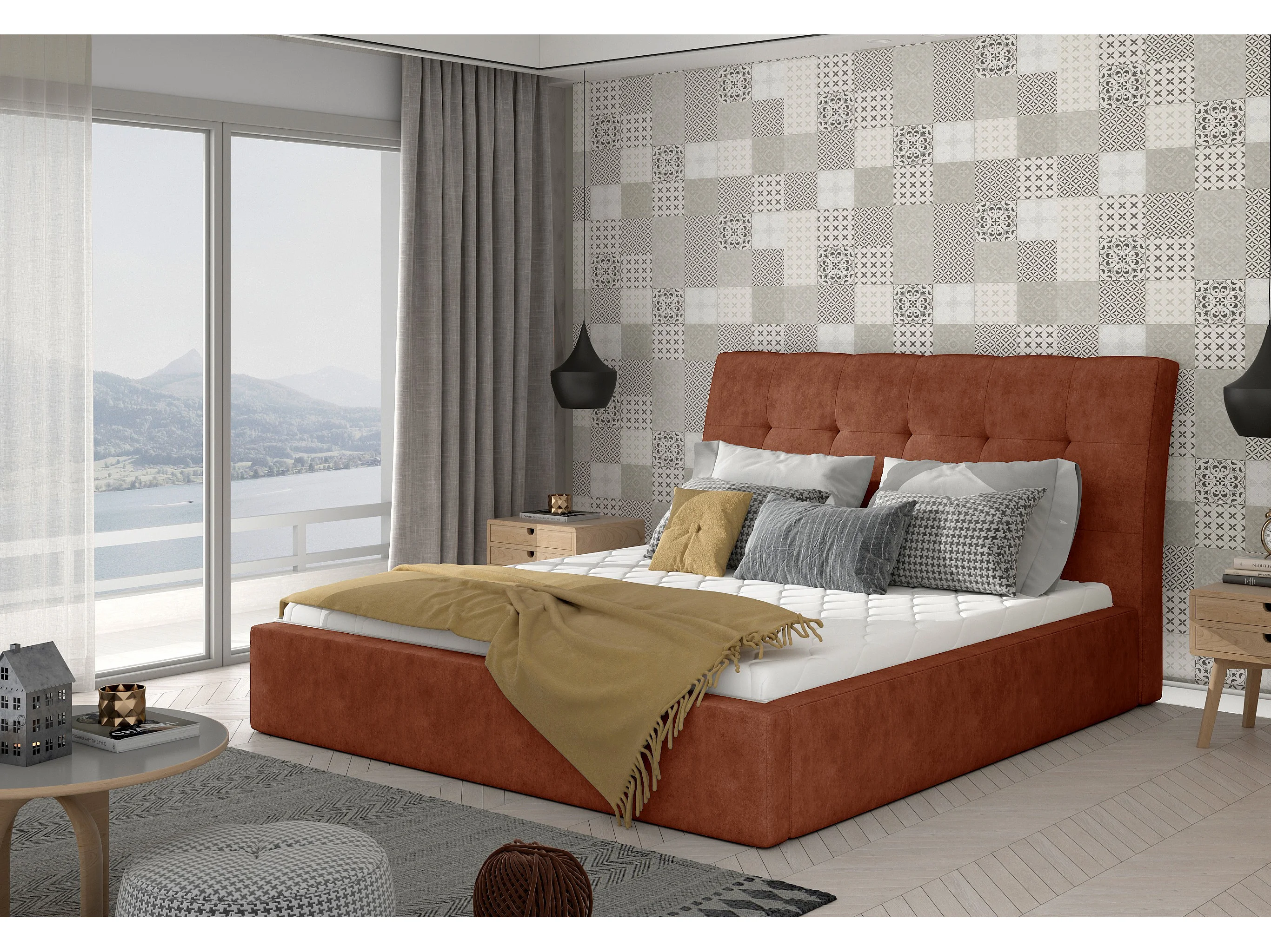 Lit double capitonné tissu rouge brique Klein - 4 tailles-160x200