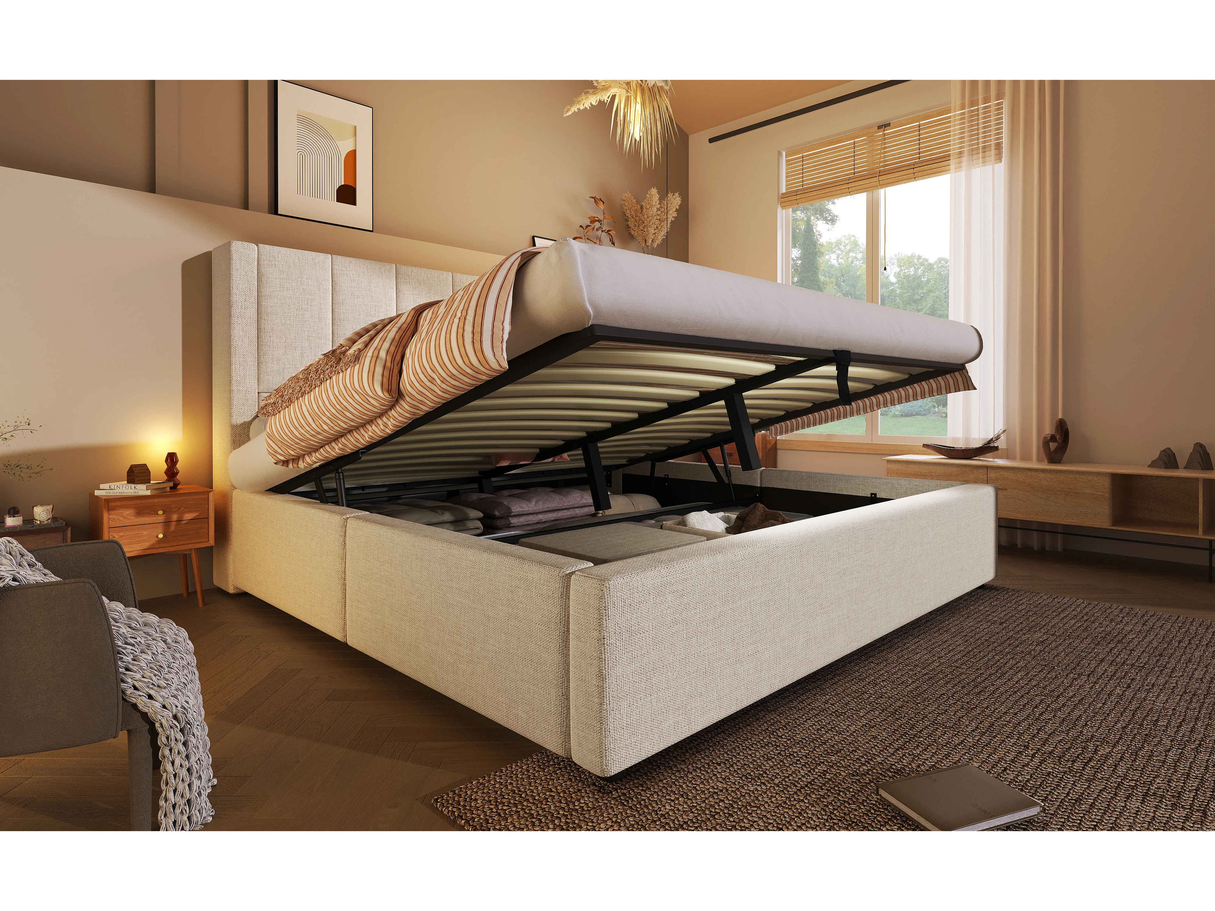 Lit double coffre 160x200 cm avec porte-gobelet et 3 USB ,1 Type-C - Lin beige