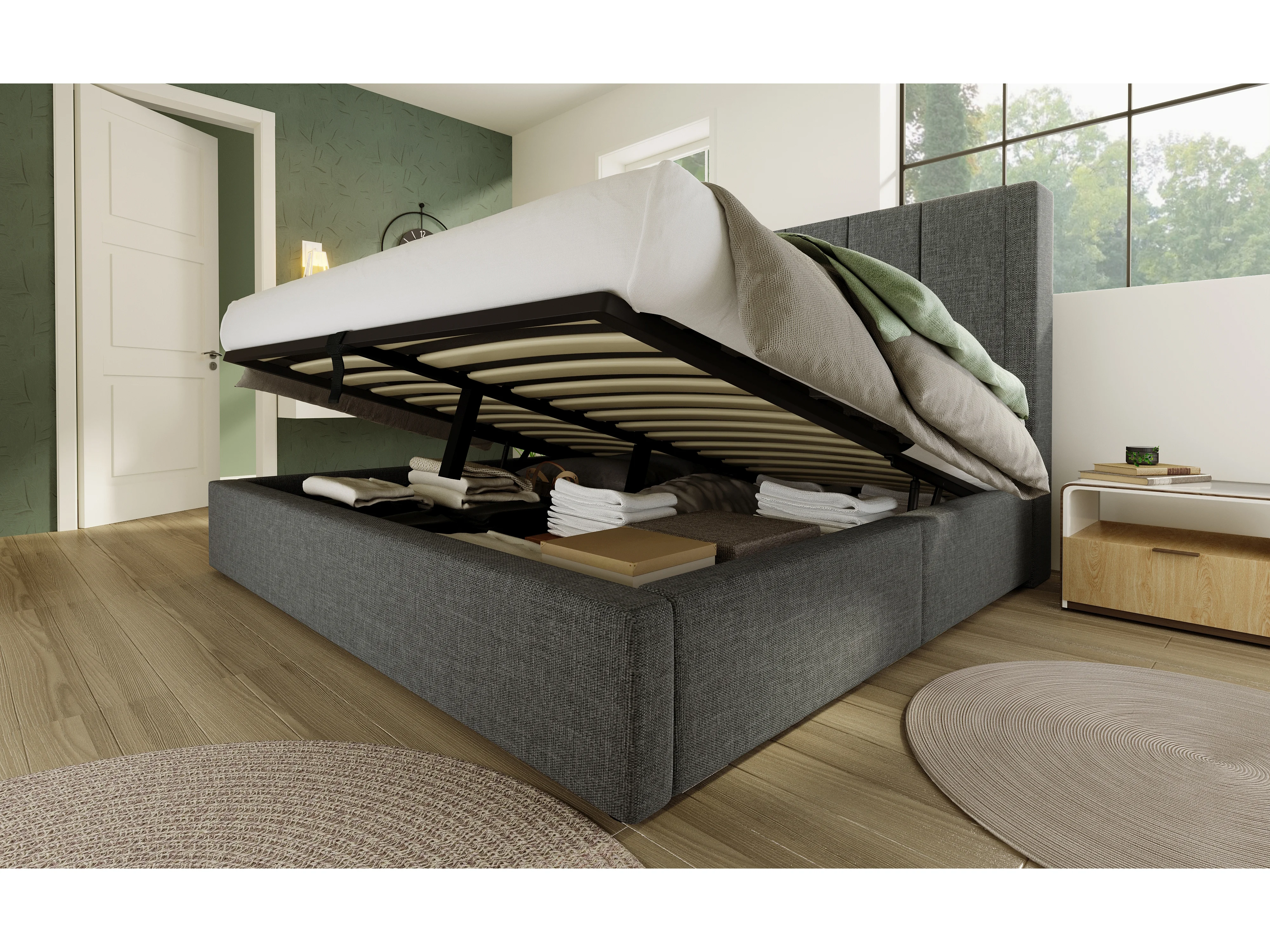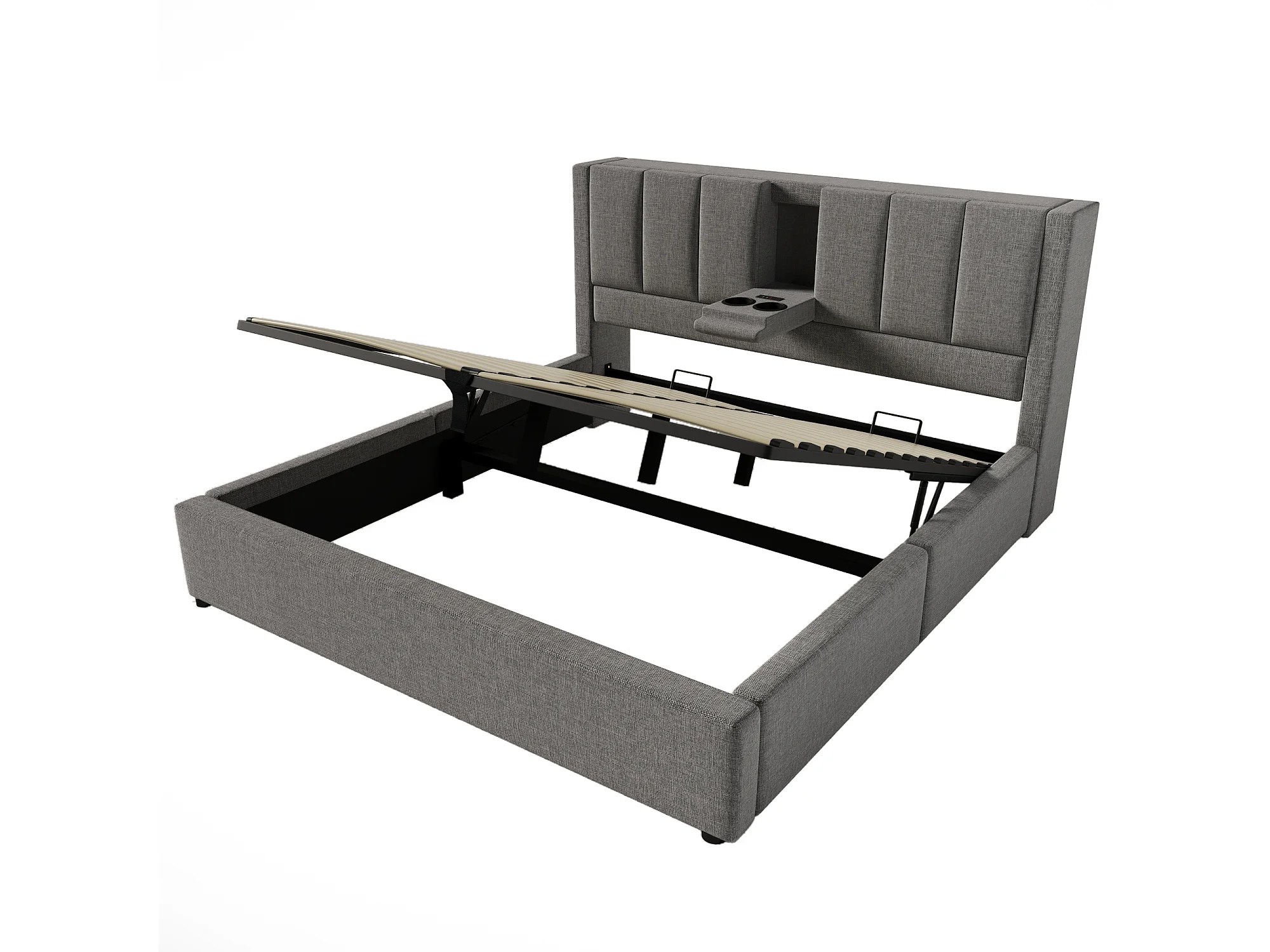 Lit double coffre 180x200 cm avec porte-gobelet et 3 USB ,1 Type-C - Lit adulte en lin gris
