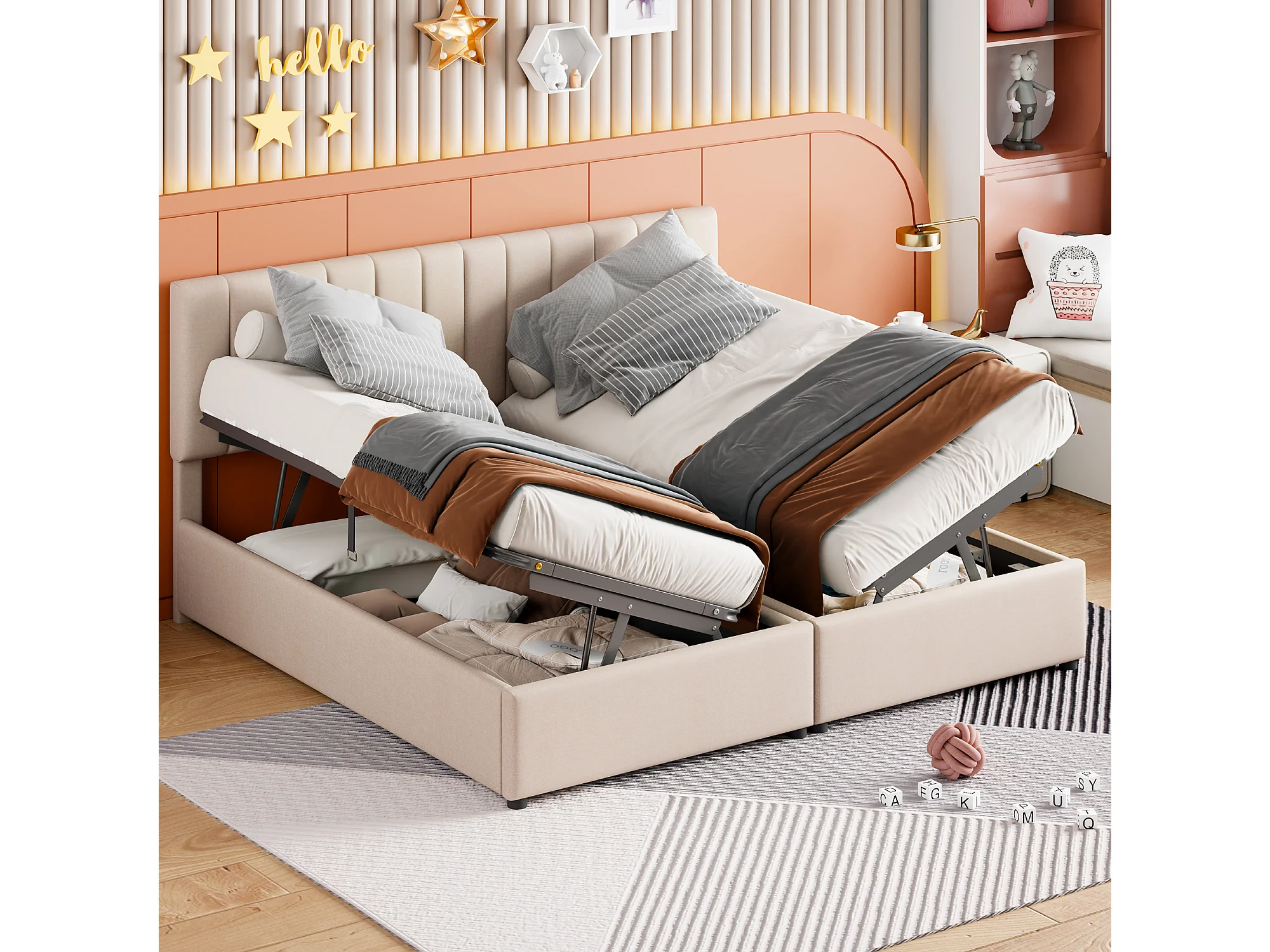 Lit double coffre adulte 180x200cm convertible en lit enfant 2 x 90x 200cm - Tissu lin beige