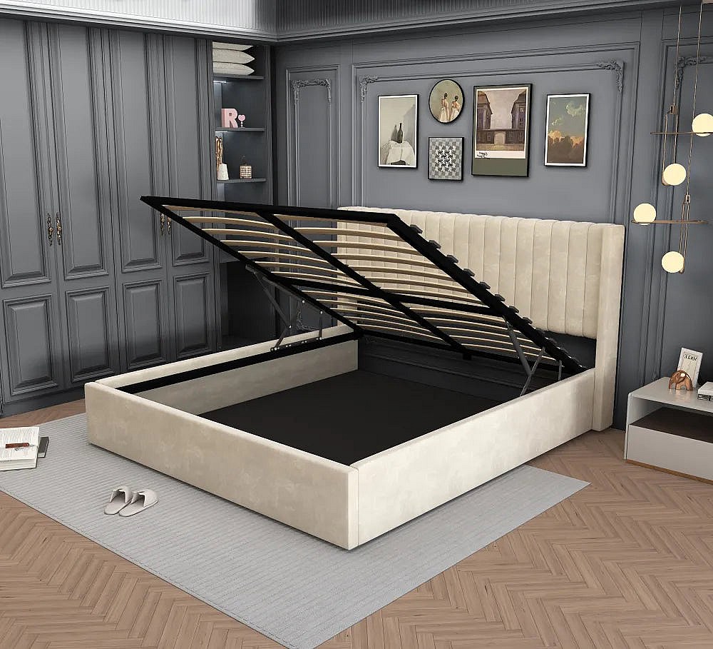 LIT DOUBLE COFFRE BEIGE CAMILLE BEIGE en velours 180X200CM