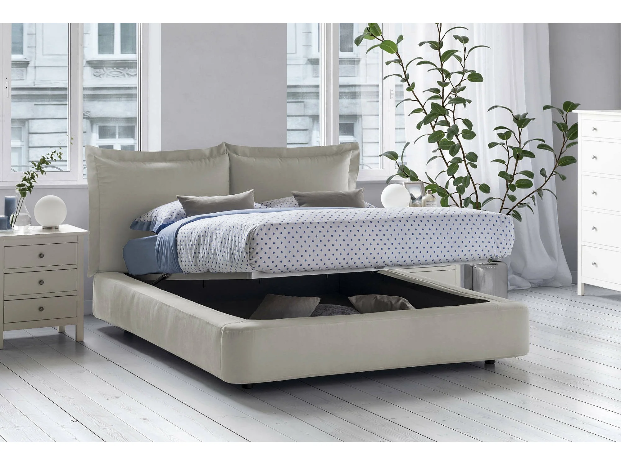 Lit double Cornelia, Lit coffre avec revêtement en tissu, 100% Made in Italy, Ouverture frontale, adapté pour matelas 160x190 cm, Beige