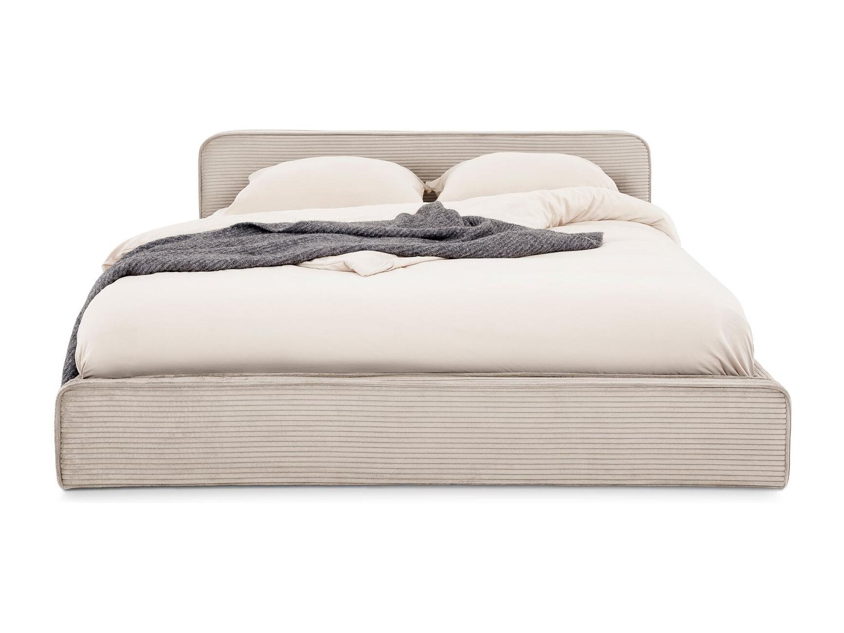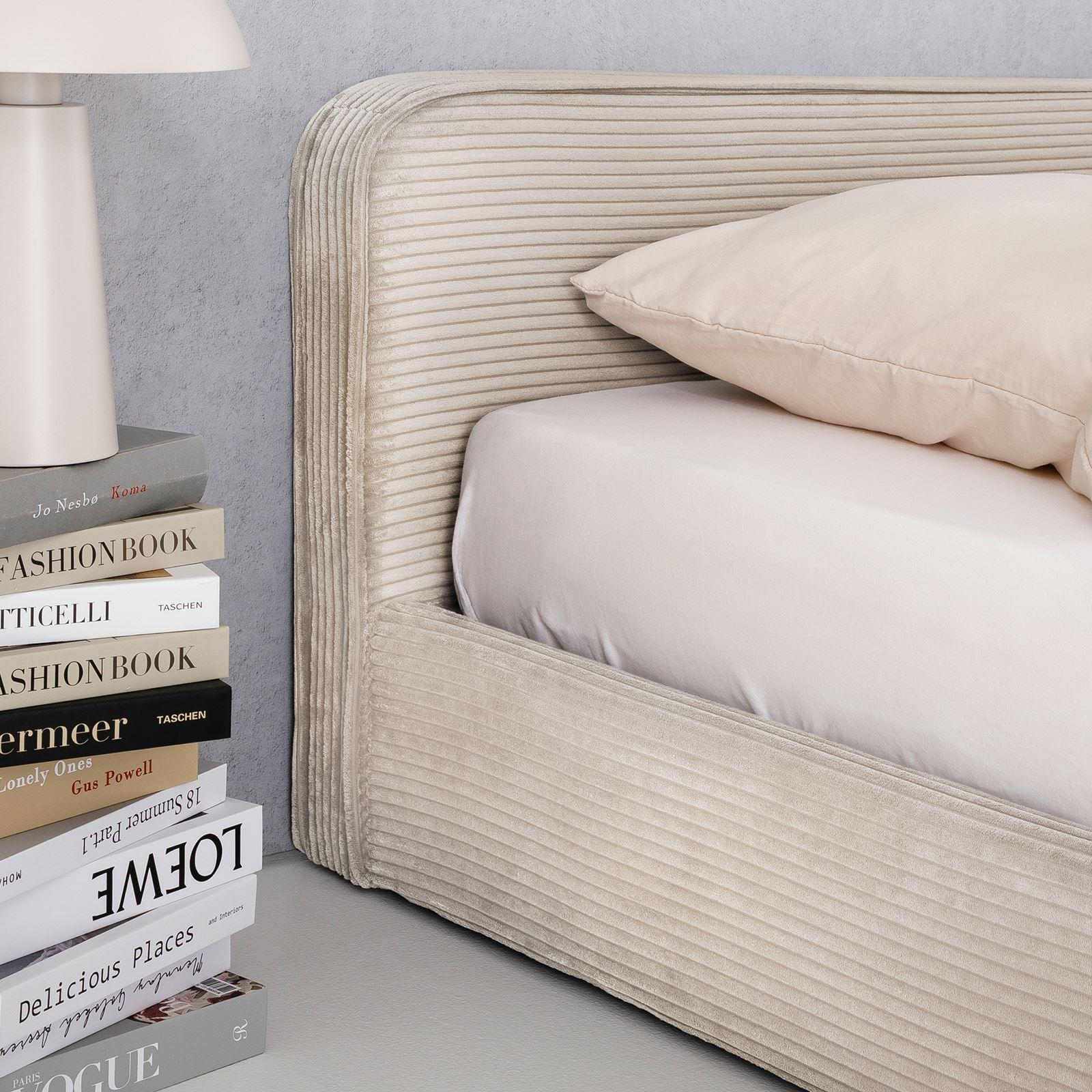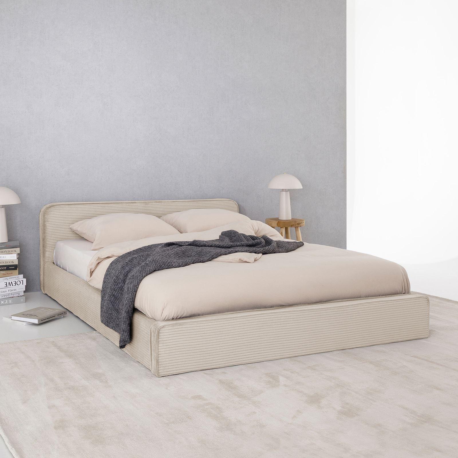 Lit double CURSIO 140x190 cm, Revêtement en tissu velours côtelé Beige, Lit 2 personnes, Cadre de lit en bois avec sommier