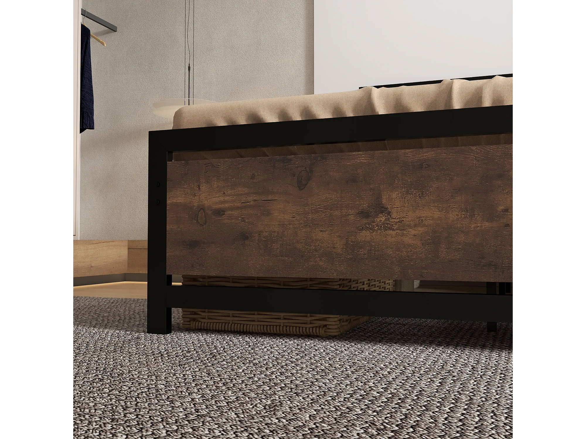Lit double design industriel - tête de lit, pied de lit et sommier - acier noir MDF aspect bois avec veinage