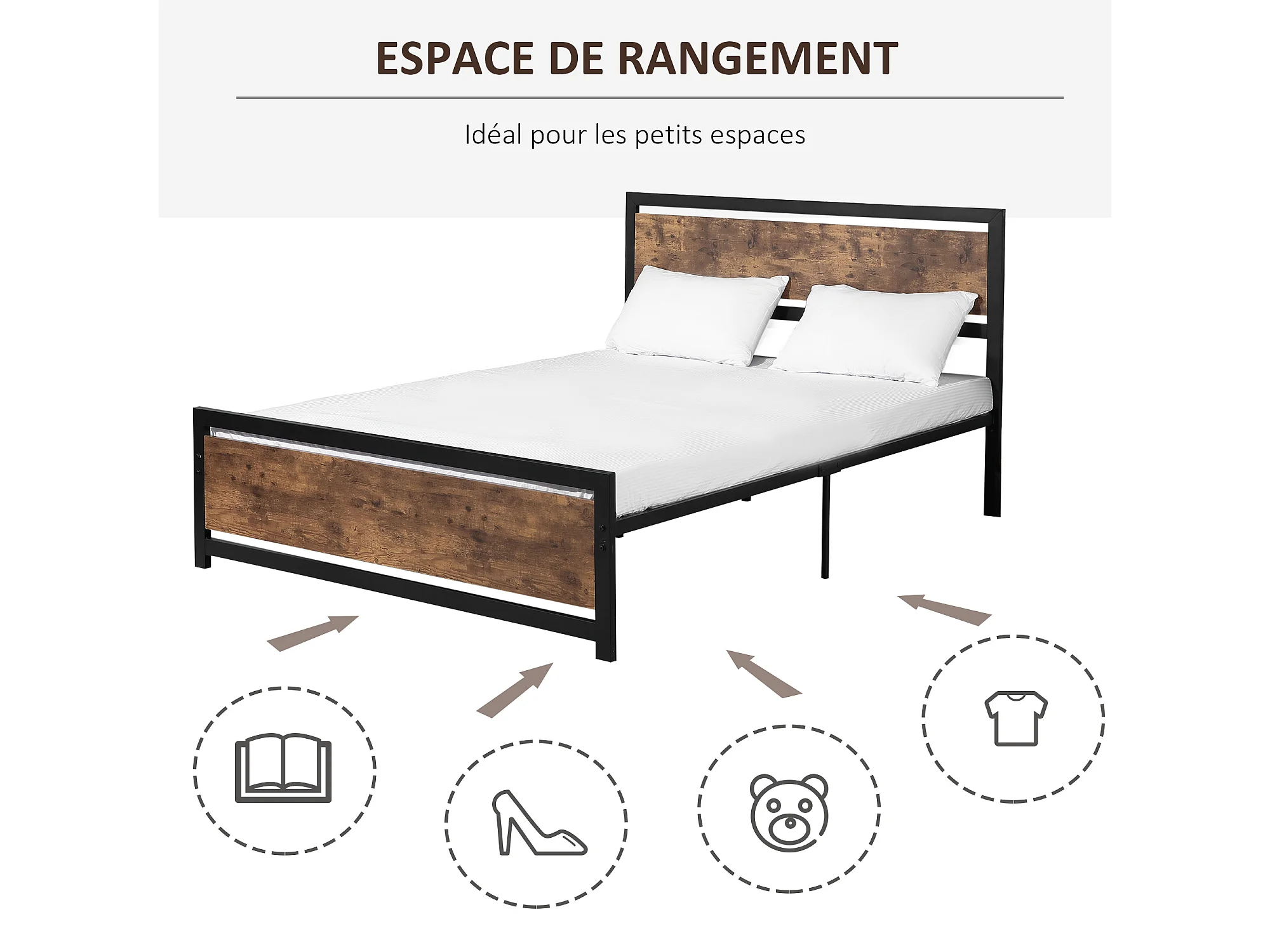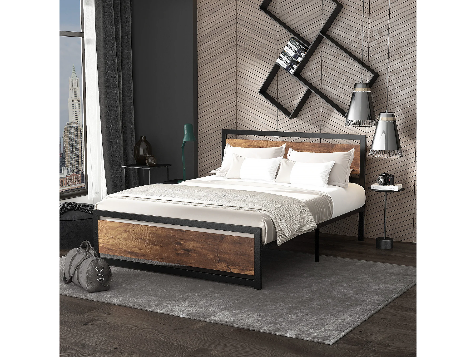 Lit double design industriel - tête de lit, pied de lit et sommier - acier noir MDF aspect bois avec veinage