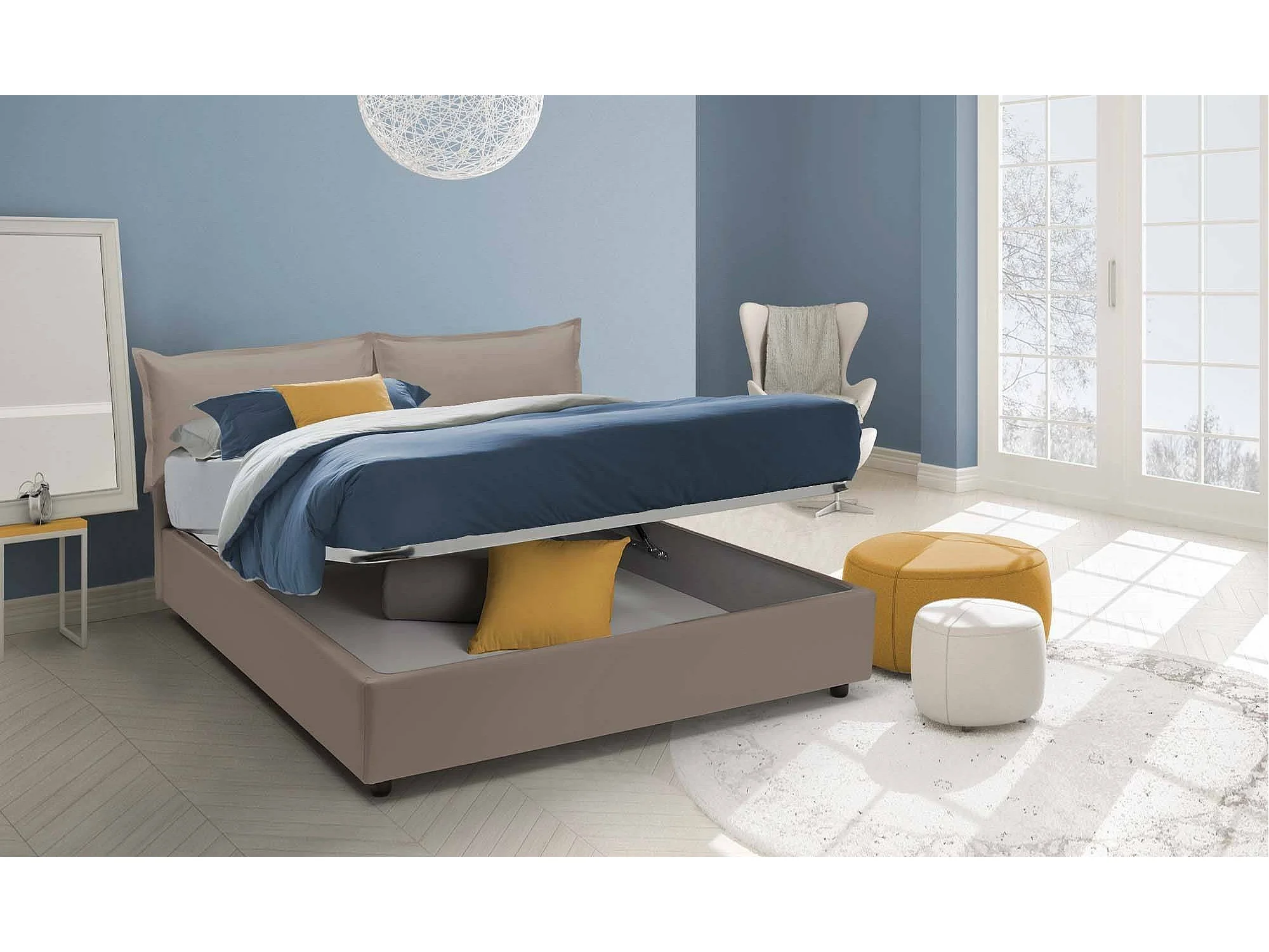 Lit double Dikone, Lit coffre avec revêtement en éco-cuir, 100% Made in Italy, Ouverture frontale, avec matelas 140x190 cm inclus, Taupe
