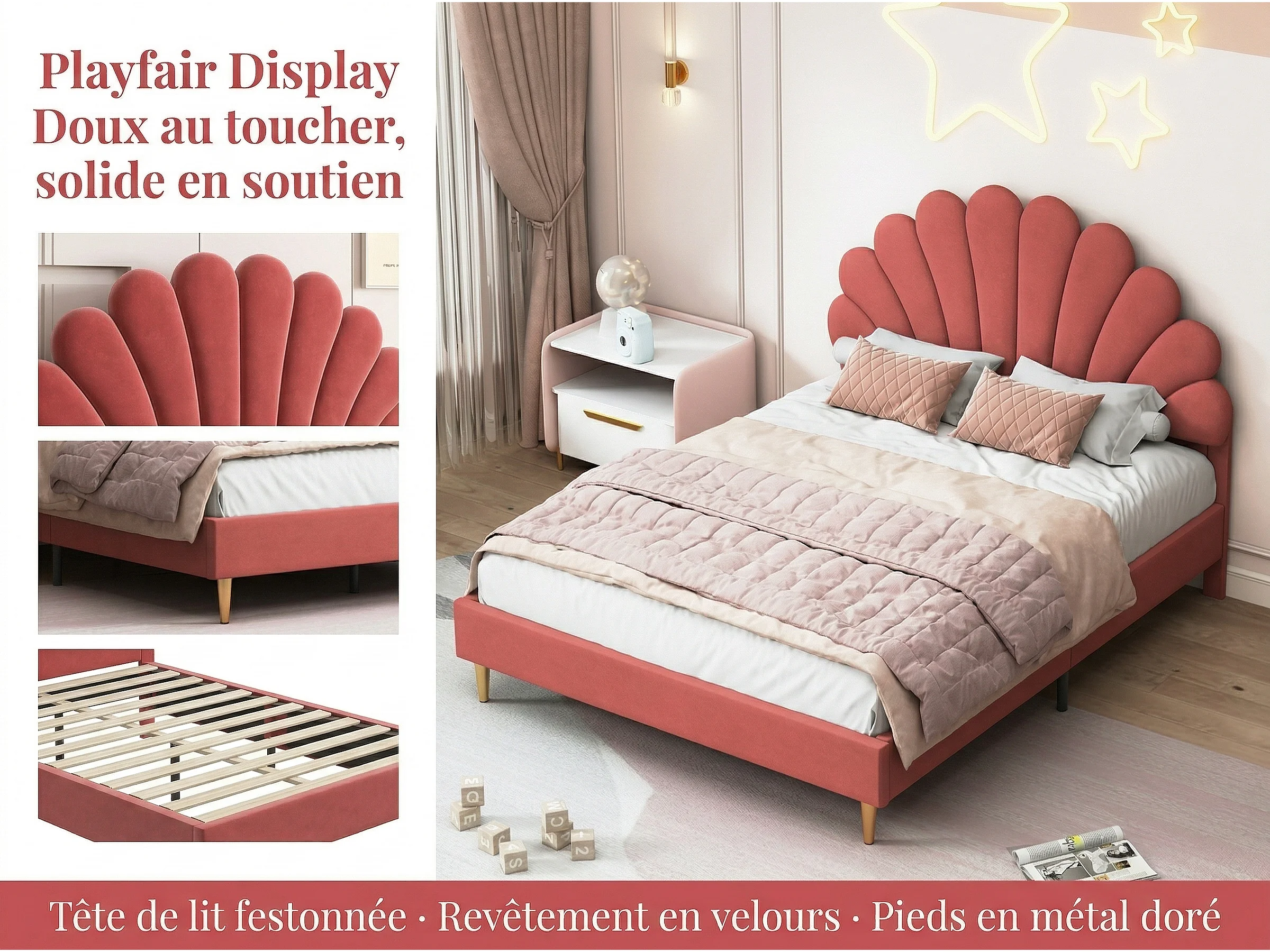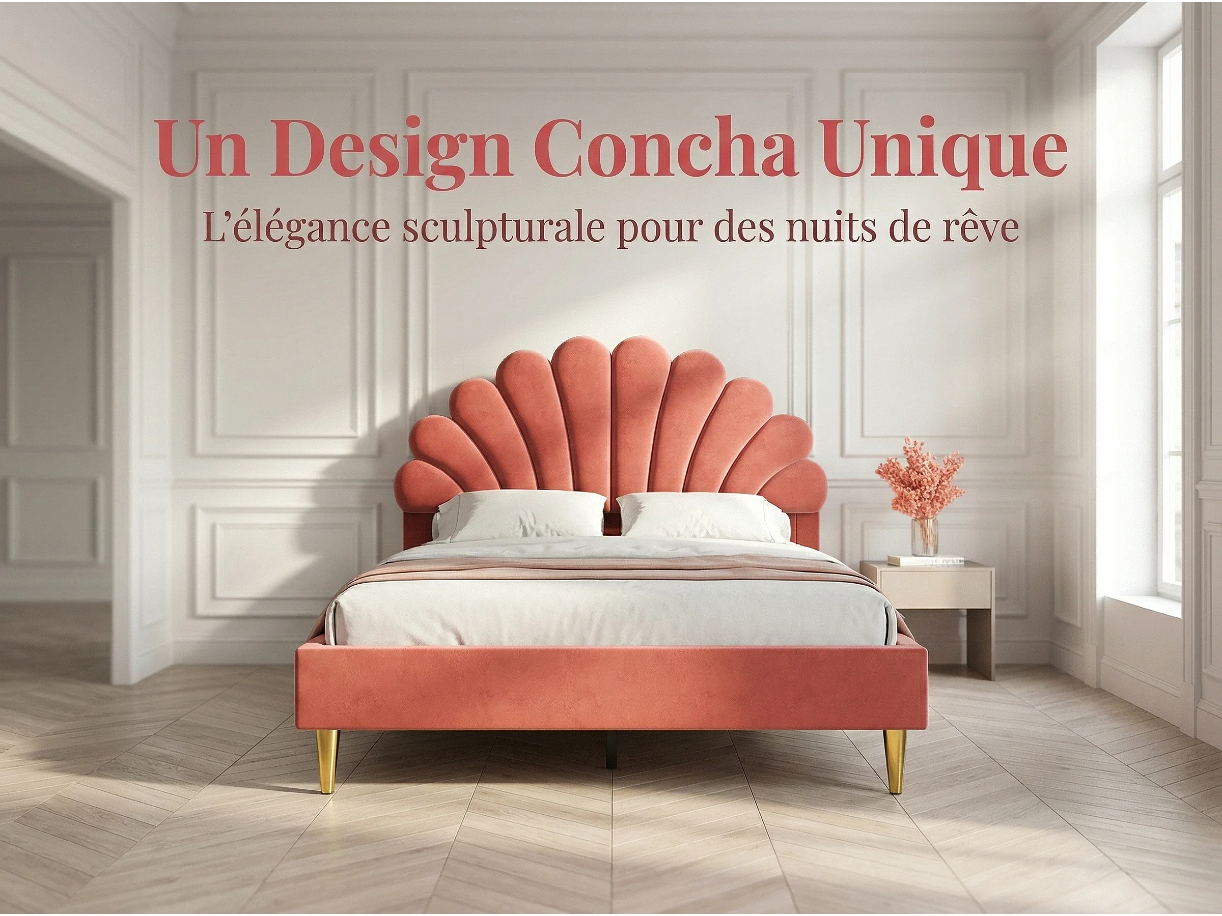 Lit double élégant, recouvert de velours rose, tête de lit en forme de coquillage, style moderne, pieds de lit dorés.