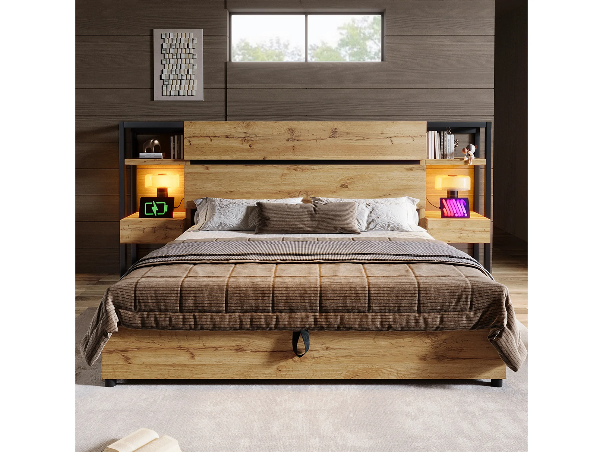 Lit double en bois 160 × 200 cm, avec tiroirs et ports de recharge USB et Type-C, couleur chêne.