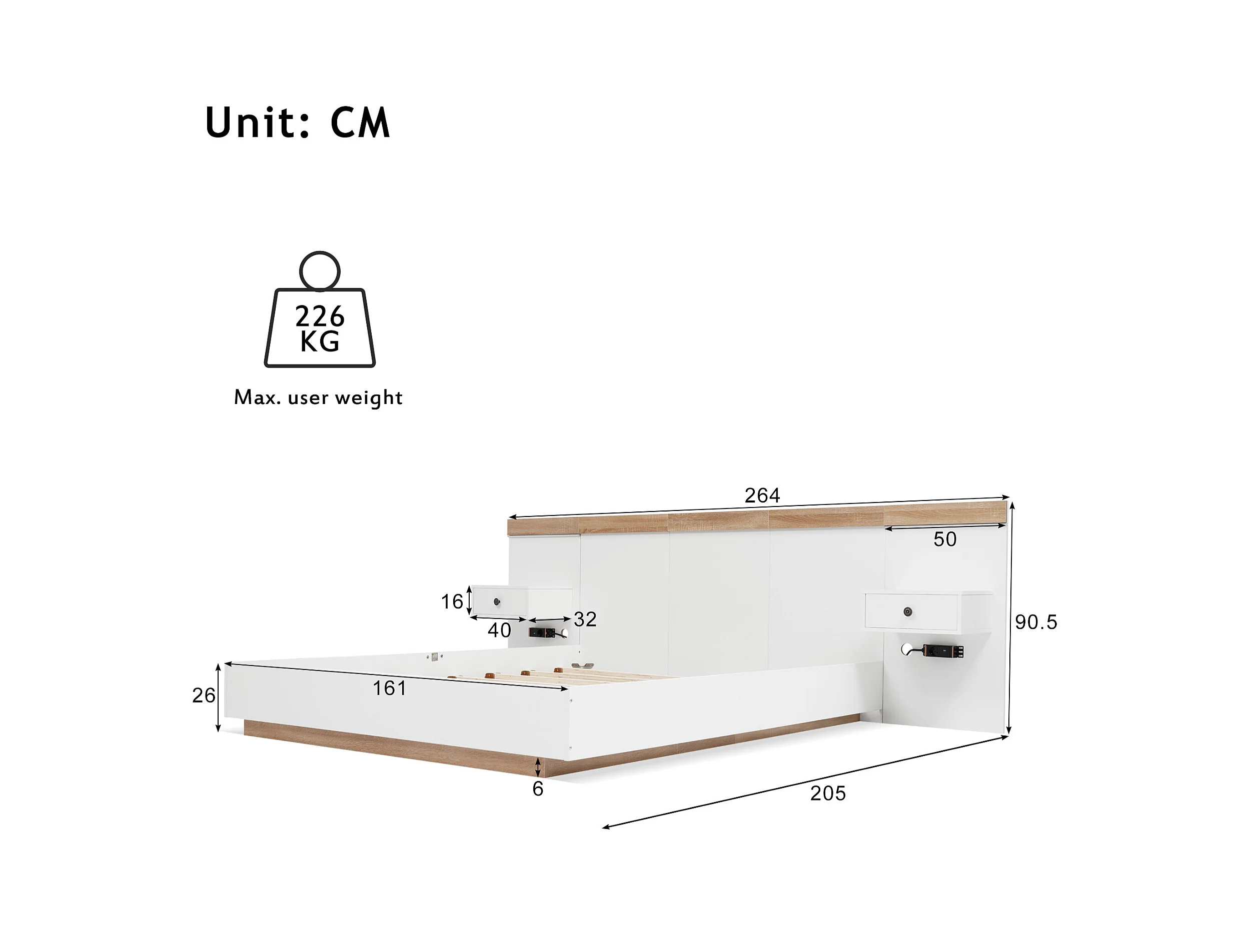 Lit Double en Bois 160x200 cm + 2 Tables de chevet avec LED et USB - Blanc(sans matelas)