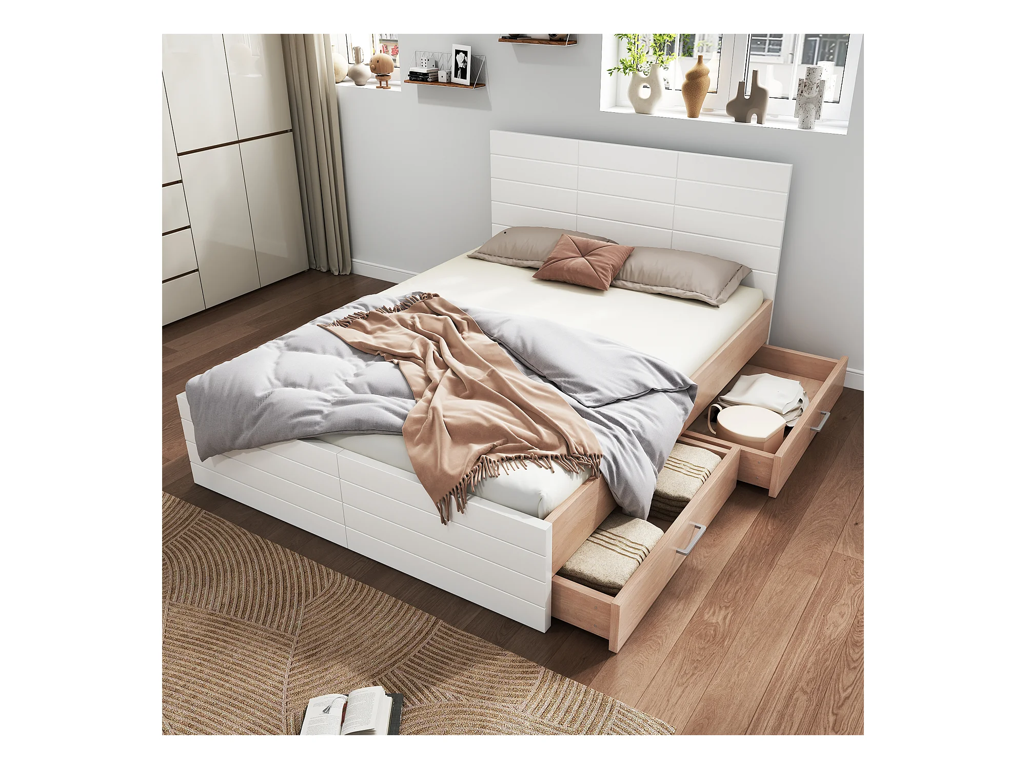 Lit double en bois 160×200 cm avec 2 tiroirs, structure et sommier inclus, style moderne chêne/blanc