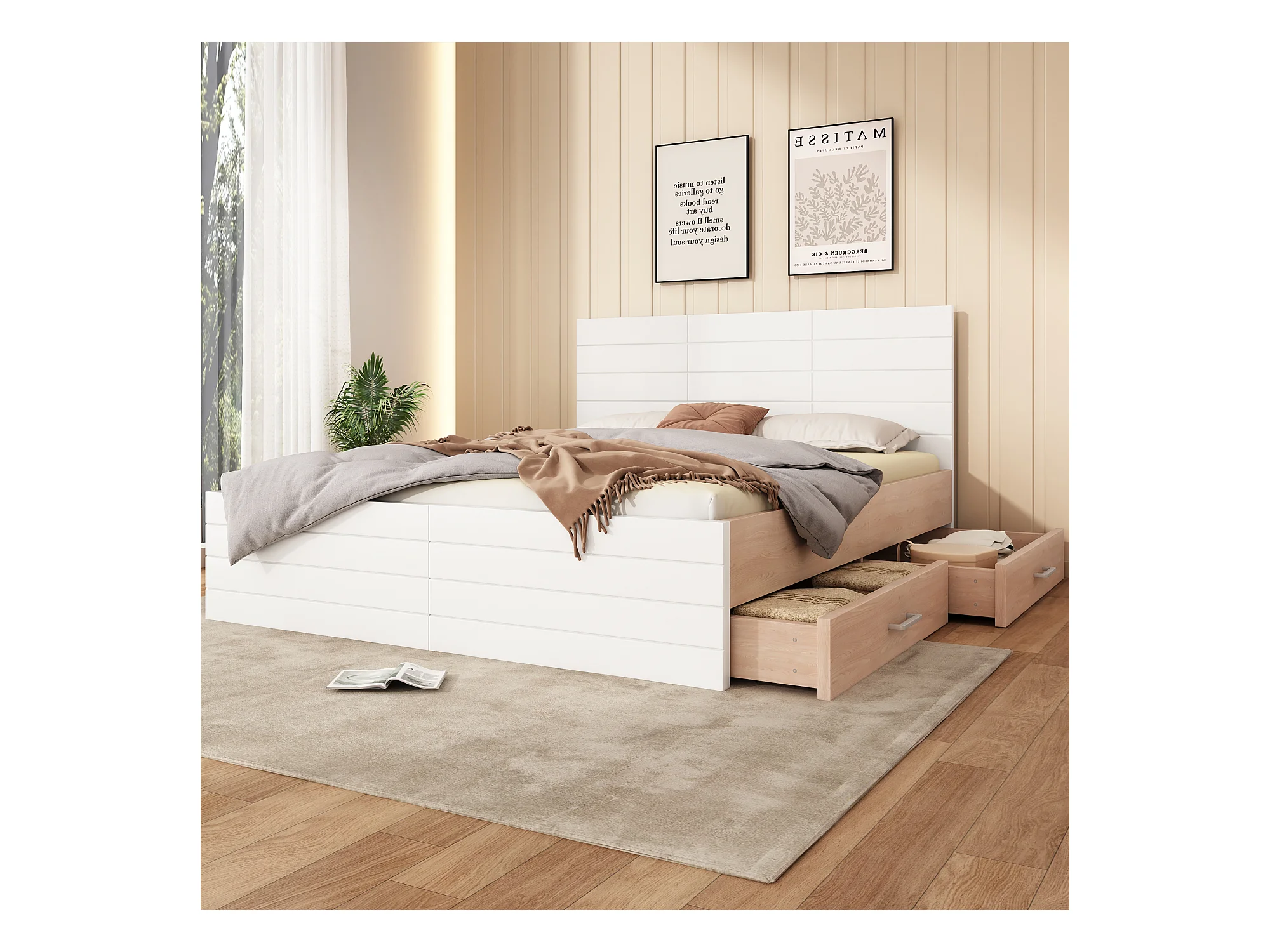 Lit double en bois 180×200 cm avec 2 tiroirs, structure et sommier inclus, style moderne chêne/blanc