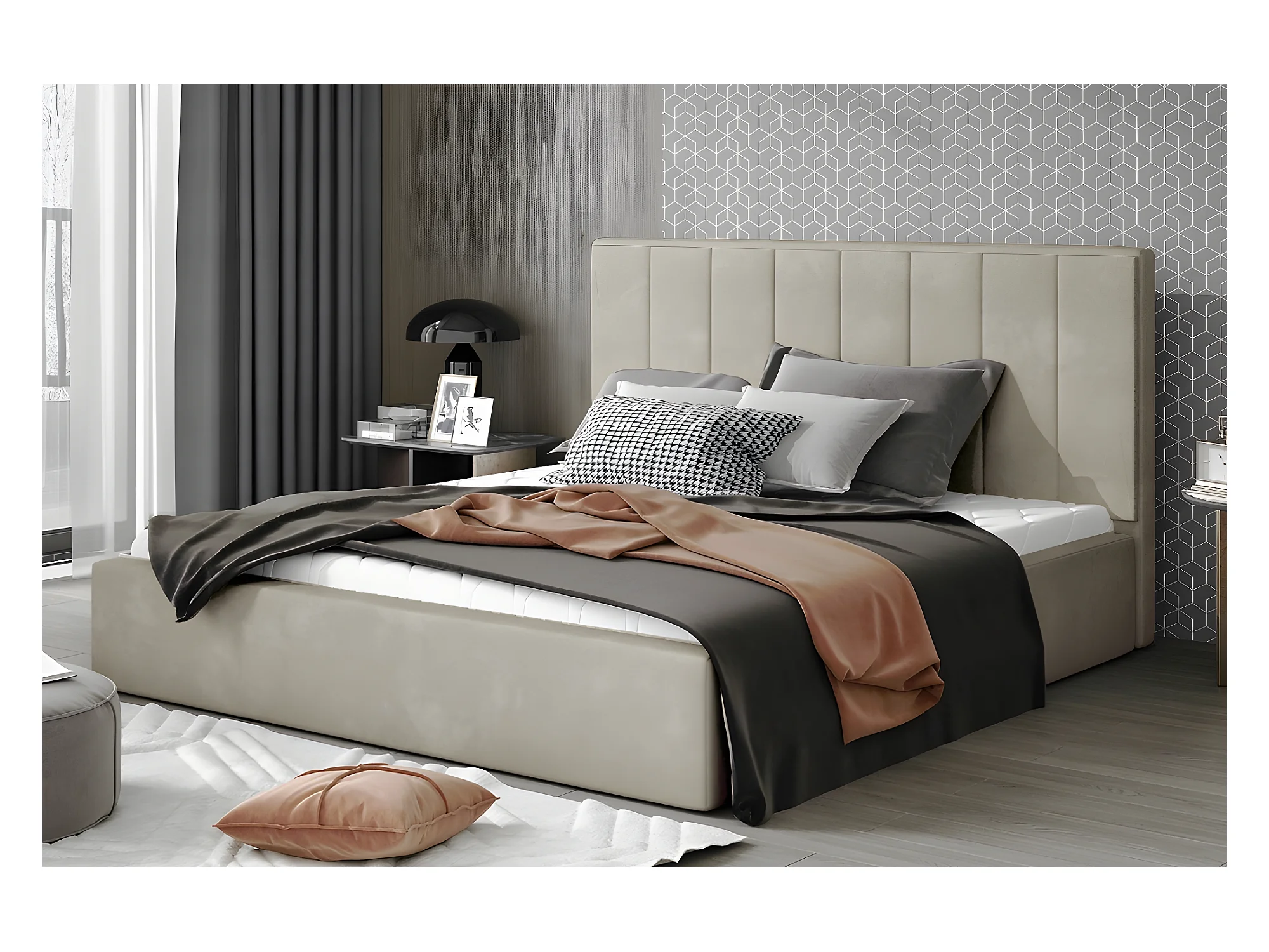 Lit double en tissu velours de qualité luxe, AUDE, beige, 200x200
