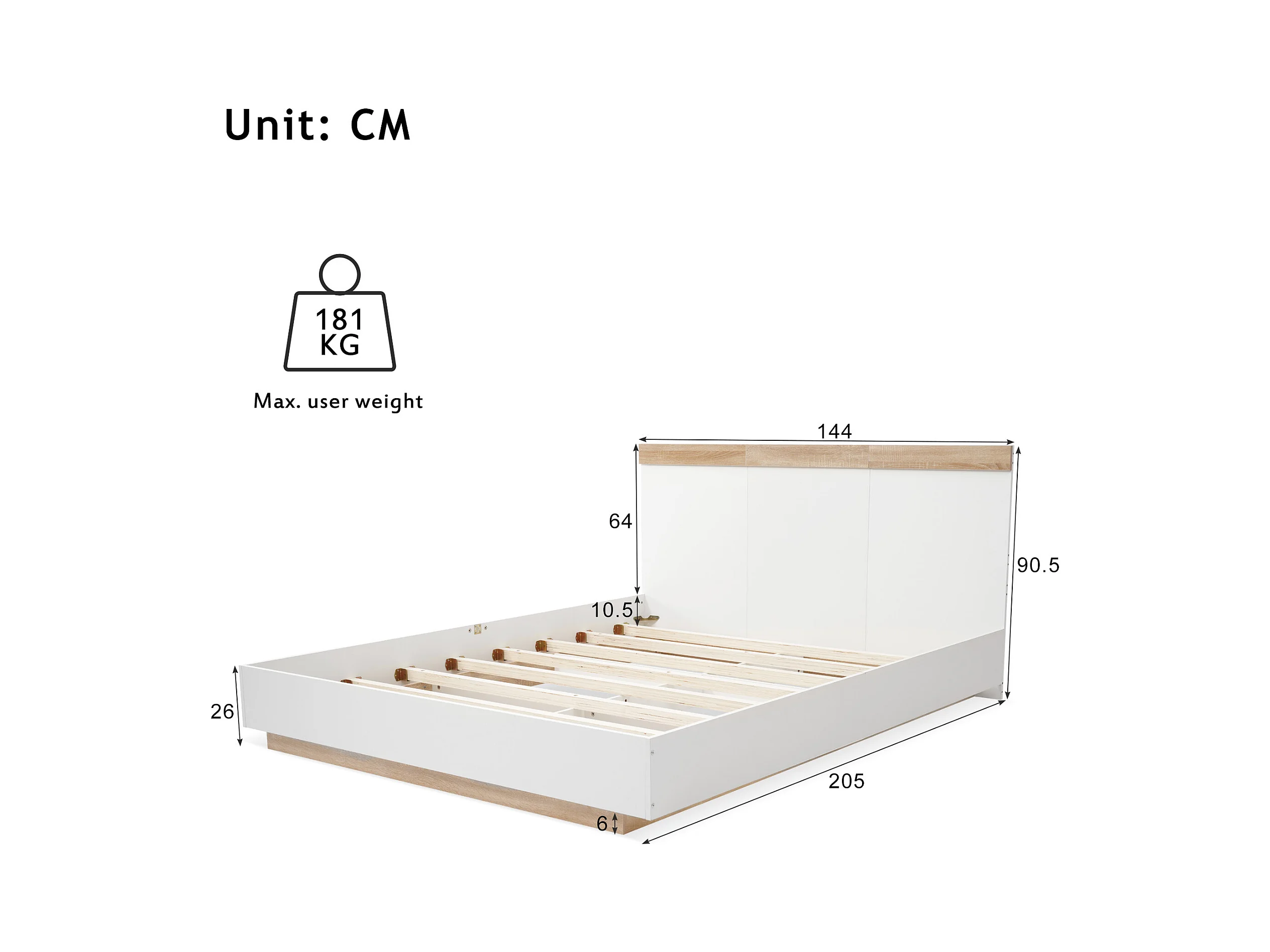 Lit Double Flottant En Bois - 205 X 144 X 90,5 cm - Cadre De Lit et Sommier À Lattes - Chêne / Blanc