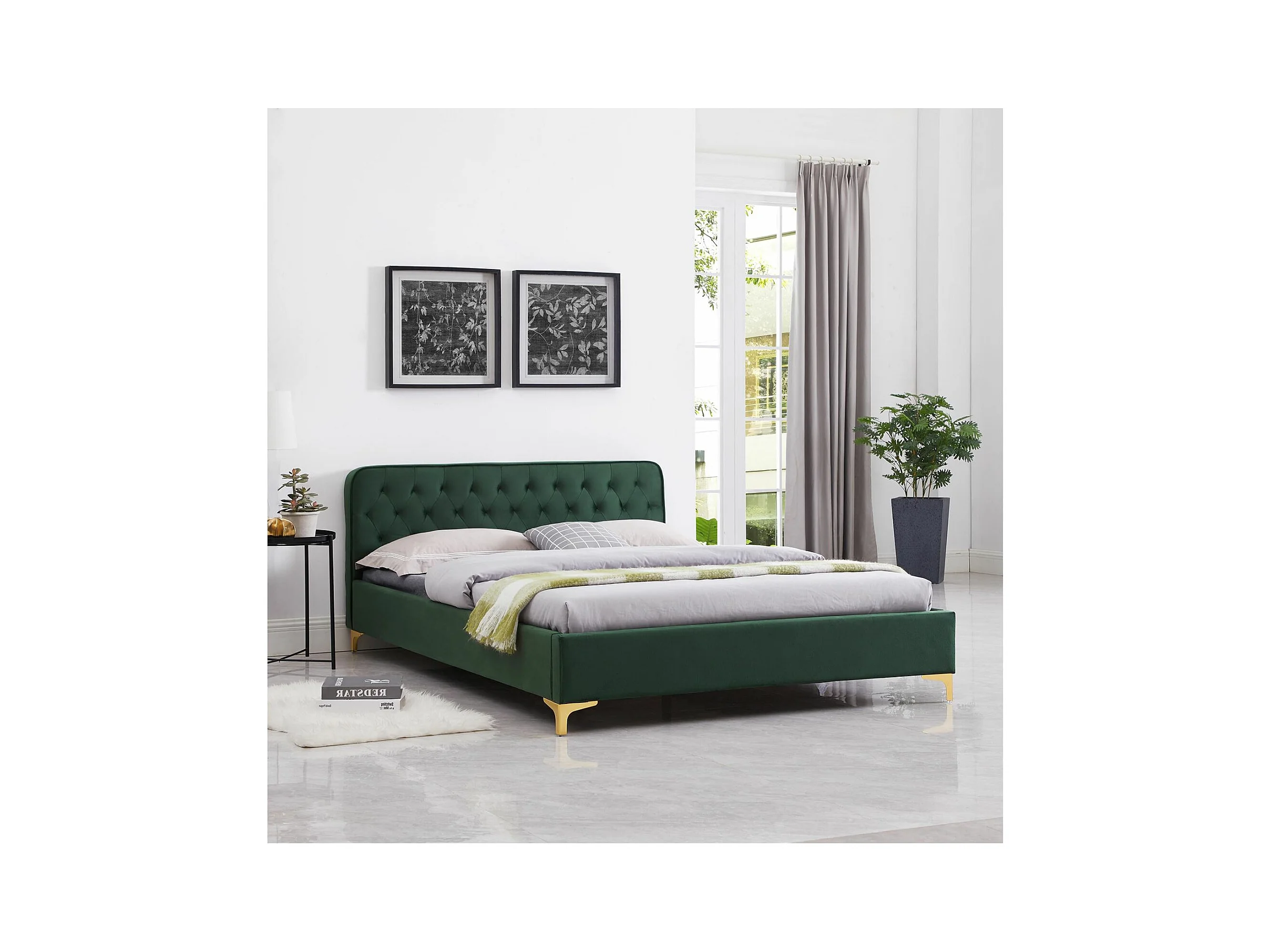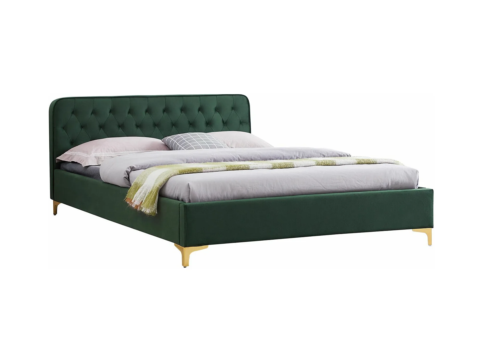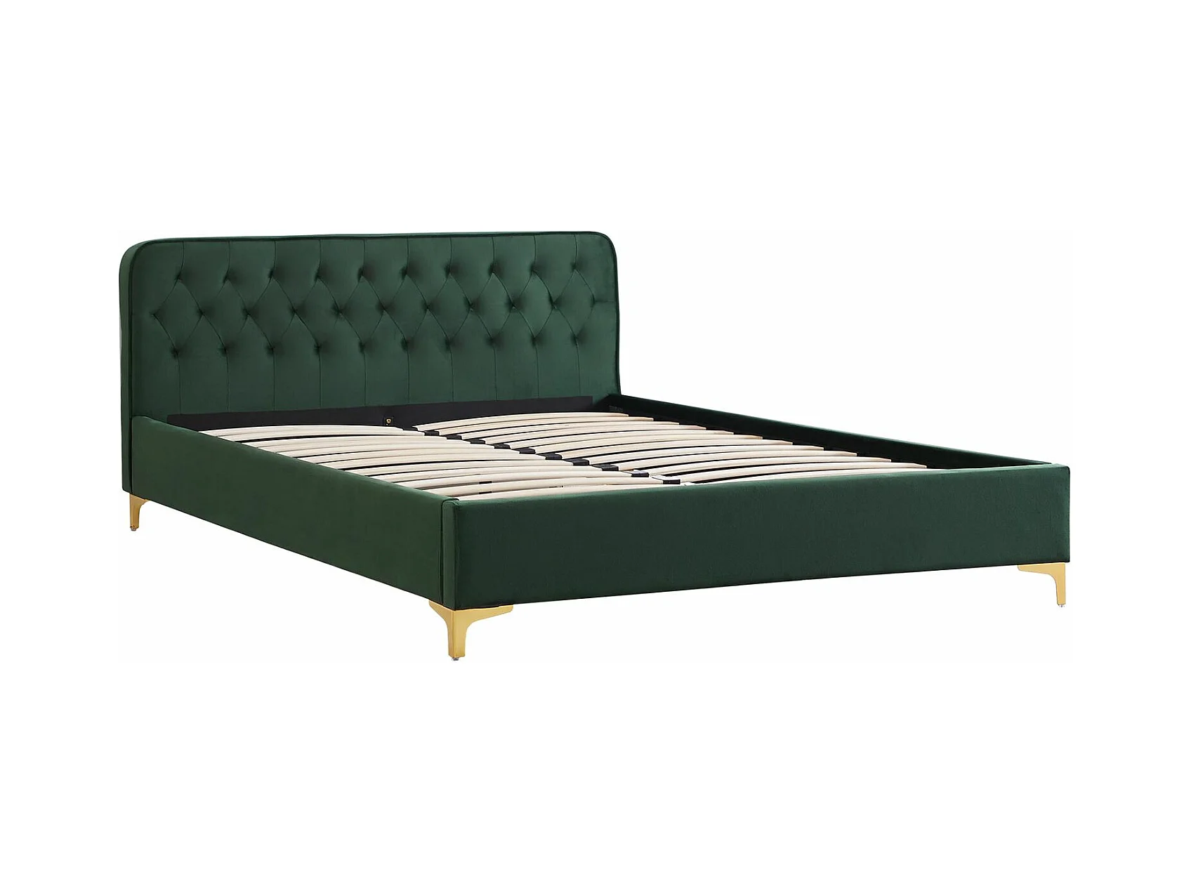 Lit double GLAMOUR couchage 140x190 cm, avec sommier et pieds en métal doré, style baroque, revêtement en velours capitonné vert