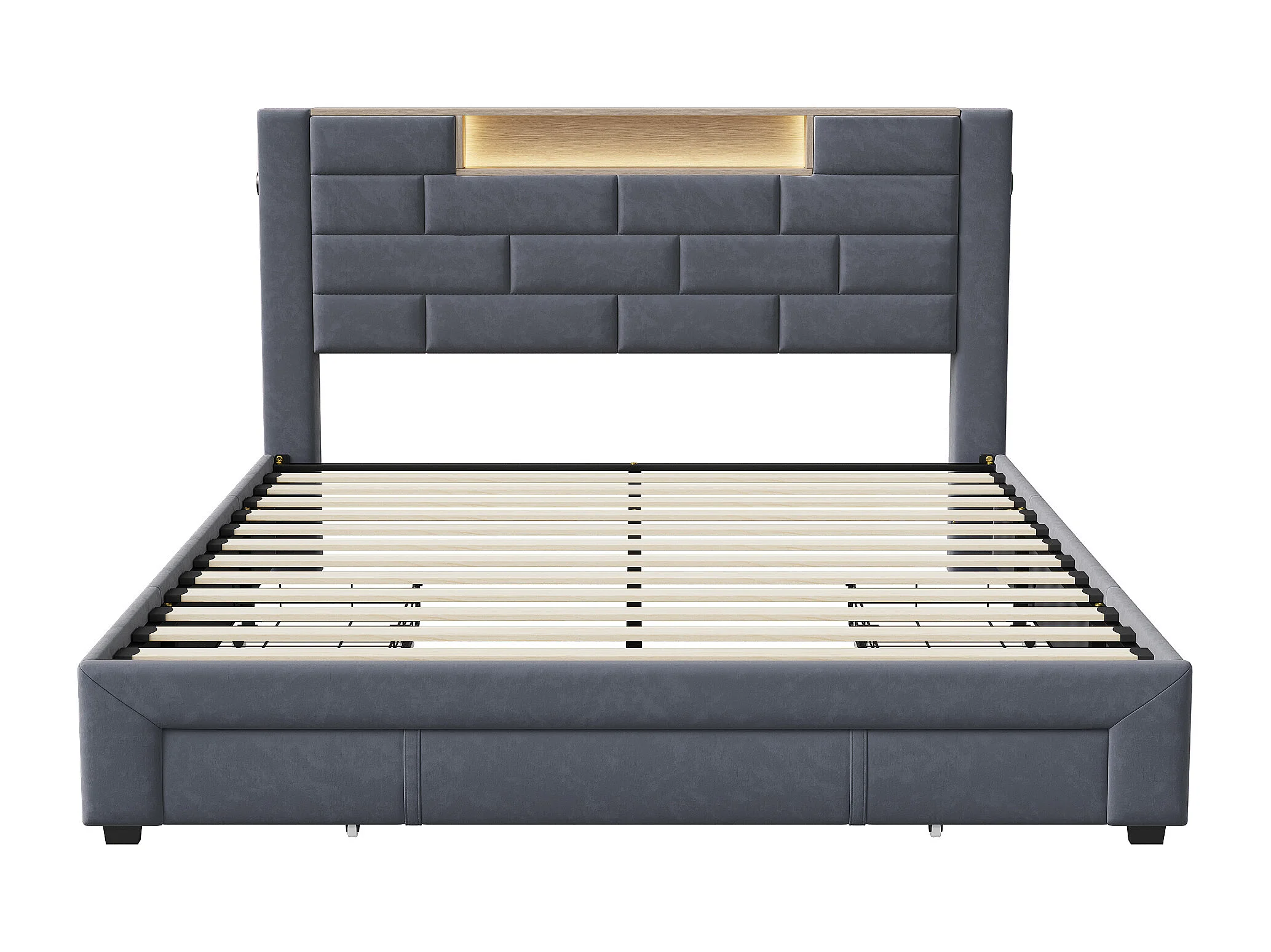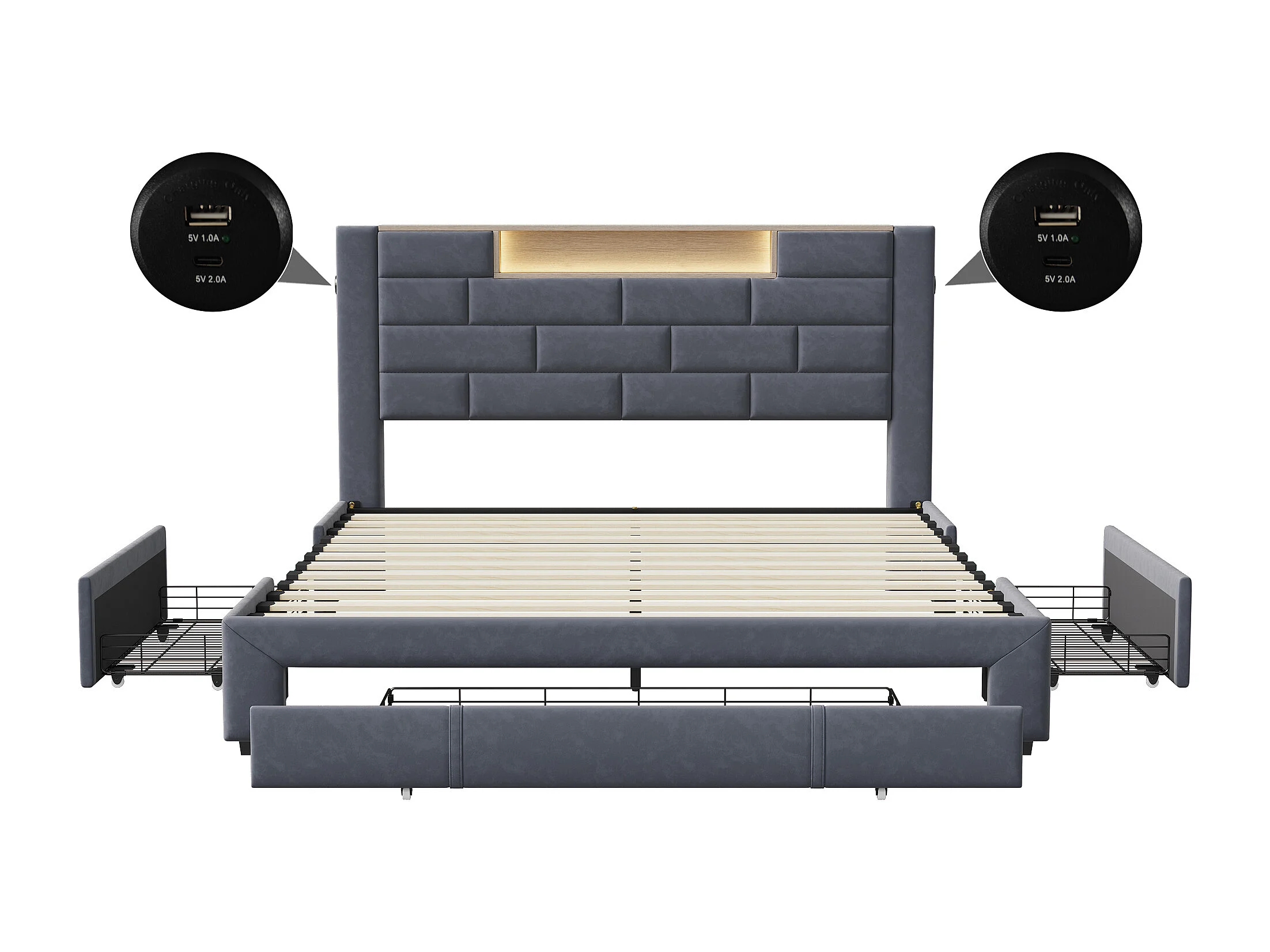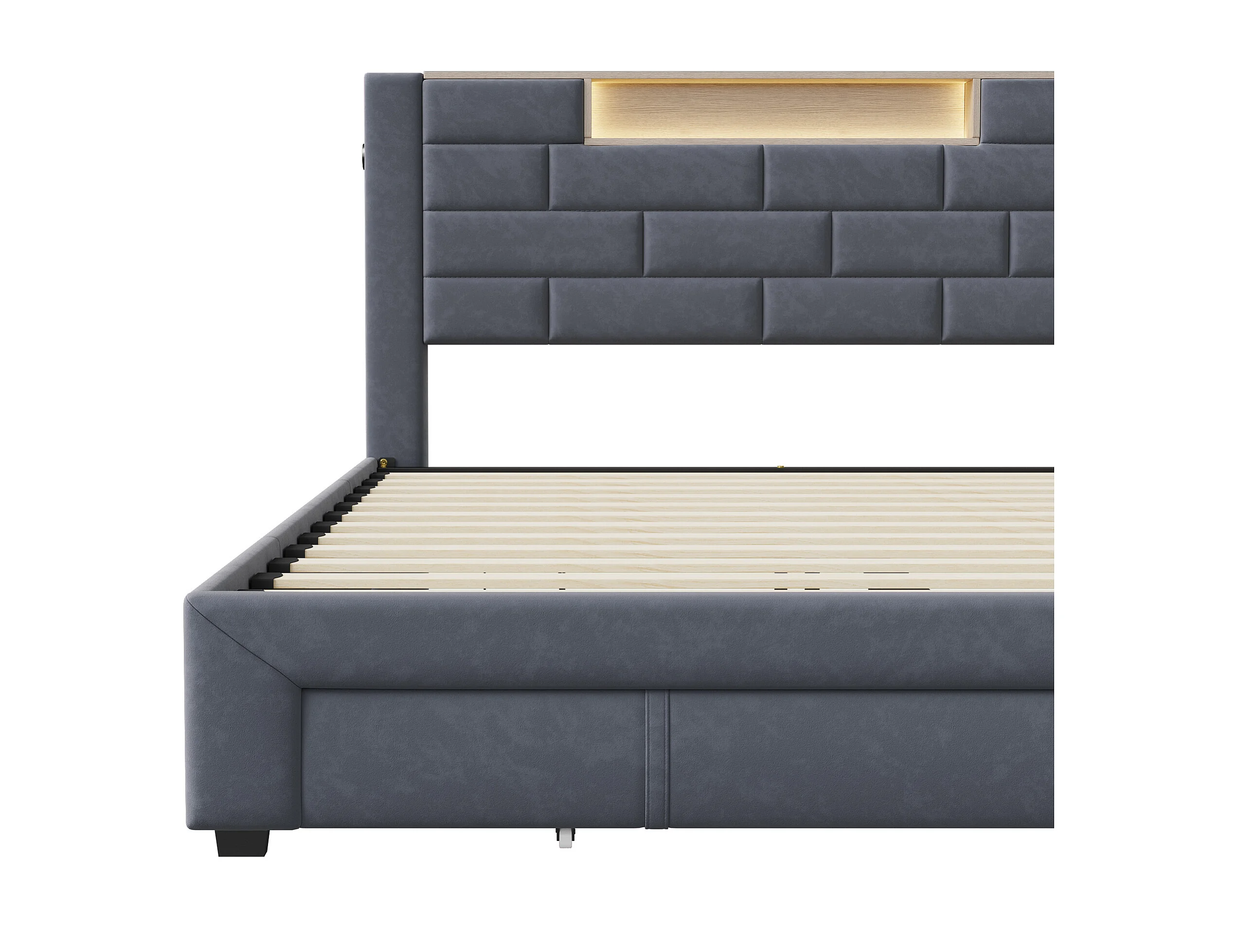 Lit Double Gris Velours Avec Tête De Lit à Ports USB Et Tiroirs De Rangement - 140 x 200 cm