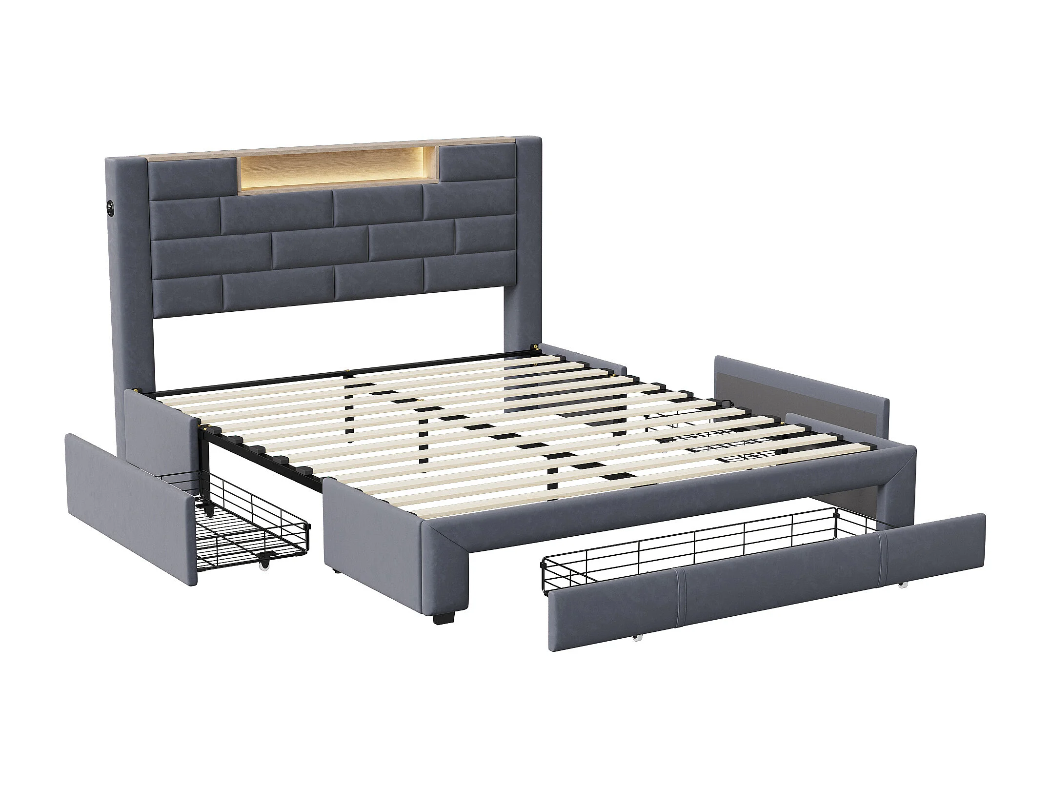 Lit Double Gris Velours Avec Tête De Lit à Ports USB Et Tiroirs De Rangement - 160 x 200 cm