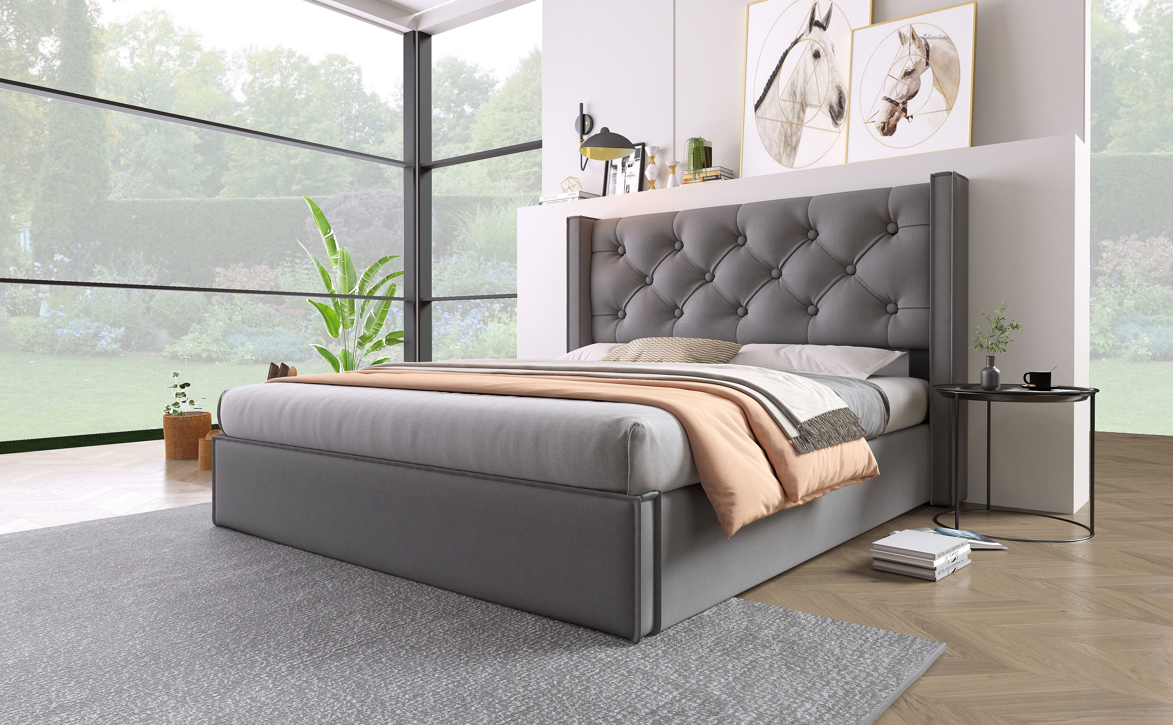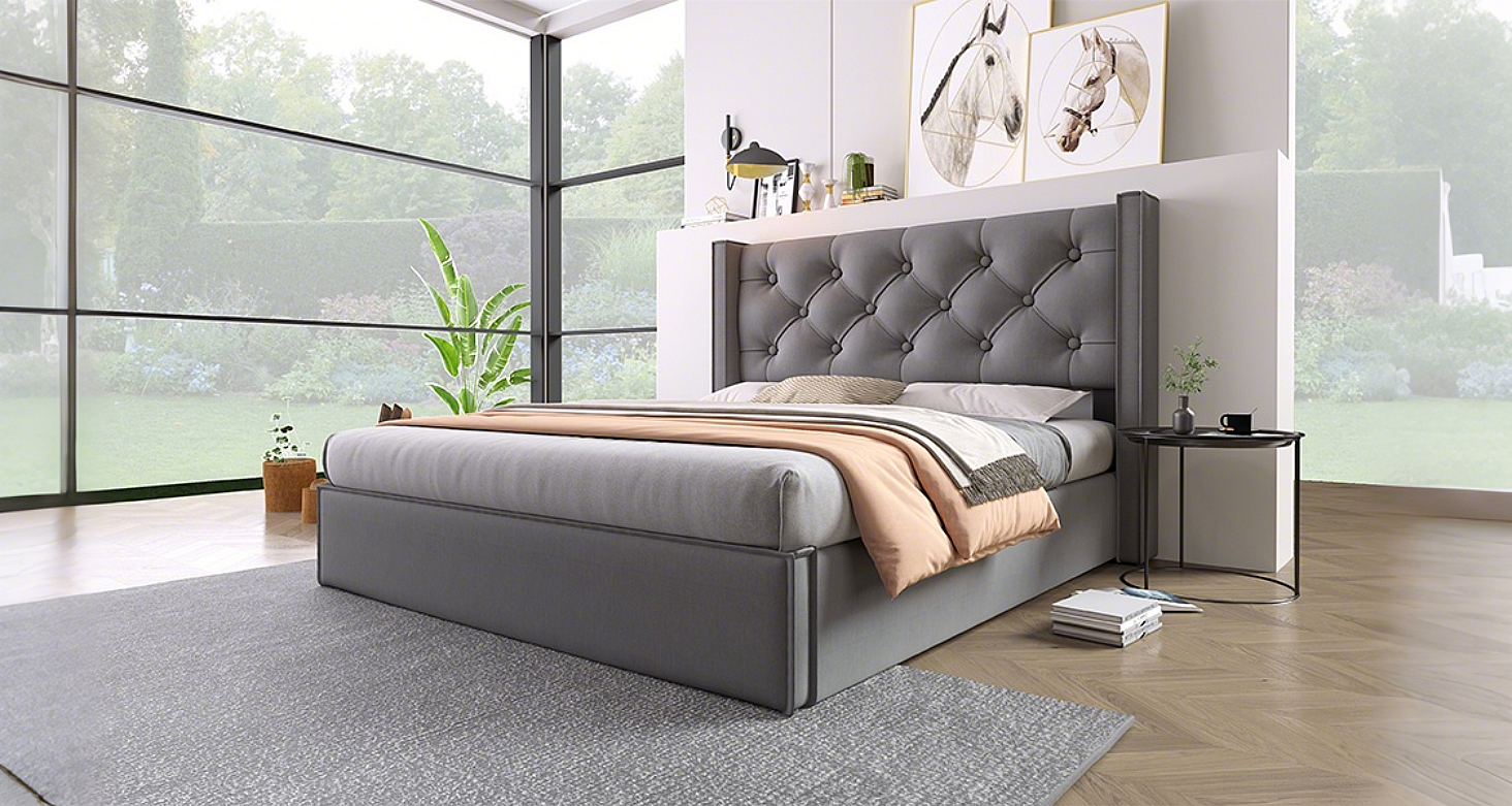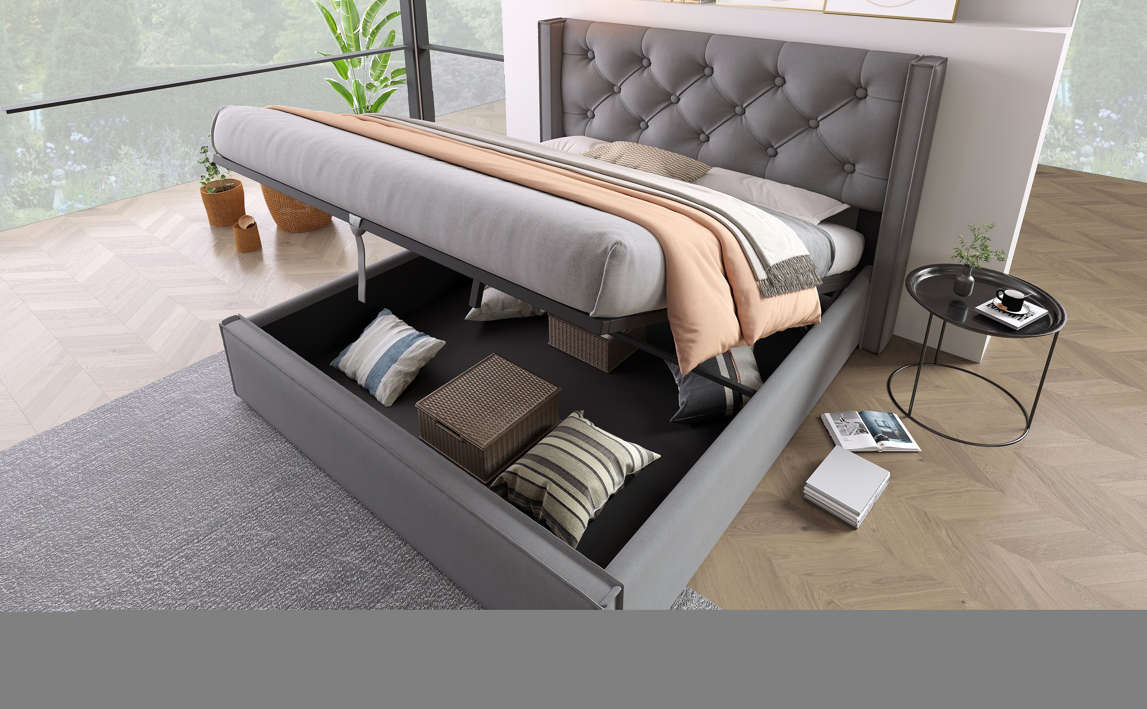 Lit double hydraulique 140x200 cm, avec sommier en métal et rangement, tissu coton gris, design moderne