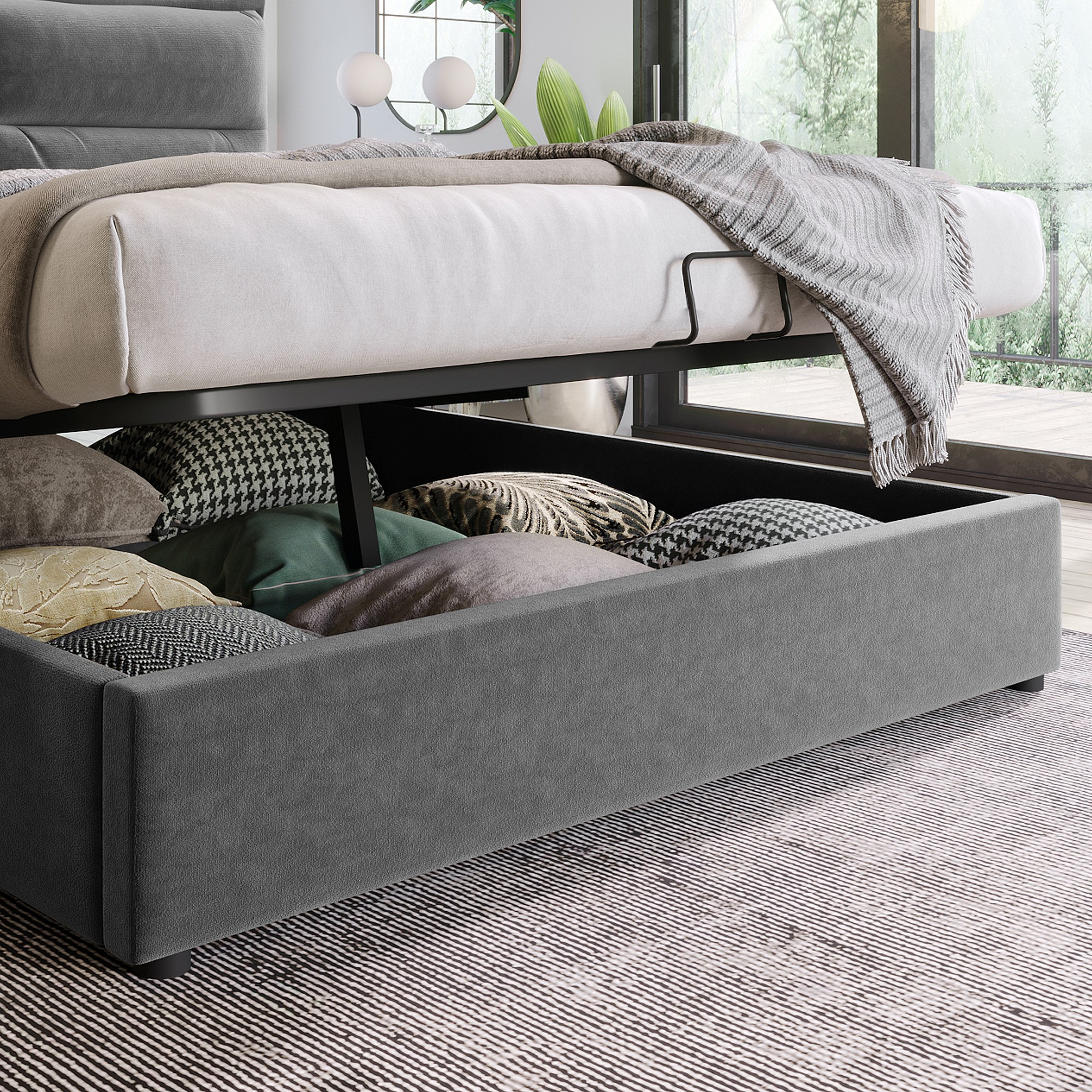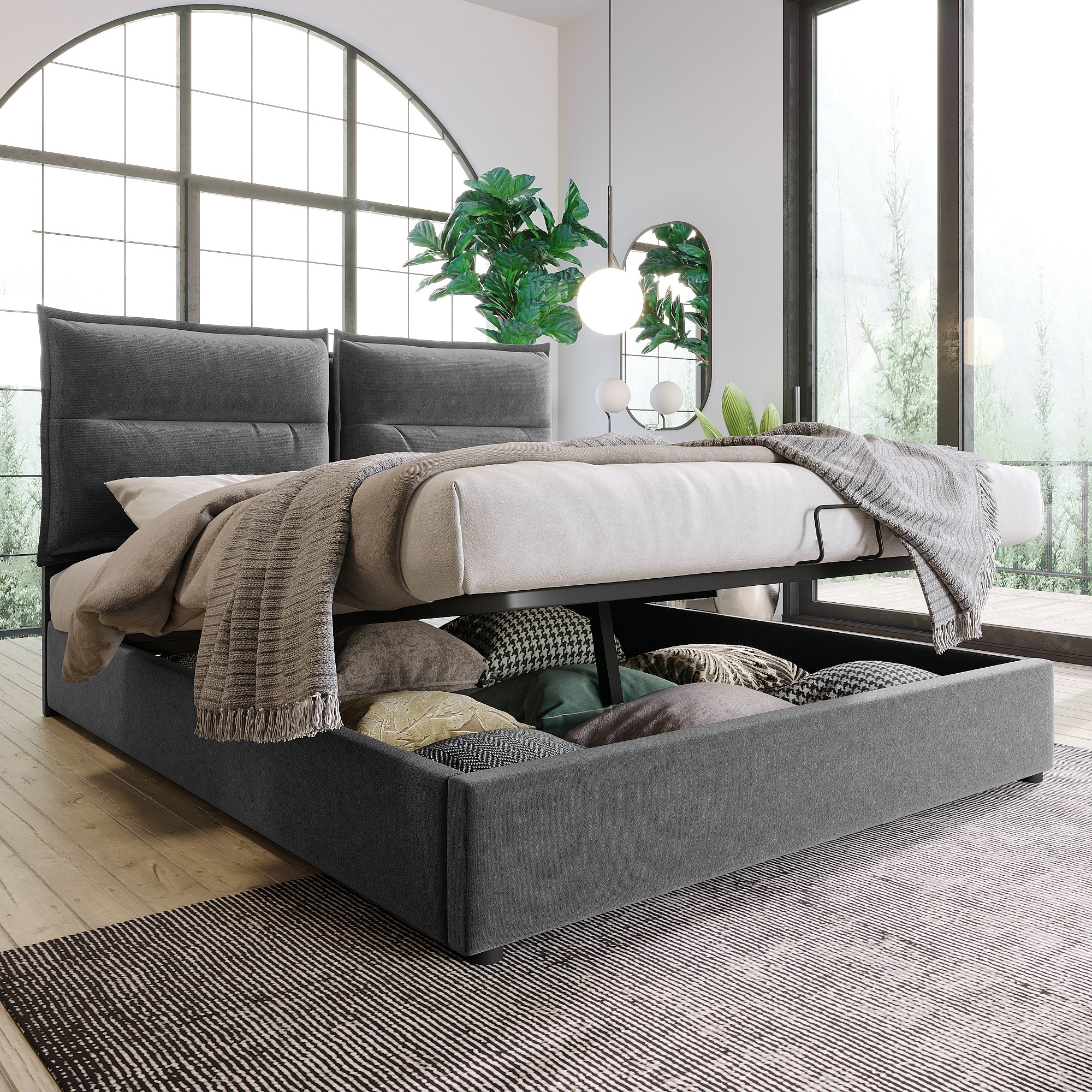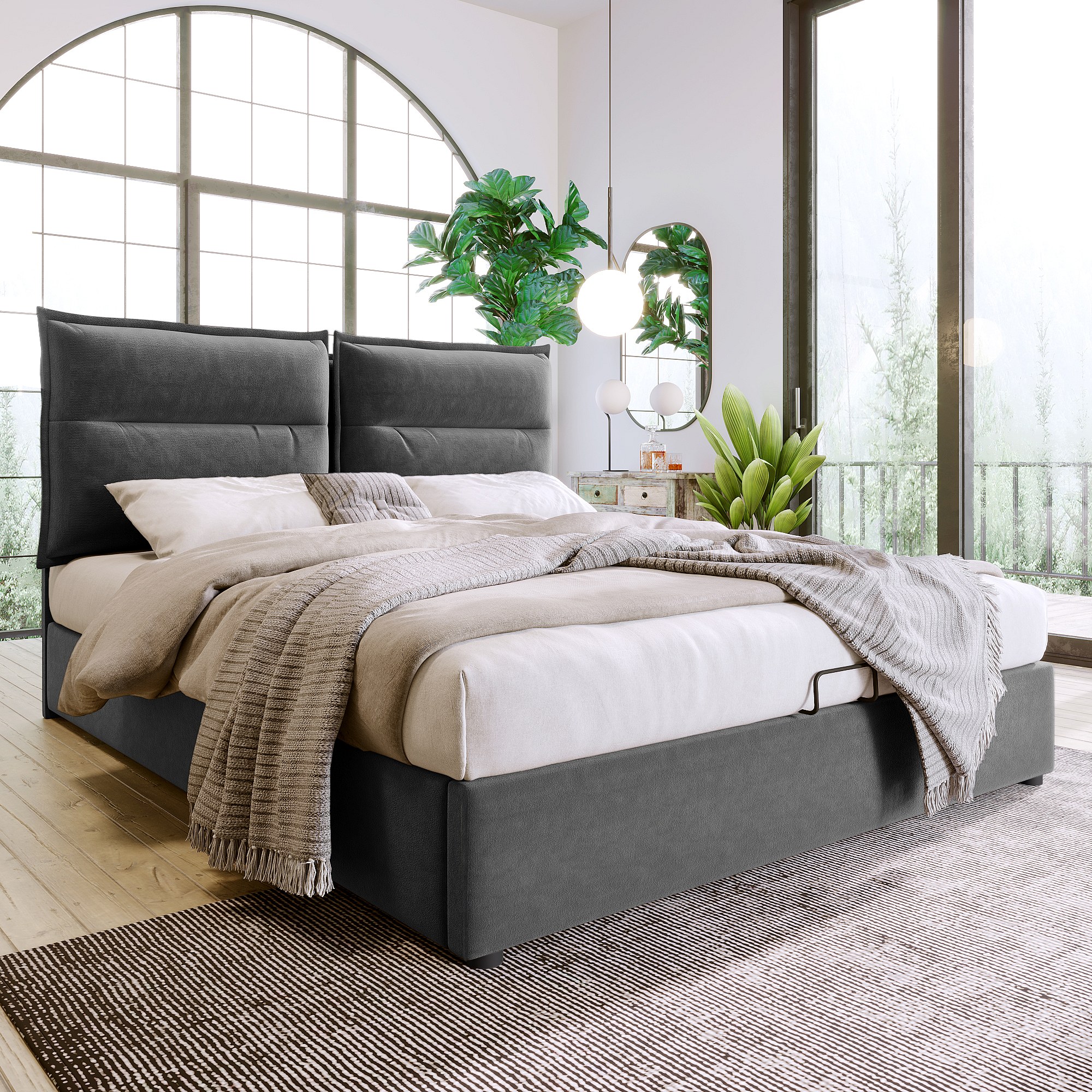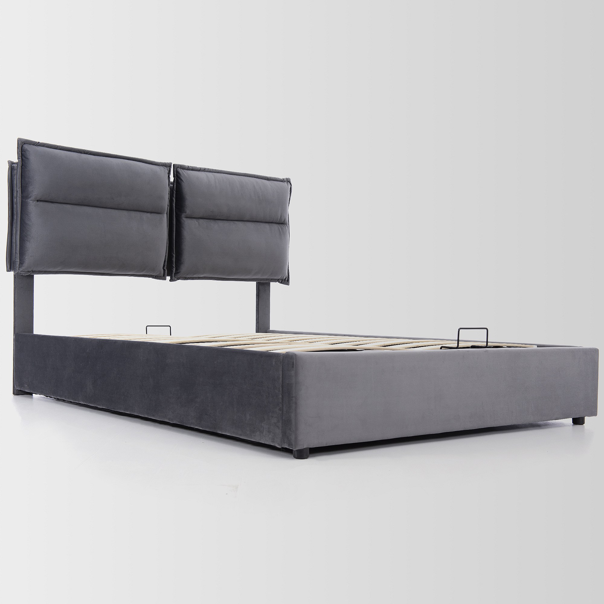 Lit double hydraulique 140x200 cm, tête de lit réglable, cadre en velours avec rangement, gris