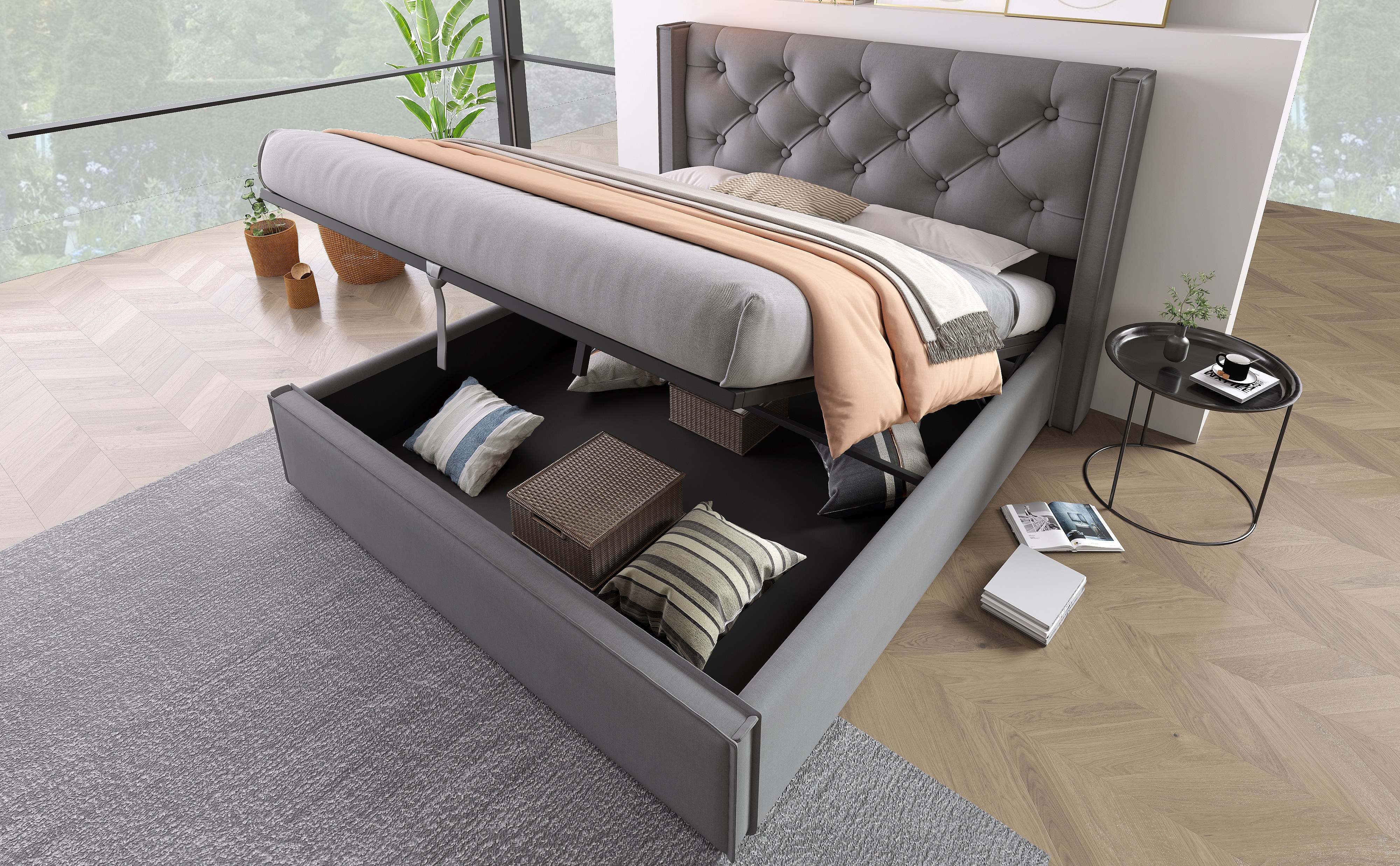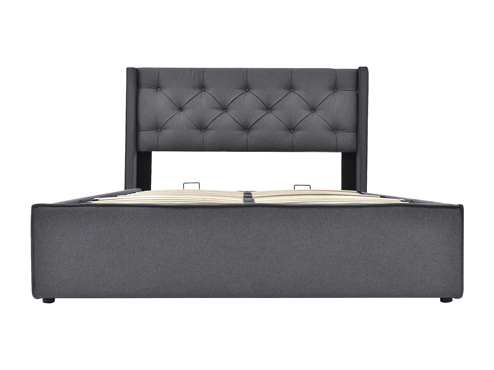 Lit double hydraulique 160x200 cm, avec sommier en métal, design moderne et espace de rangement, gris