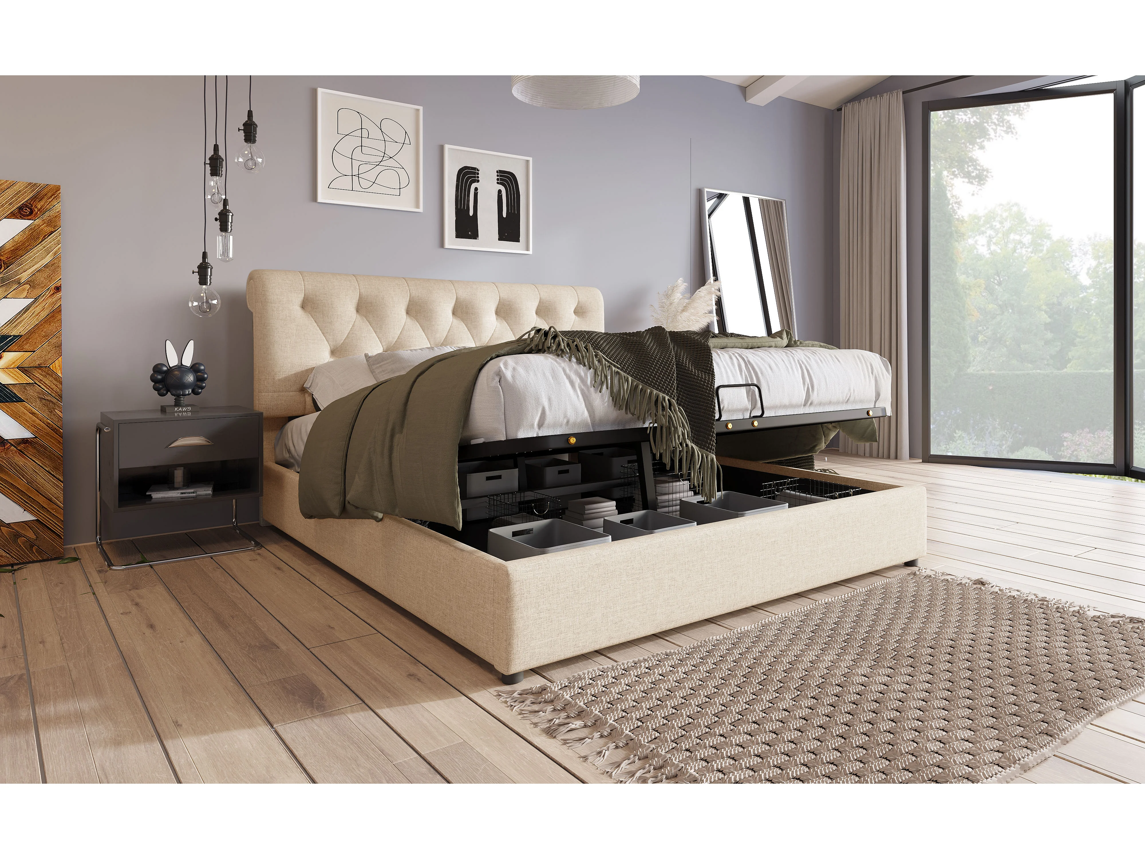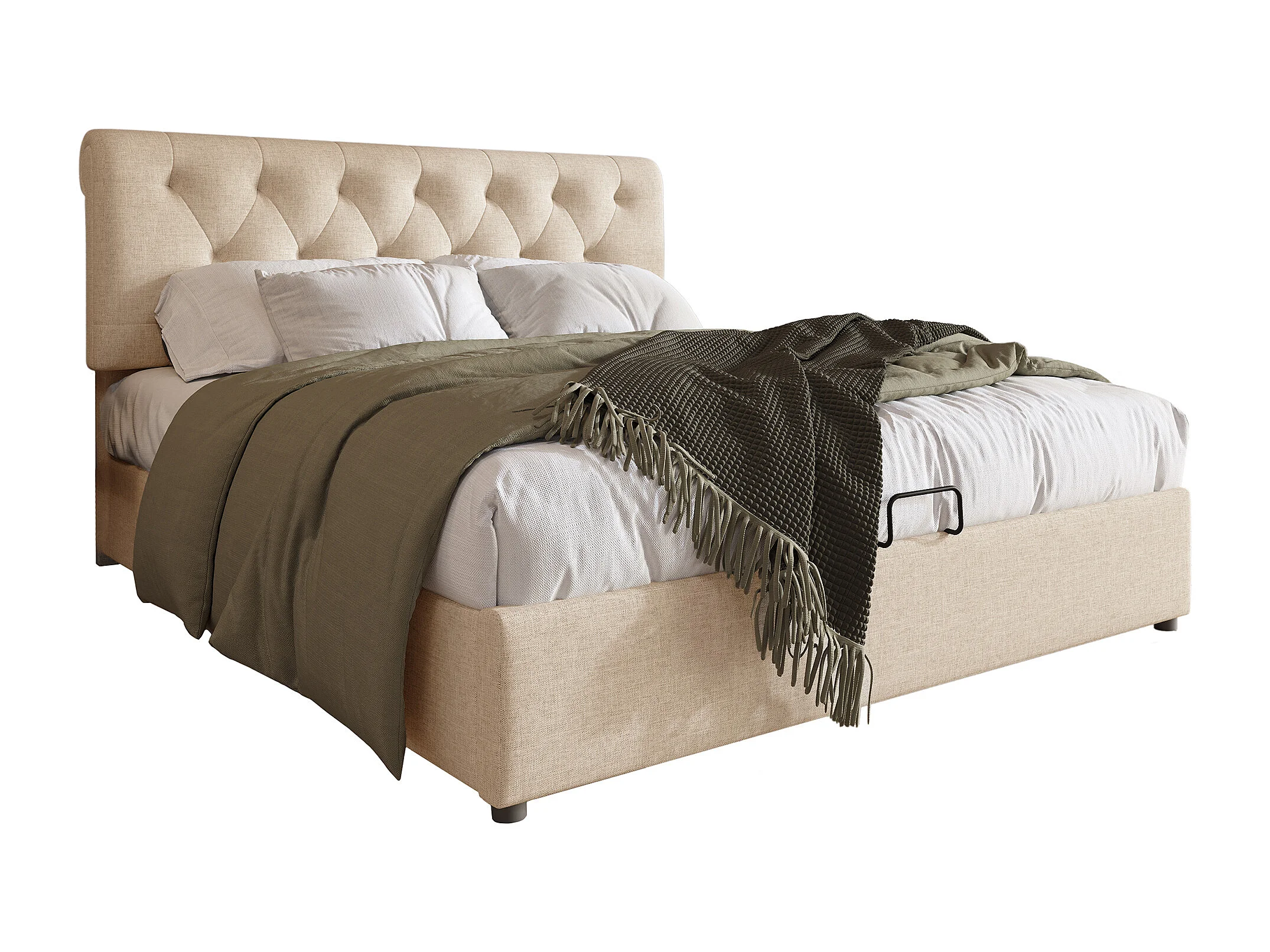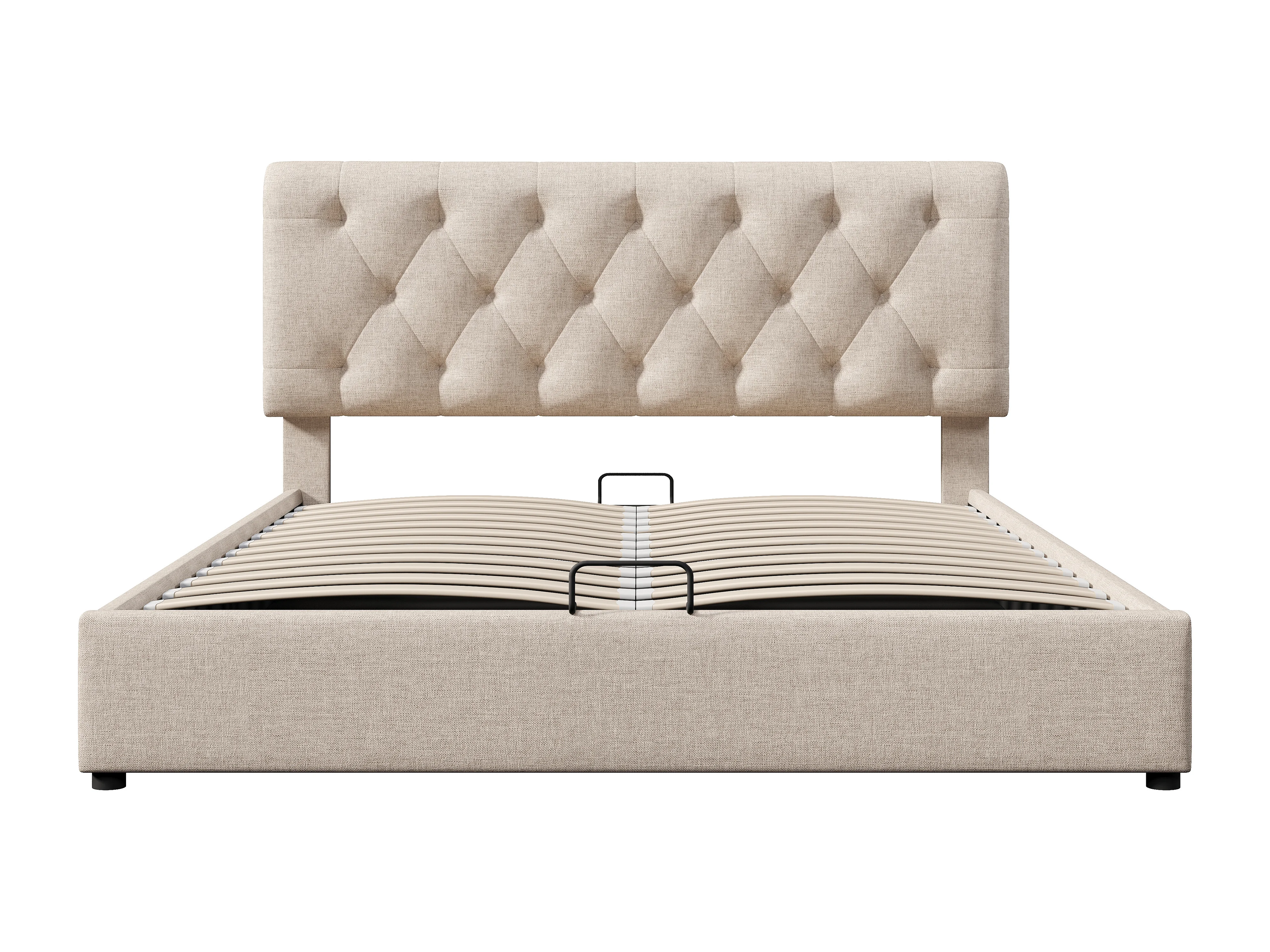Lit double hydraulique 160x200 cm, tête de lit réglable, cadre en métal avec rangement, naturel