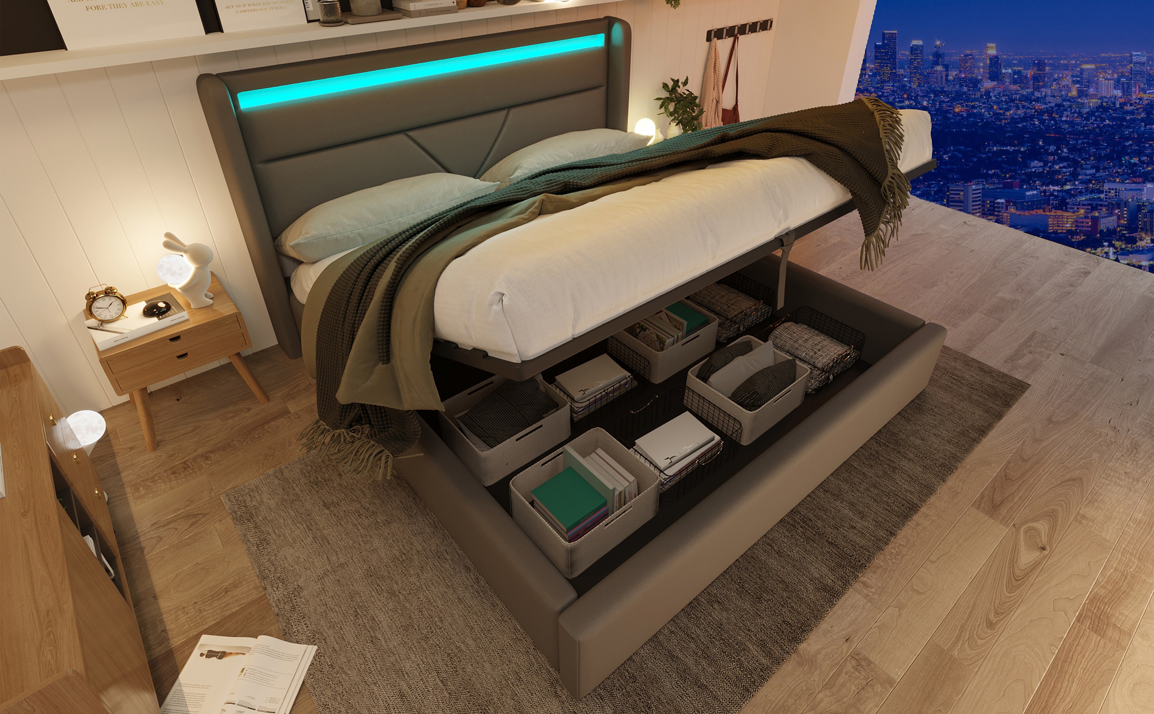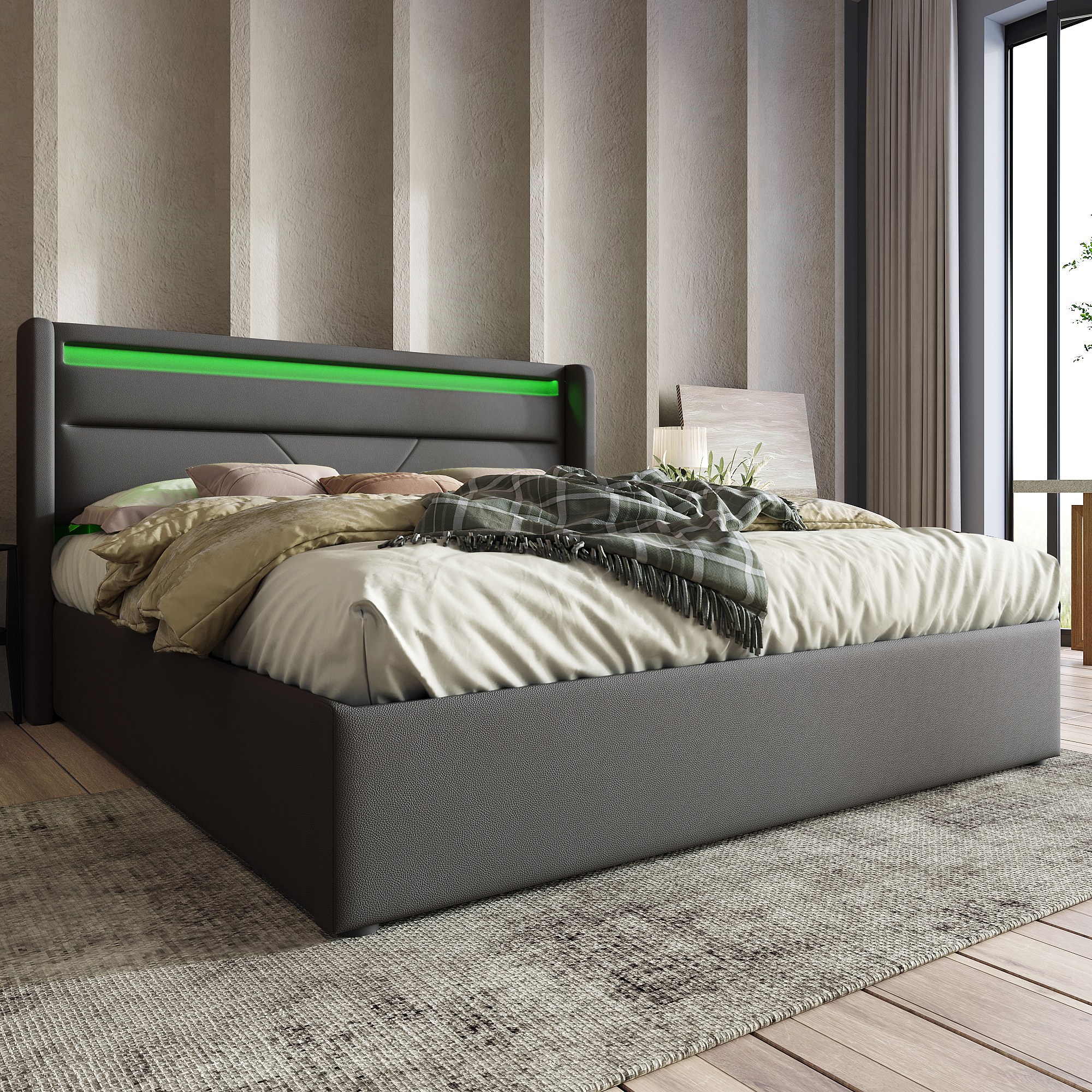 Lit double hydraulique avec éclairage LED, 160x200 cm, gris, avec rangement et télécommande
