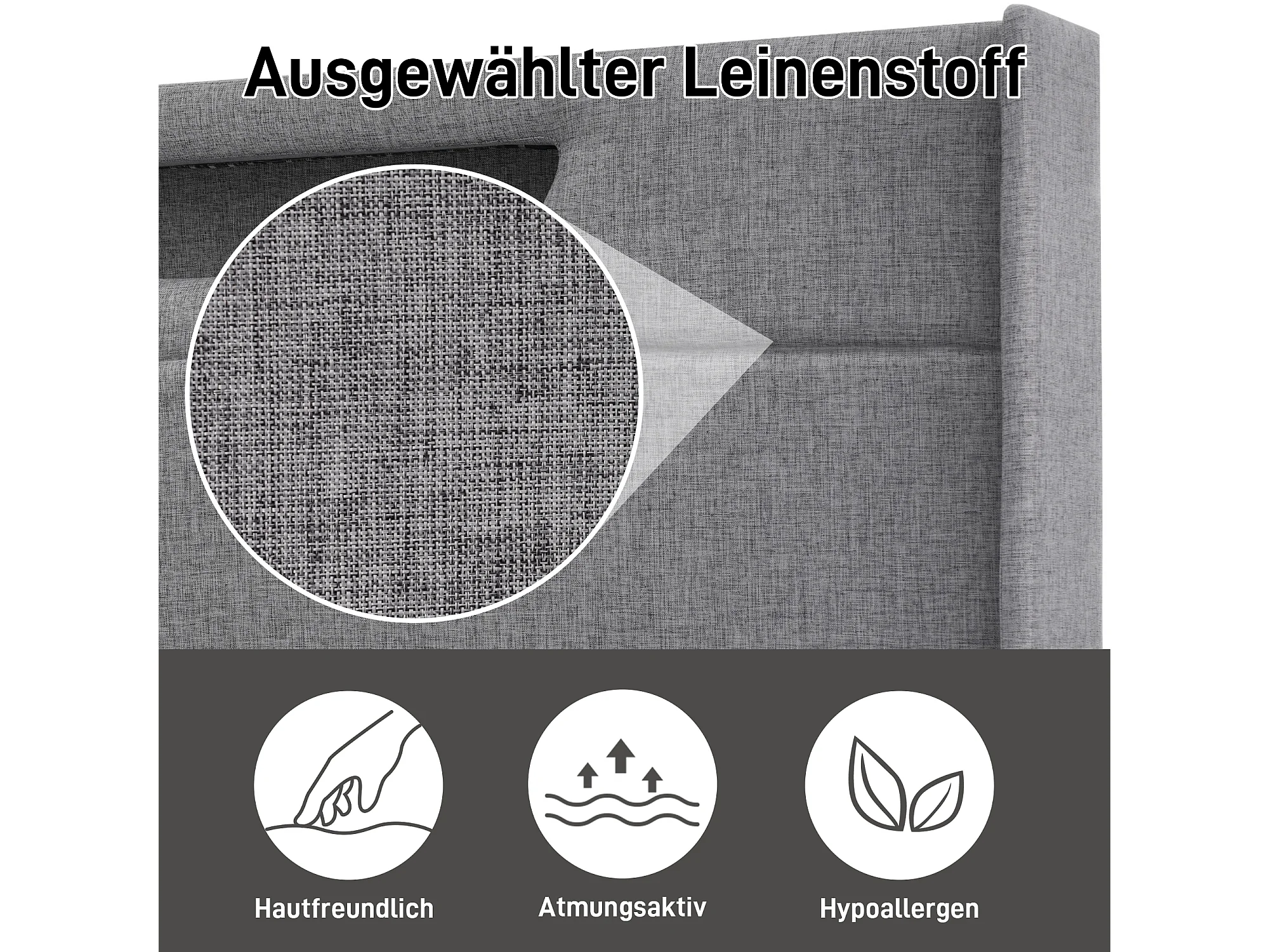 Lit double LED avec fonction chargeur USB Type C et éclairage, cadre en lin gris, rangement 160x200cm (168x212x109cm)