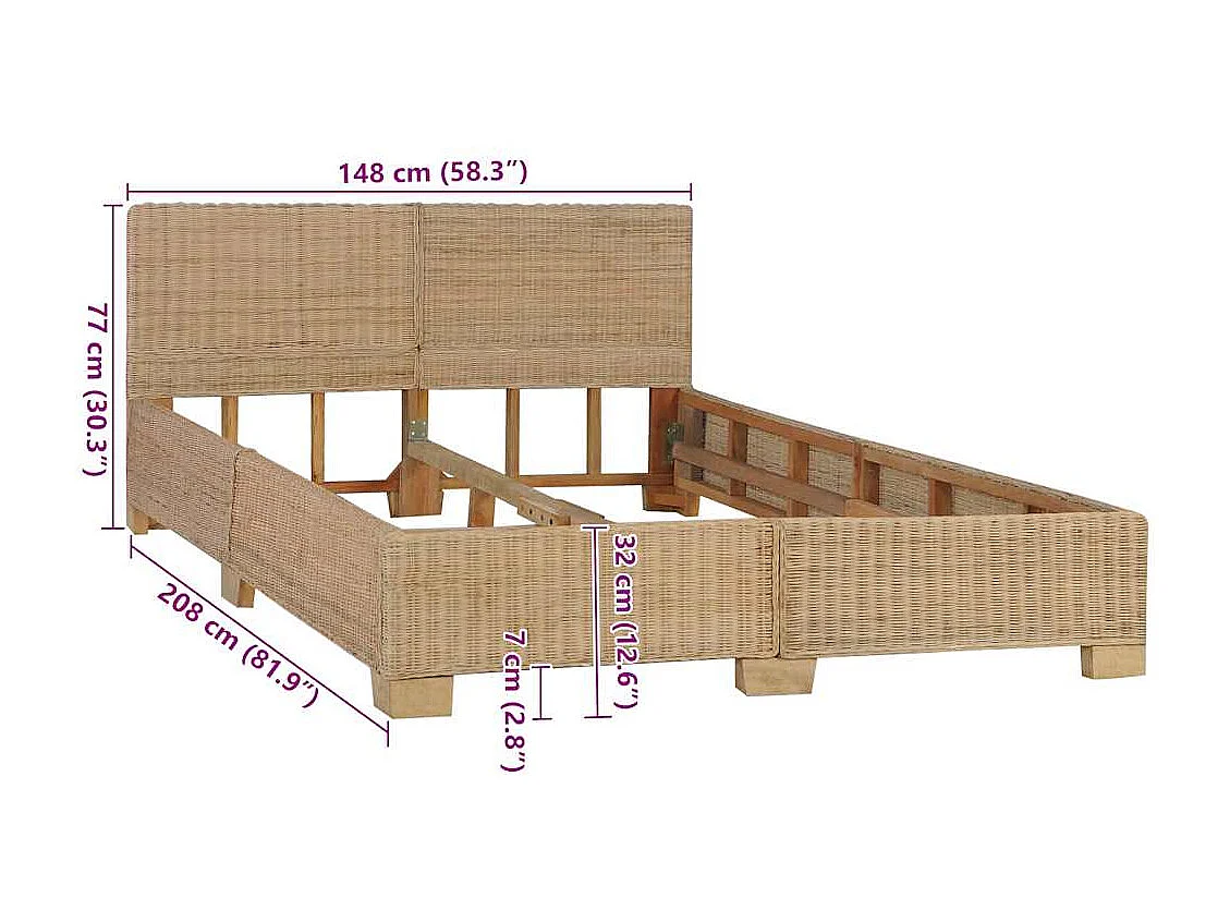 Lit double | Lit adulte | Cadre de lit avec tête de lit rotin véritable 140x200 cm