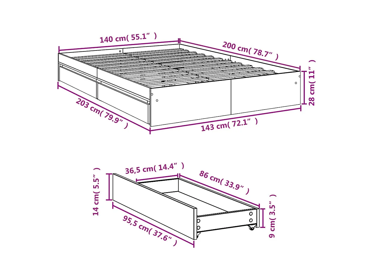 Lit double | Lit adulte | Cadre de lit avec tiroirs chêne sonoma 140x200 cm