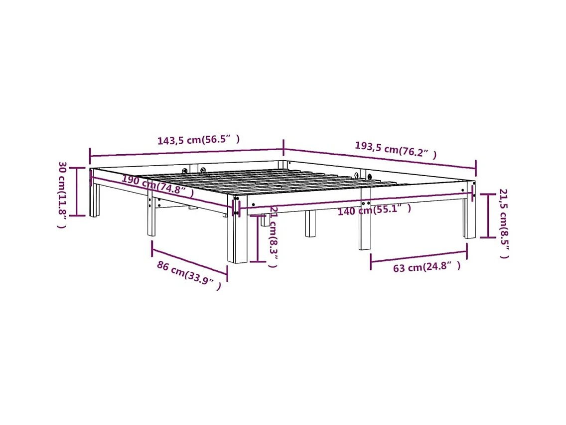 Lit double | Lit adulte | Cadre de lit blanc bois de pin massif 140x190 cm