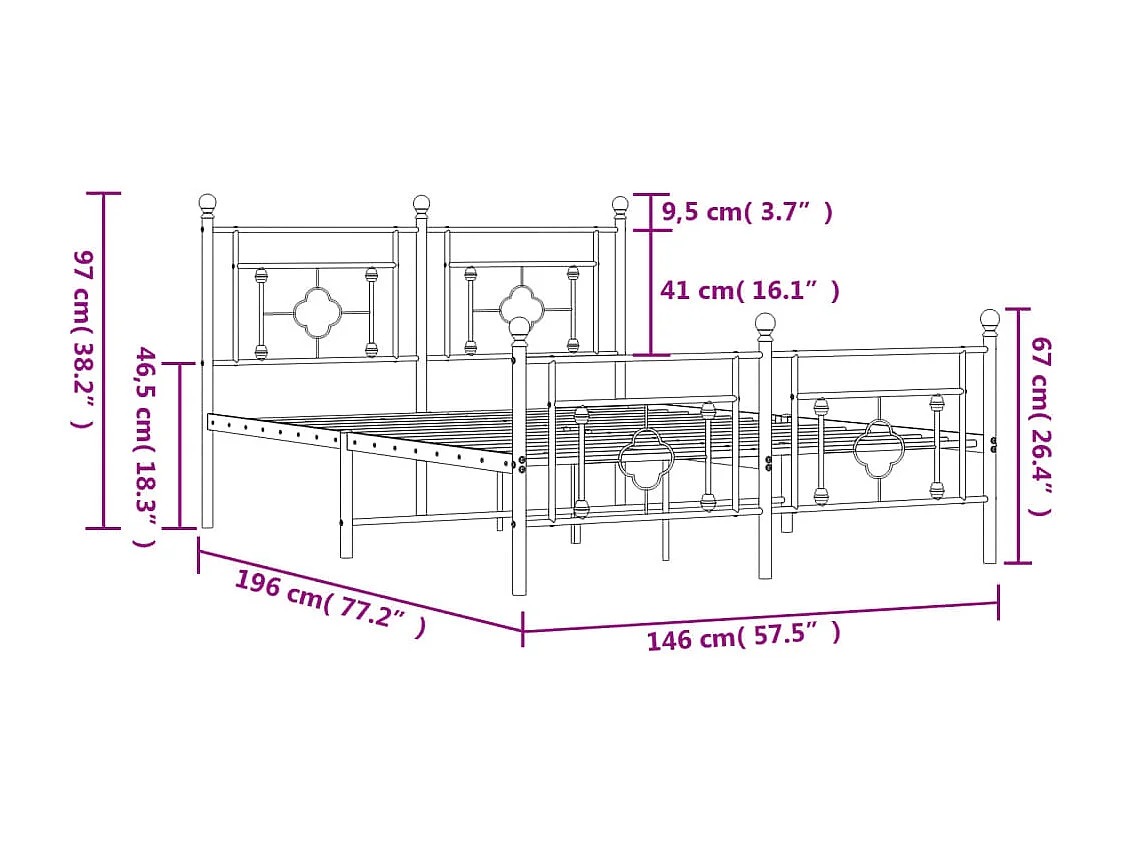 Cadre de lit métal sans matelas avec pied de lit noir 140x190cm