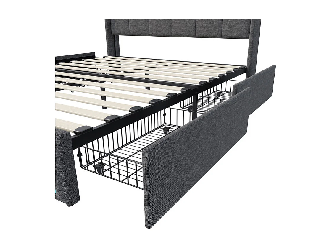 Lit double, lit adulte, lit avec tiroirs et rangement-180x200cm-LED RGB, prises USB-Rangement maximal, éclairage intelligent-Tissu lin respirant-Design moderne gris