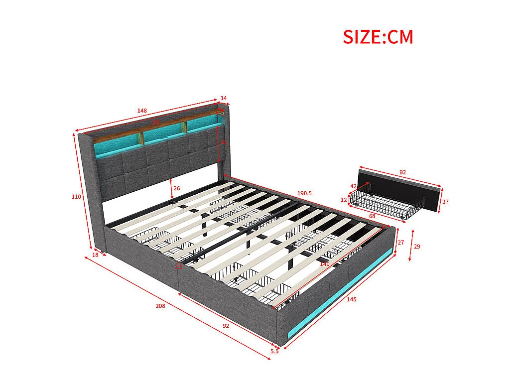 Lit double, lit avec tiroirs, lit avec rangement - 140x190cm - LED RGB, USB - Idéal petit espace - Tissu lin, design moderne - Couleur Gris