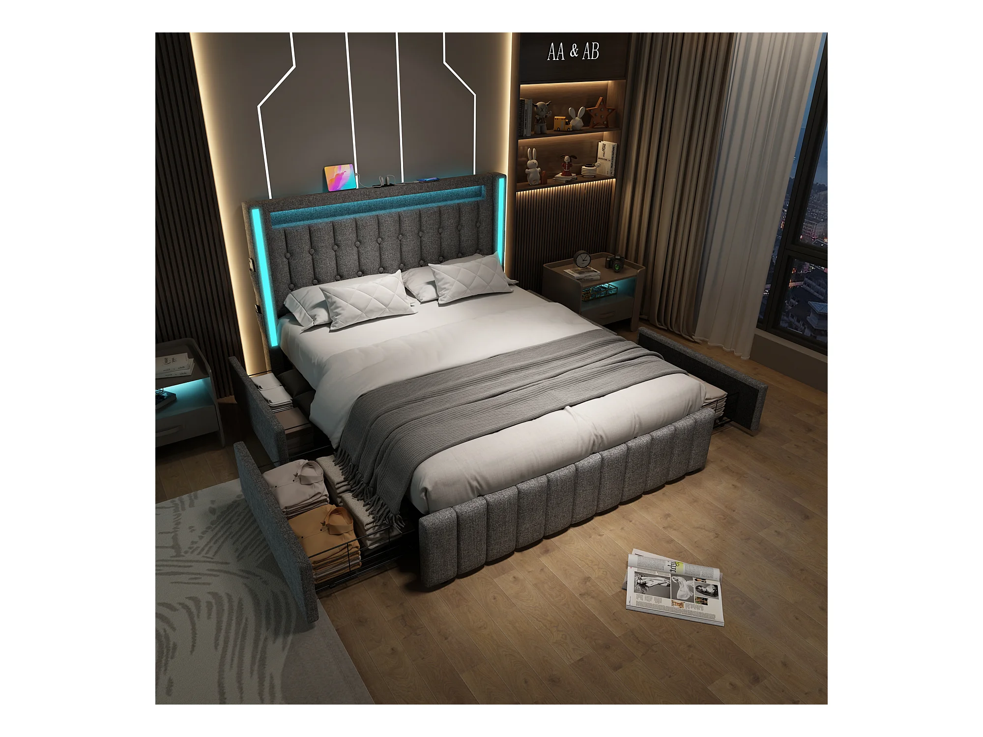 Lit double 160x200 cm - Lin gris - avec LED et chargement USB - 4 tiroirs - sans matelas
