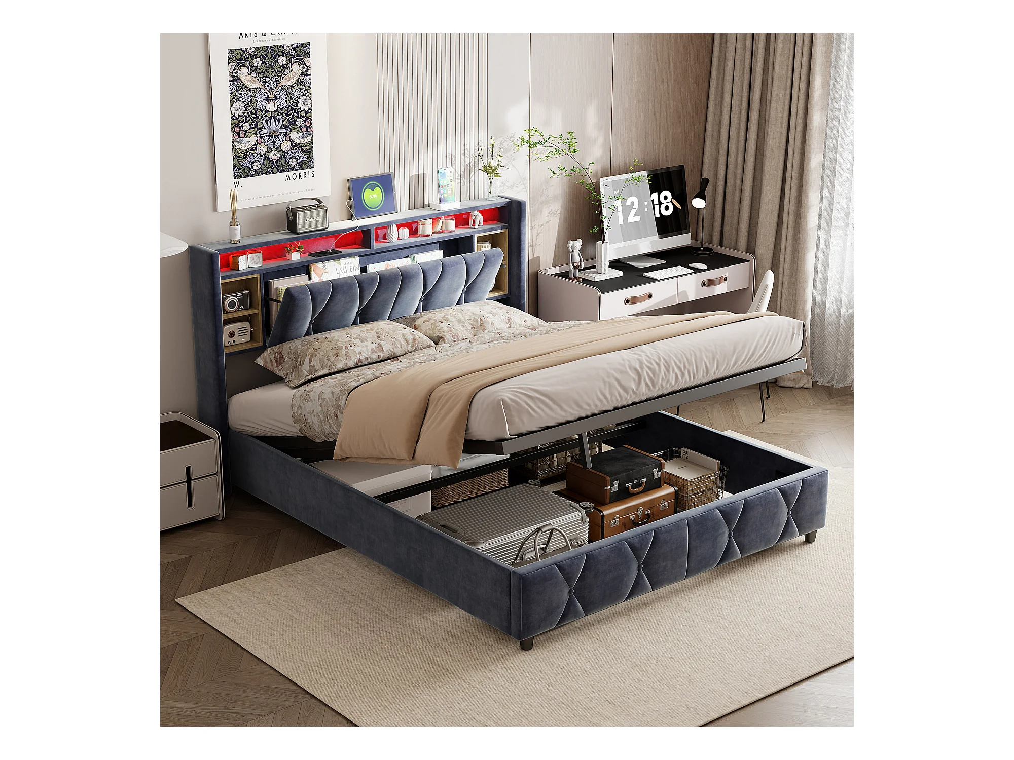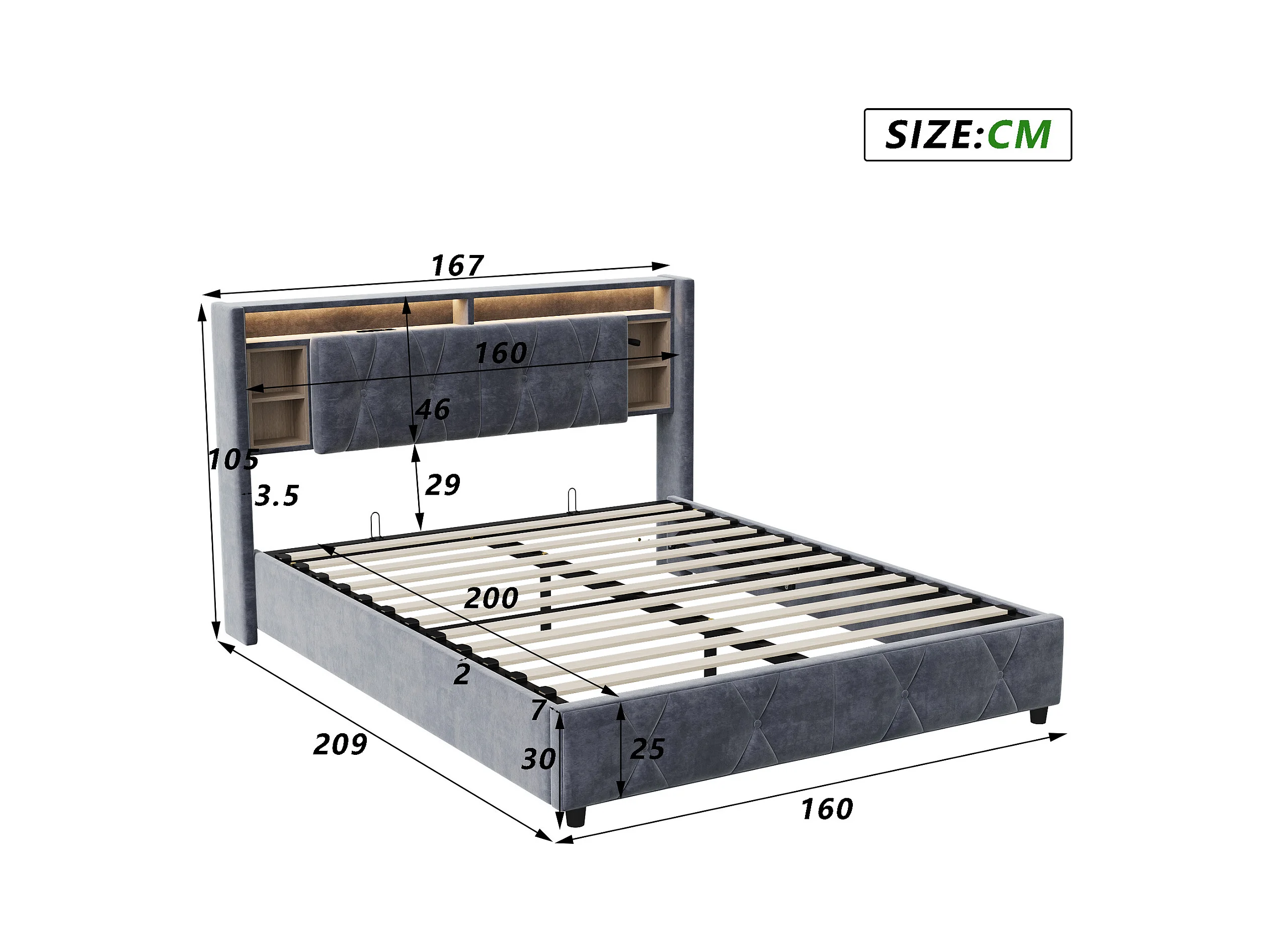 Lit Double, Lit Rembourré, Lit 160x200cm, Cadre de Lit, Lit Coffre ,avec Sommier LED et USB, avec Rangement sous Lit, Velours, Gris (sans Matelas)