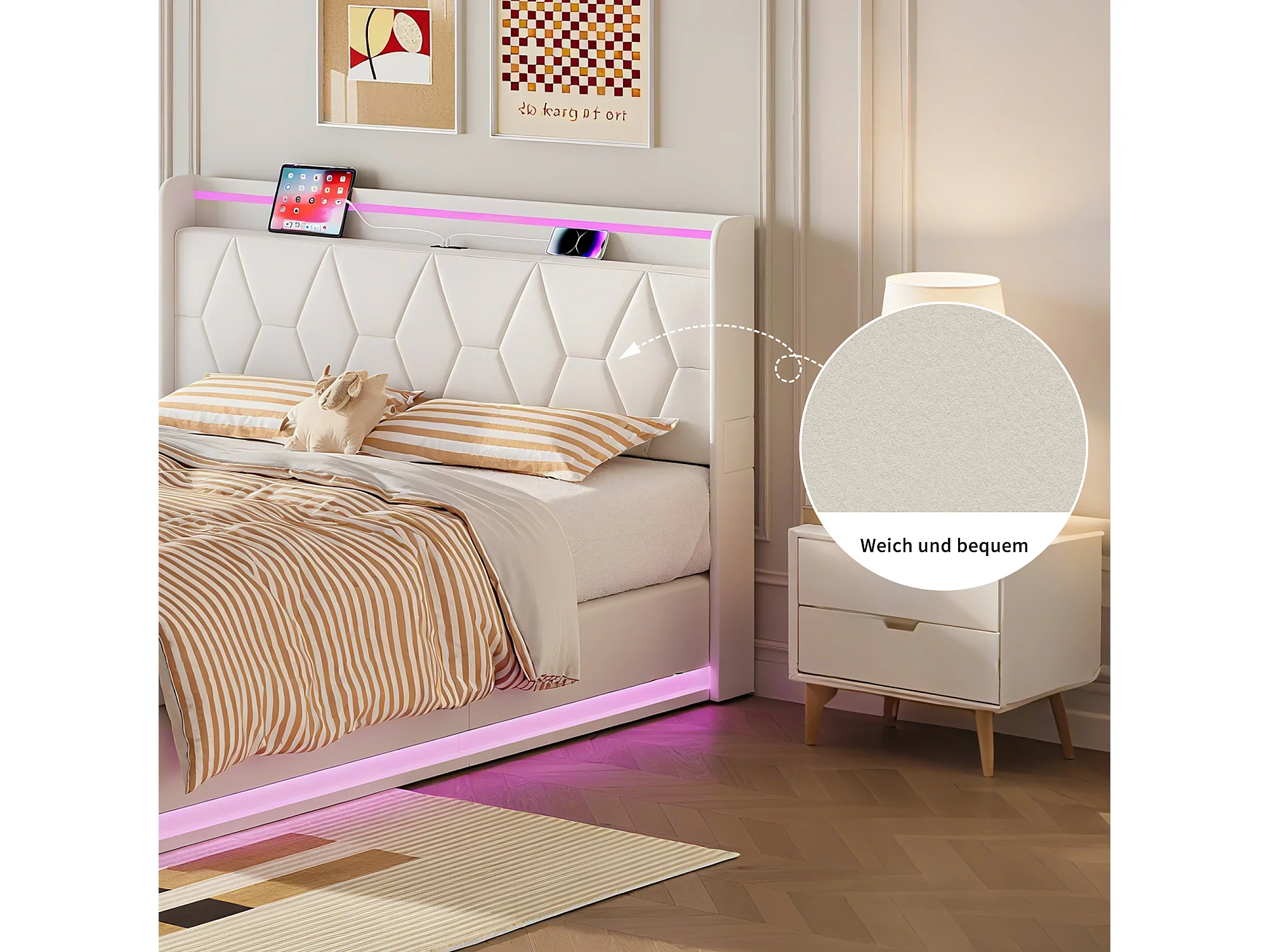 Lit double moderne 140×200 cm en velours blanc avec tête rembourrée, LED, port USB et coffre avec vérins hydrauliques
