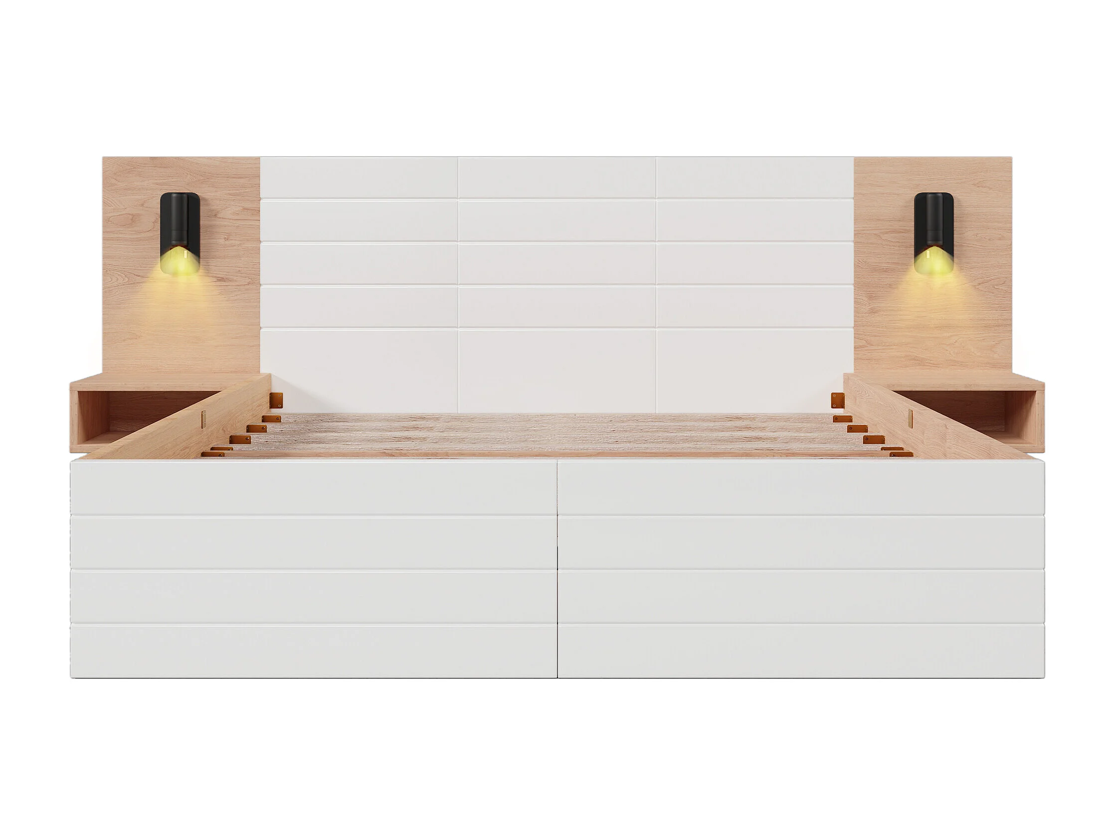 Lit double moderne 140×200cm avec 2 tiroirs, lampe de lecture et port USB, chevet, en bois blanc, sans matelas