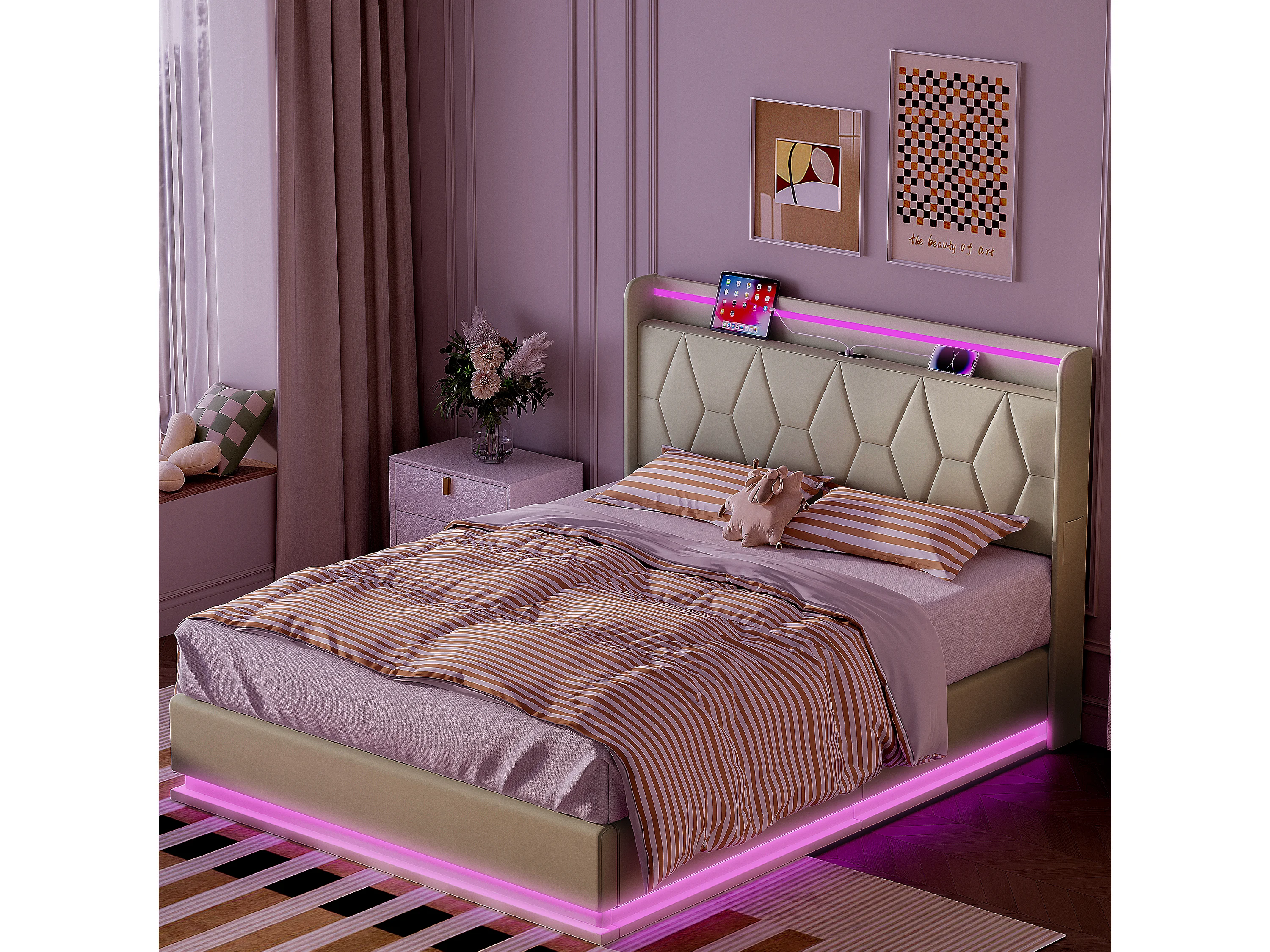 Lit double moderne 160×200 cm avec tête de lit rembourrée en velours blanc, éclairage LED, port USB et coffre de rangement avec vérins hydrauliques