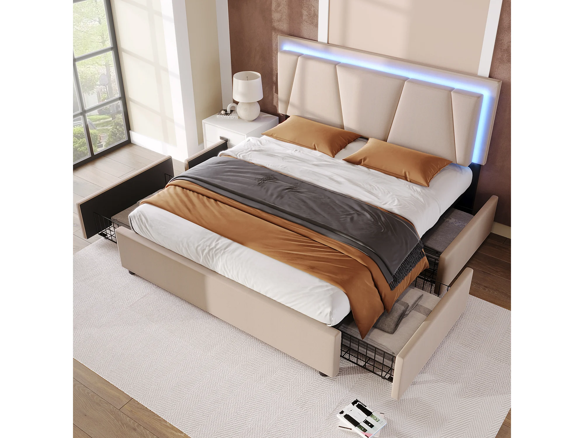 Lit double rembourré 140x200 cm avec LED, 4 tiroirs, tête réglable, sommier bois, tissu beige, avec matelas