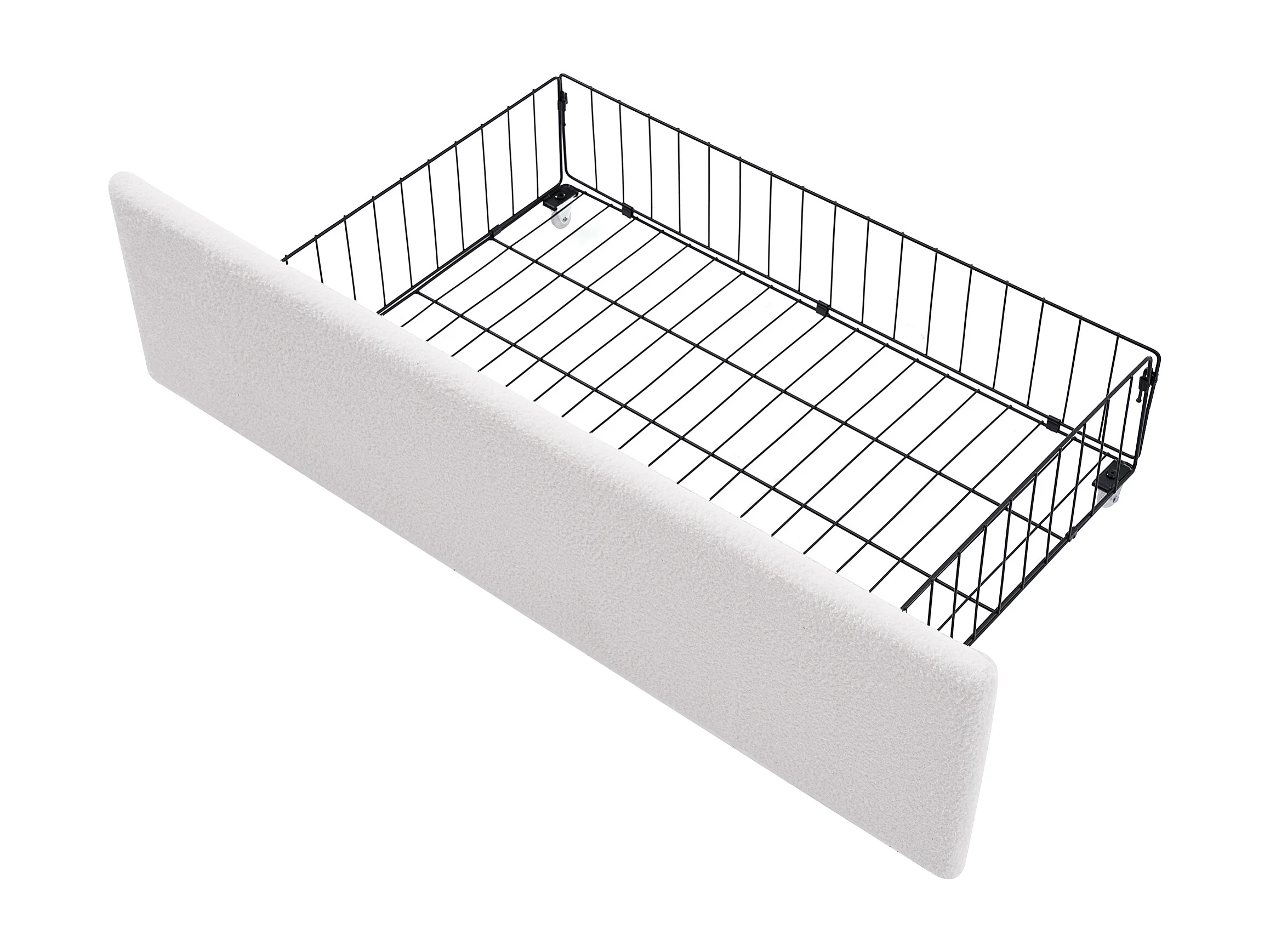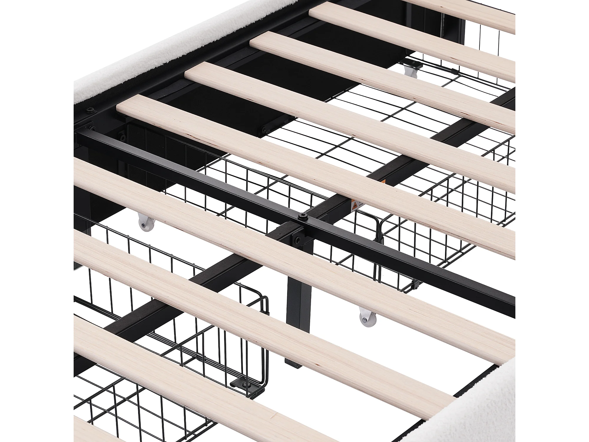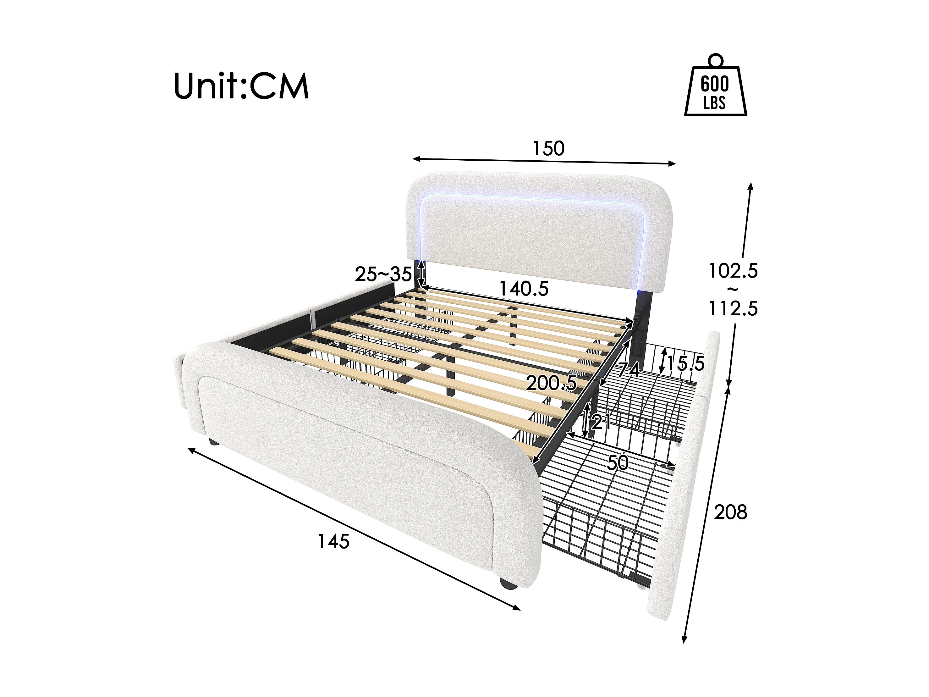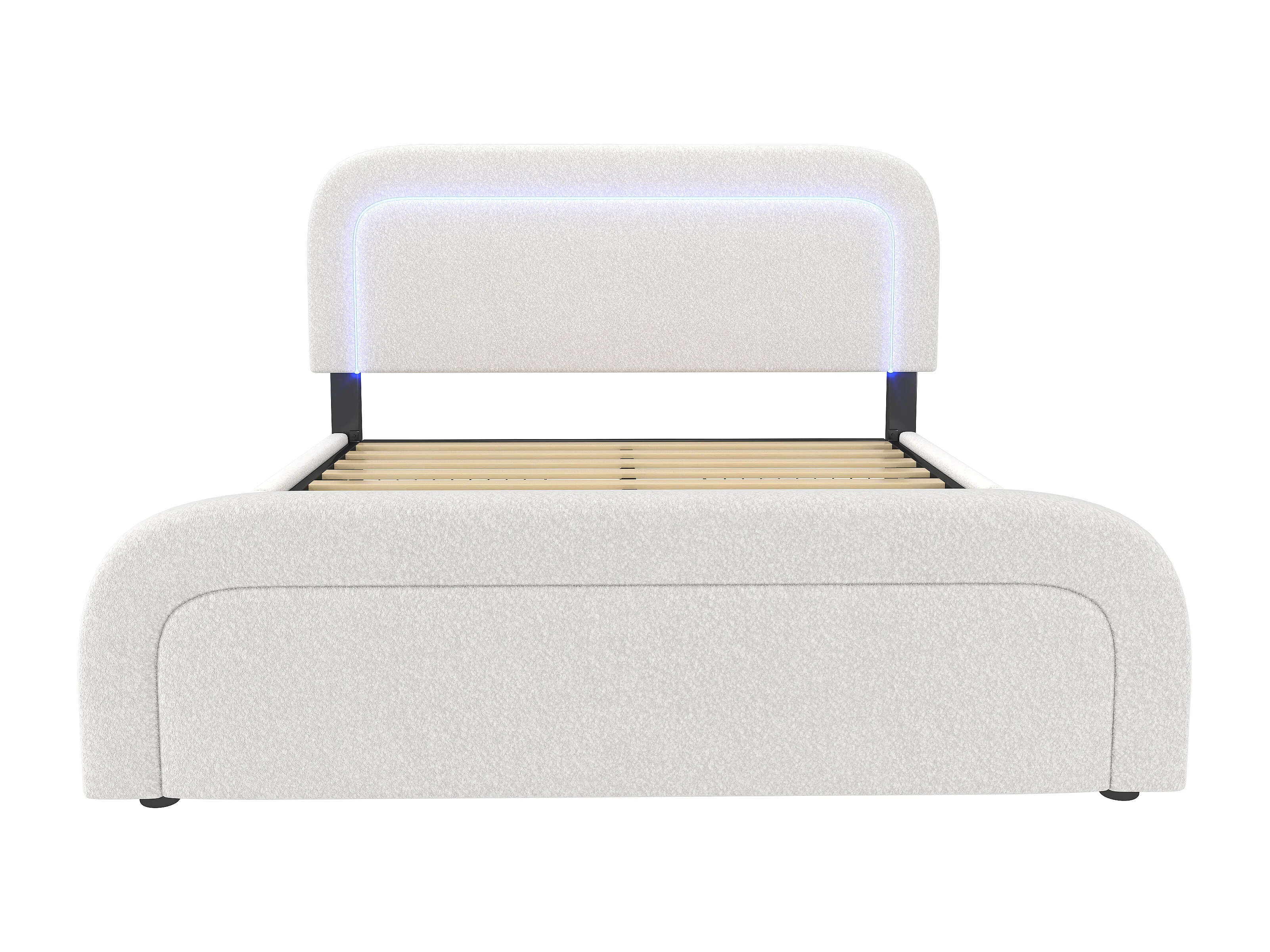 Lit double 140x200 cm - Lit adulte avec LED et USB - Tissu Sherpa blanc - 4 tiroirs
