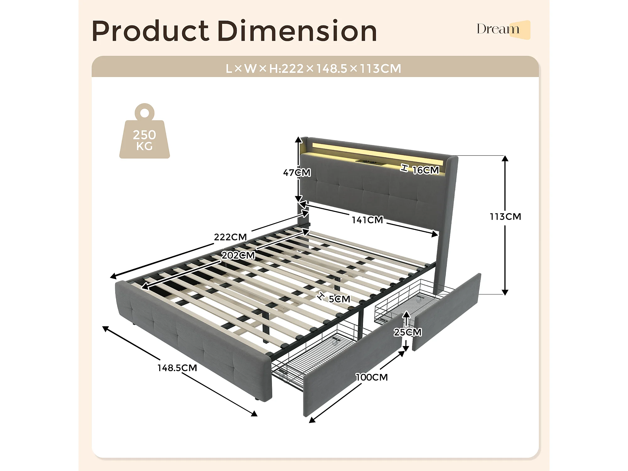 Lit double rembourré 140x200 cm Lit adulte avec lit gigogne éclairage LED 2 tiroirs ports USB et sommier à lattes - gris
