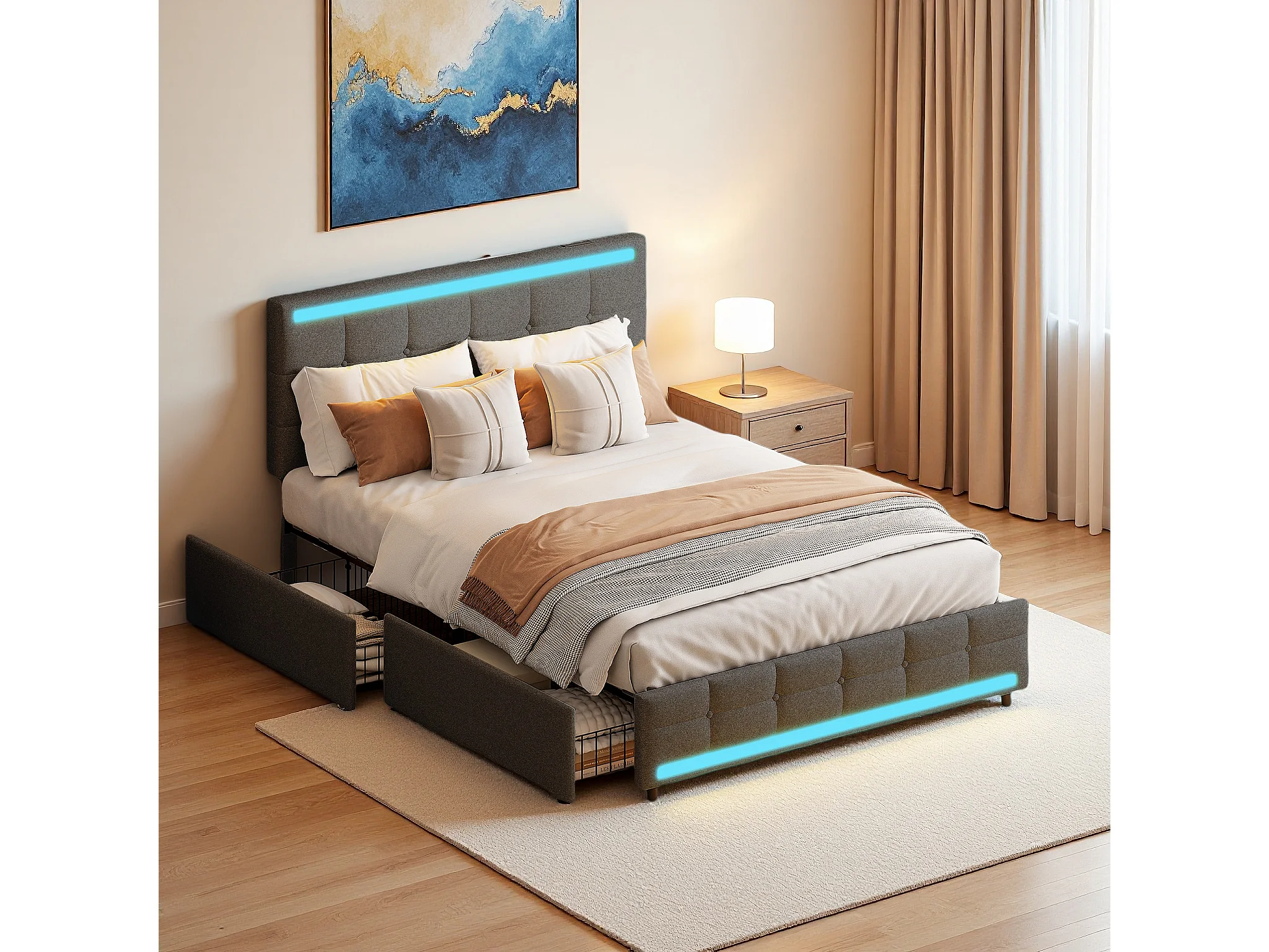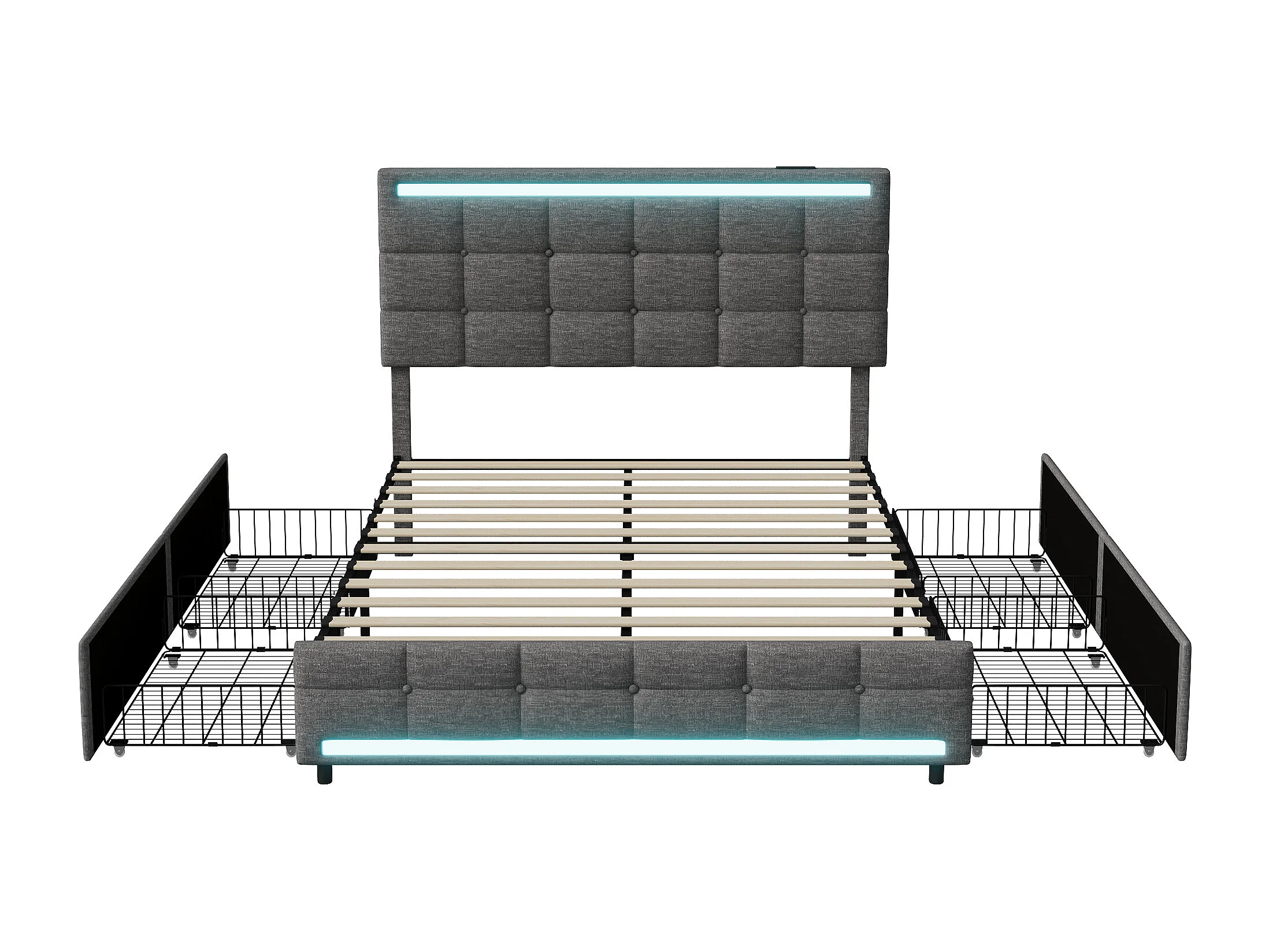Lit double rembourré 140x200 – Structure avec LES, 2 stations de charge USB, 4 tiroirs et sommier à lattes, tête de lit réglable, tissu de lin, gris