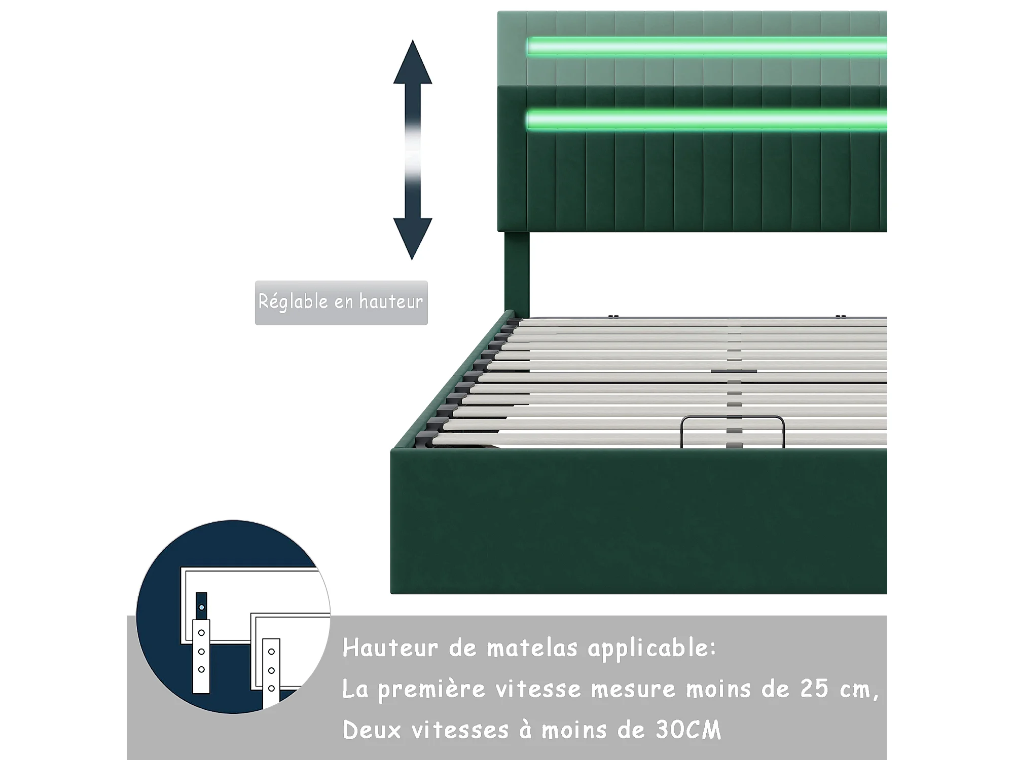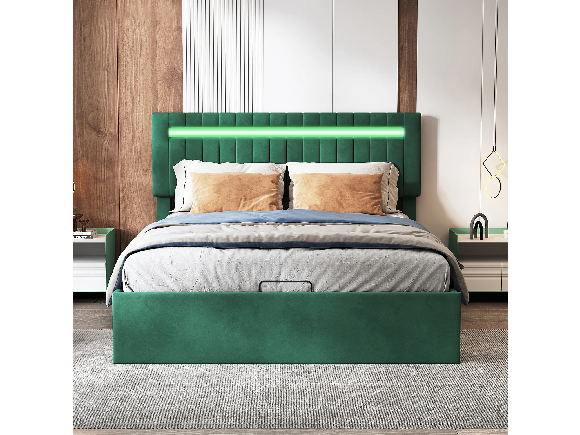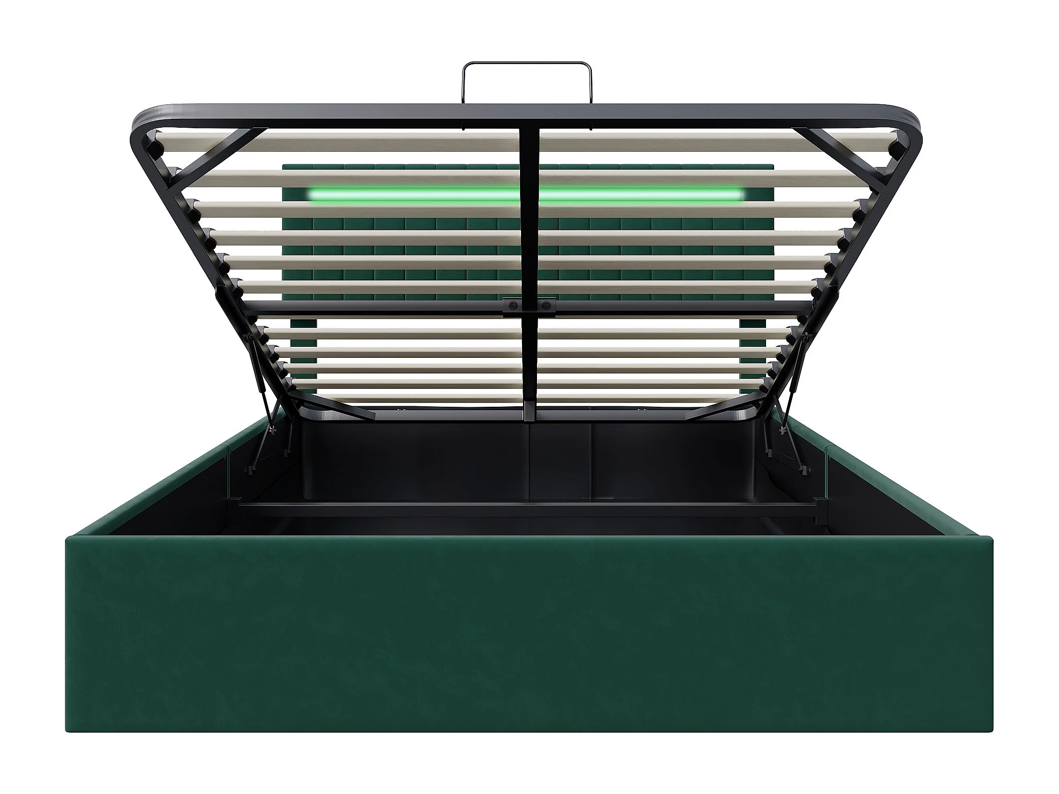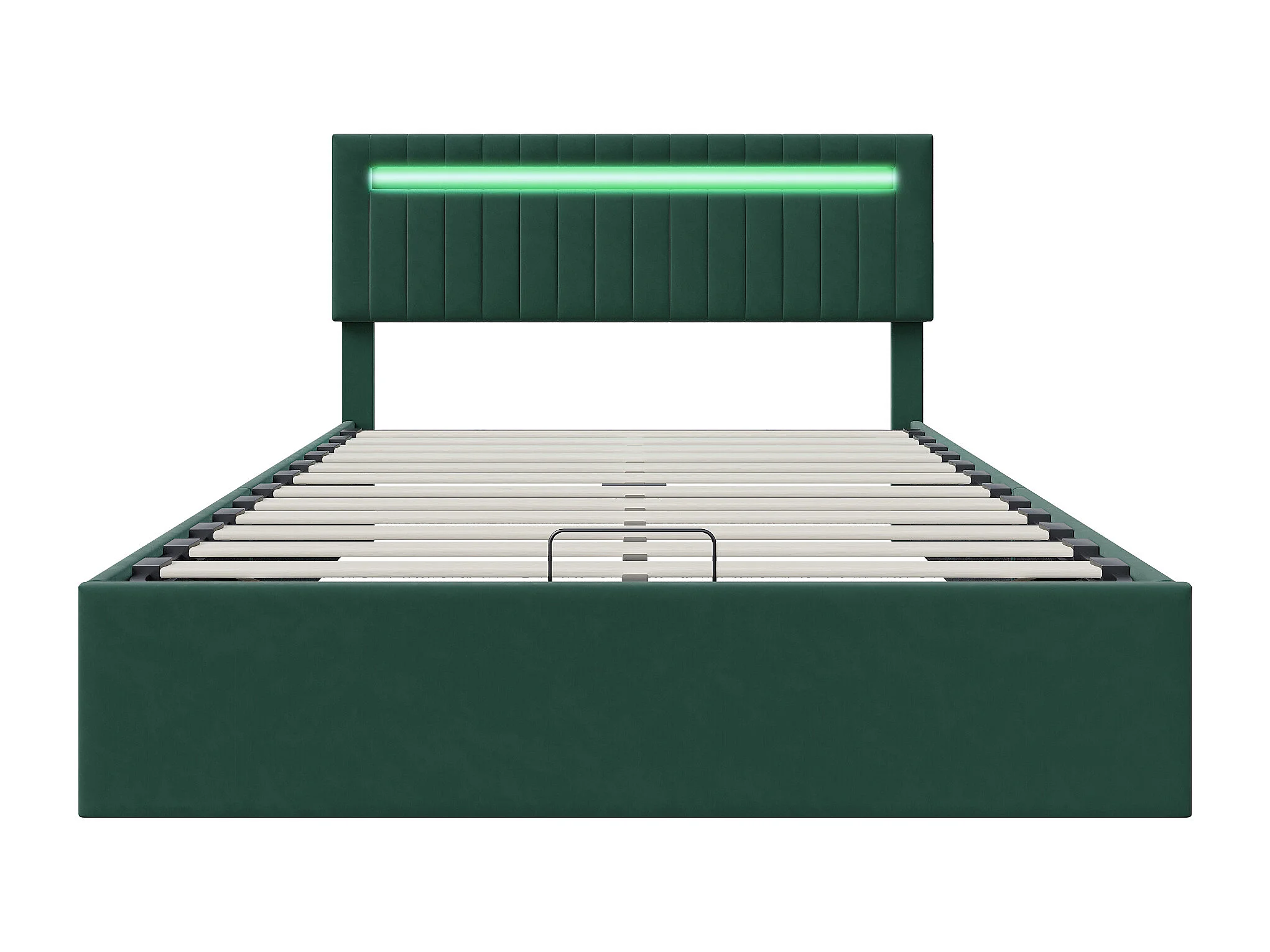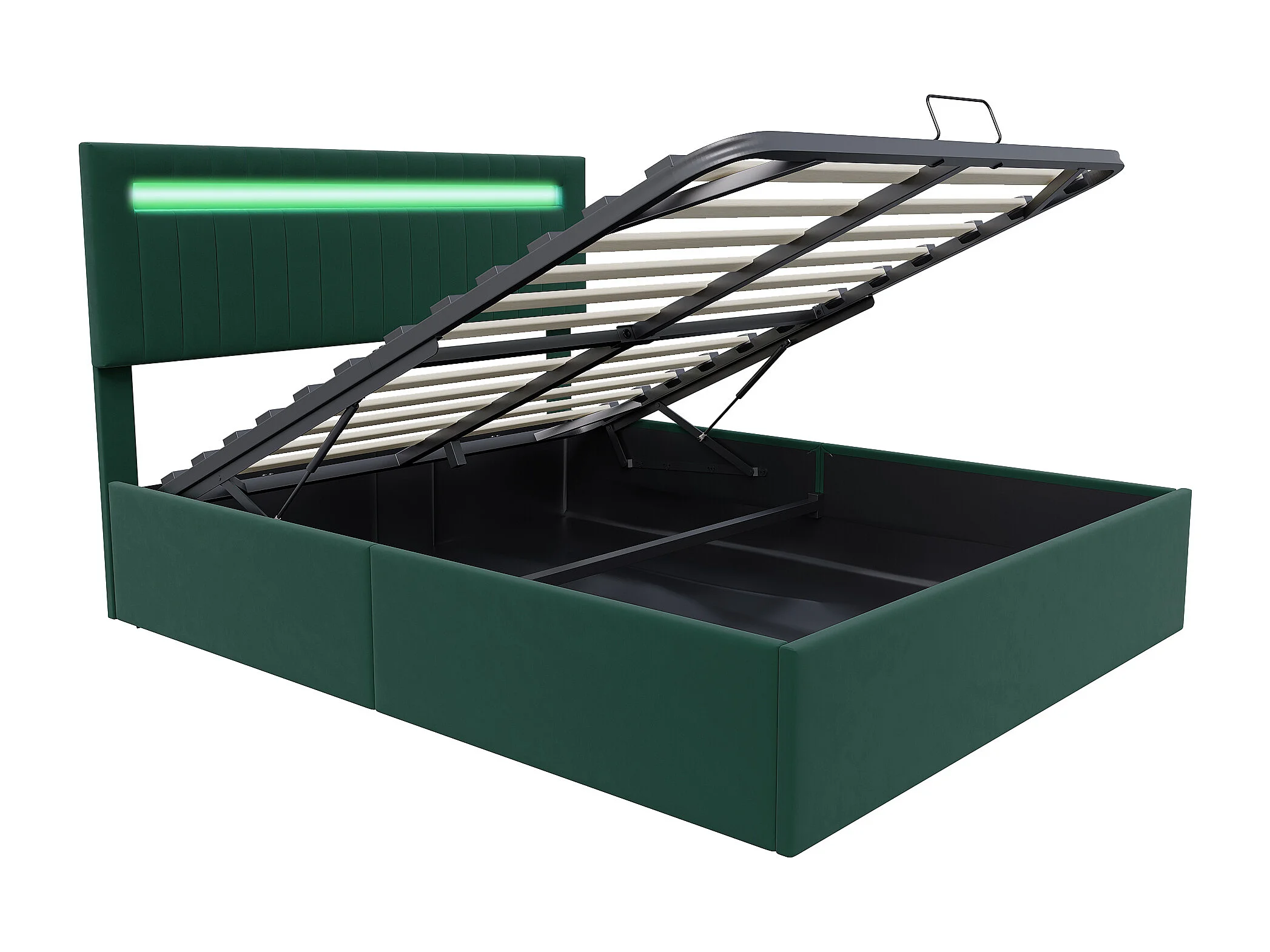Lit double rembourré, 160 x 200 cm, avec LED et sommier à lattes, espace de rangement, velours, vert