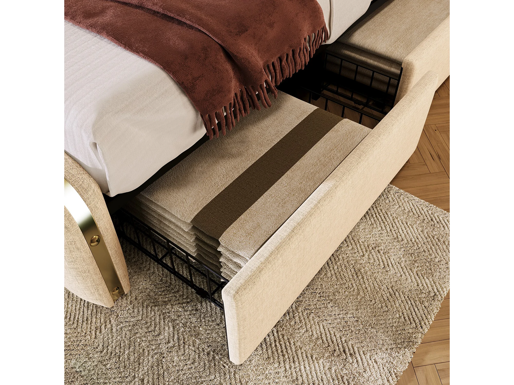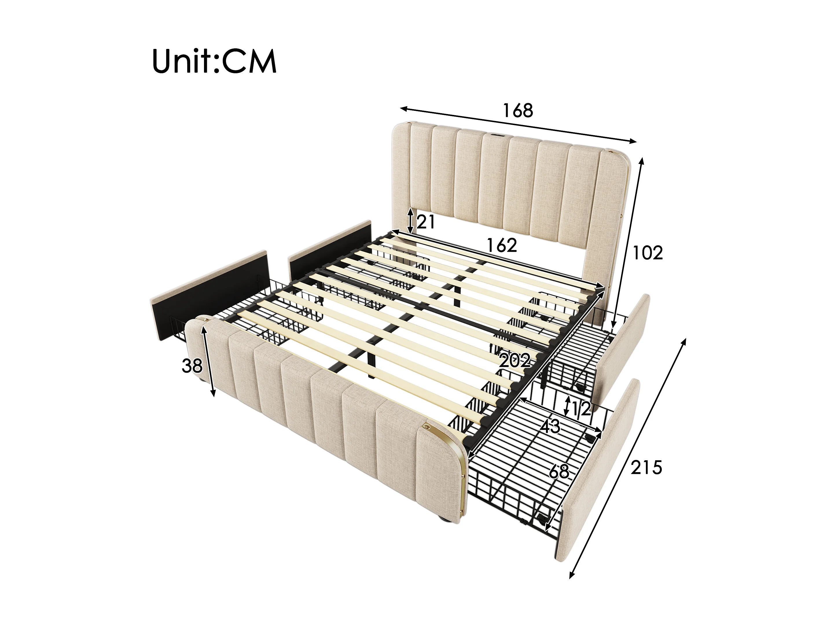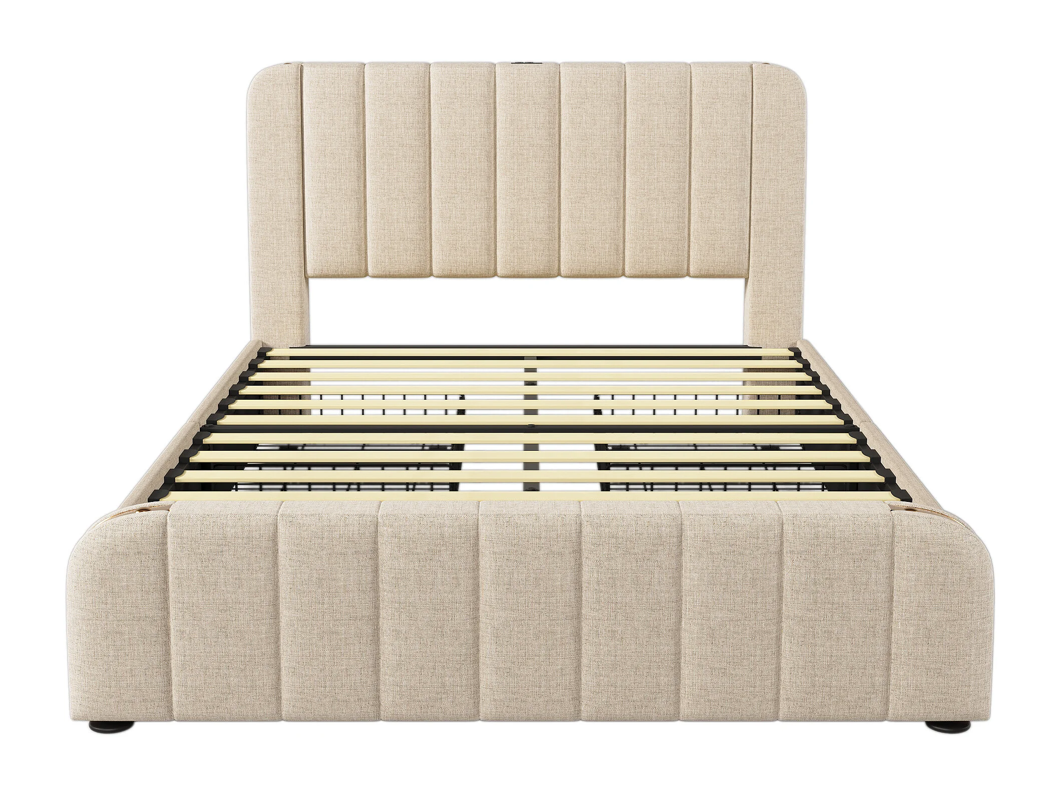 Lit double 160x200 cm - Lin adulte beige - avec chargement USB Type-C - 4 tiroirs - sans matelas
