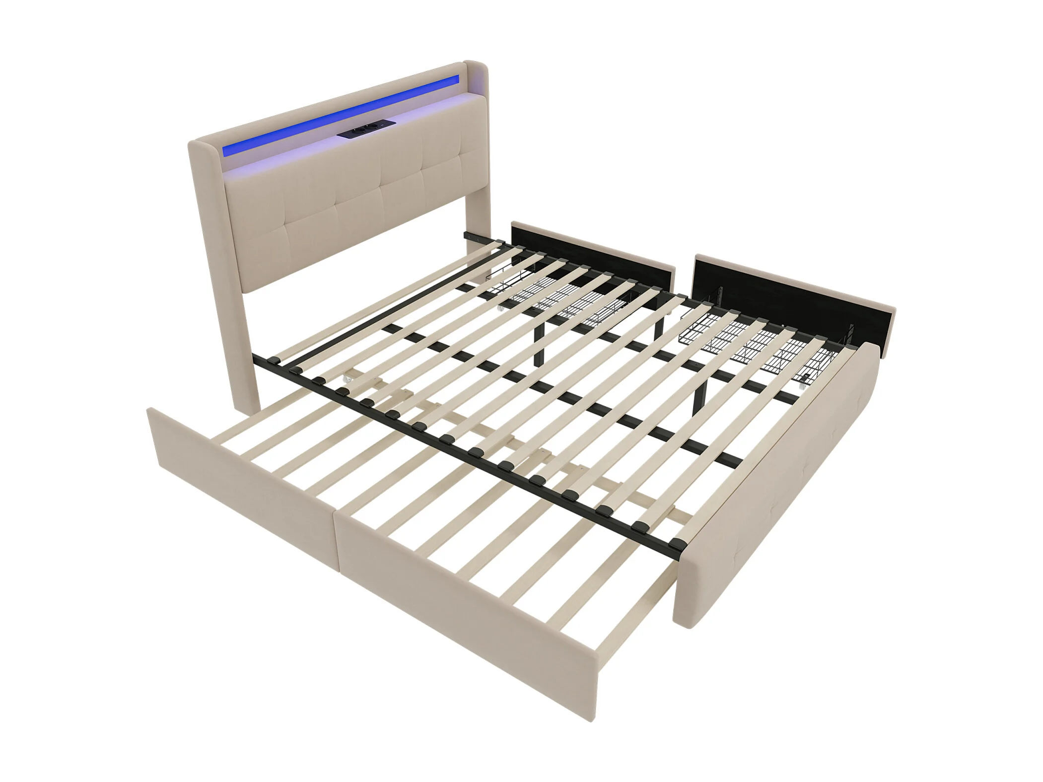 Lit double rembourré 160x200 cm Lit adulte avec lit gigogne éclairage LED 2 tiroirs ports USB et sommier à lattes - beige